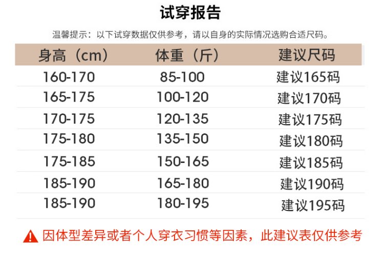 China (cm) 165 / 88-90 170 / 96-98 175 / 108-110 180 / 118-122 185 / 126-130