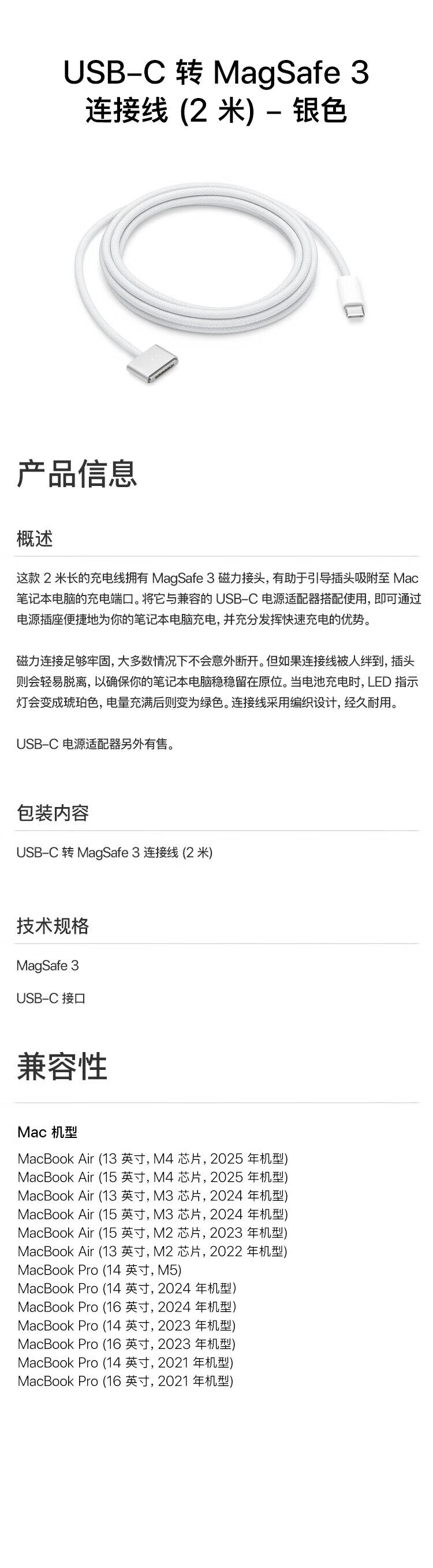 Apple/Apple USB-C to MagSafe charging cable 2 meters Apple computer charging cable magnetic charging Mac charging cable suitable for Apple notebook macbook