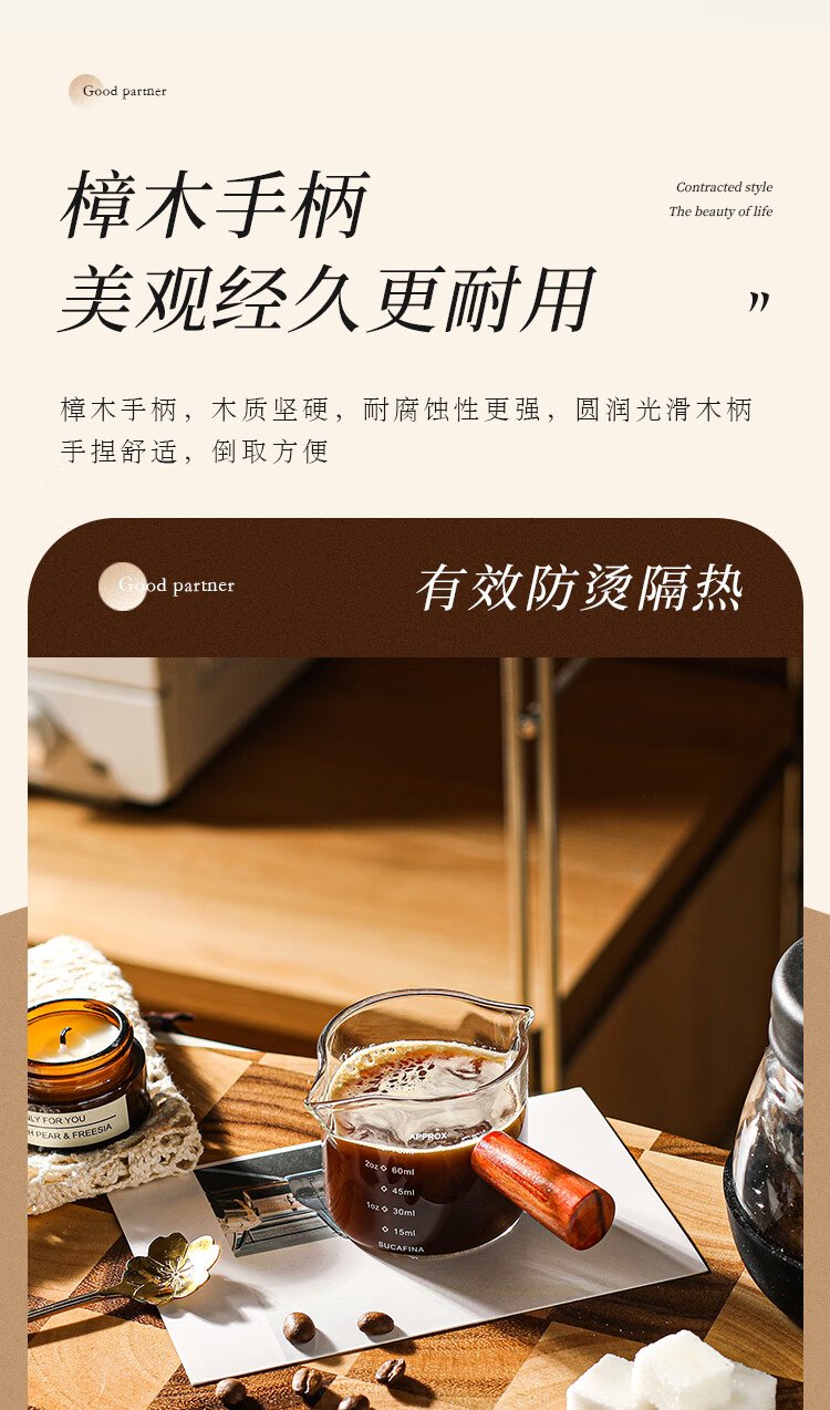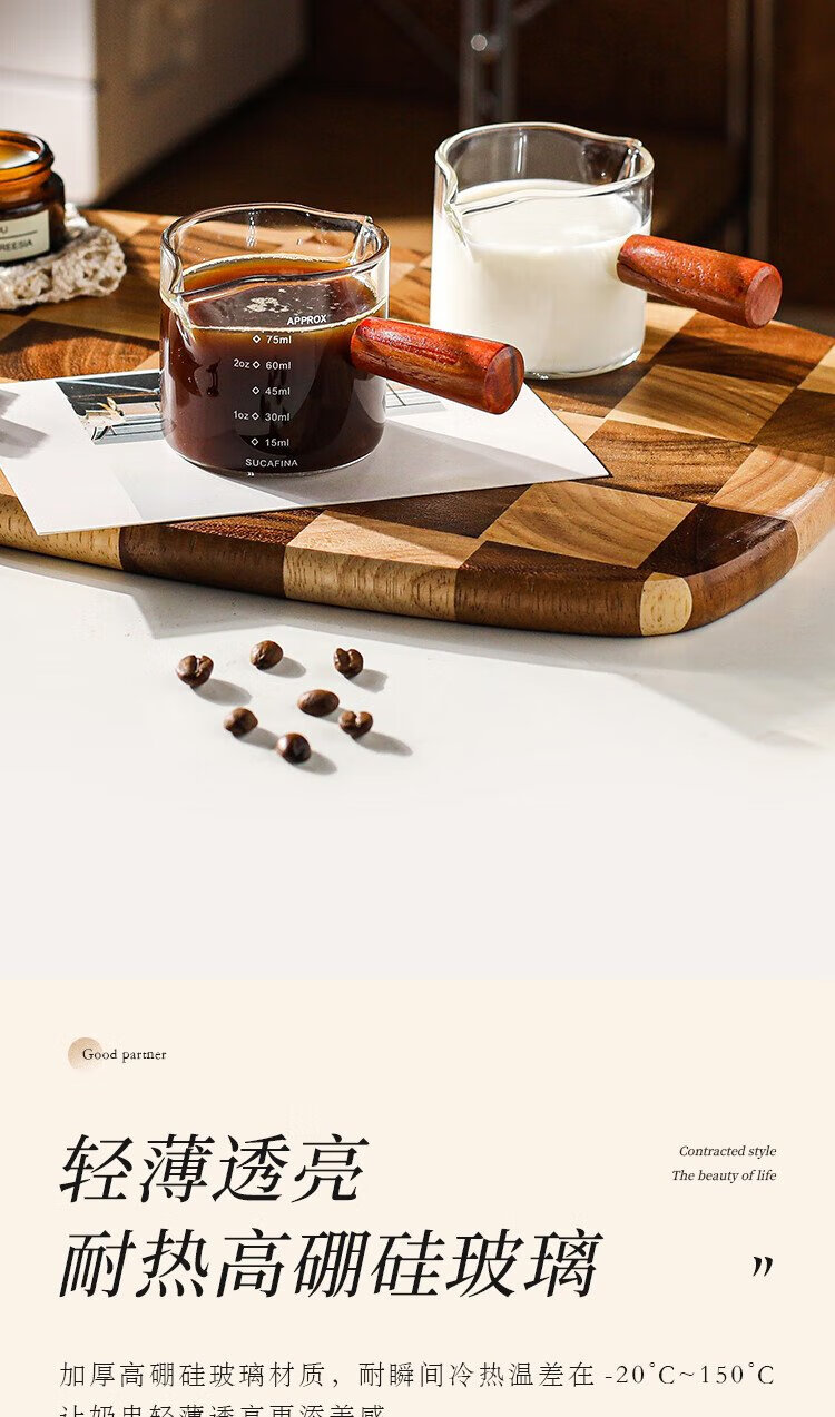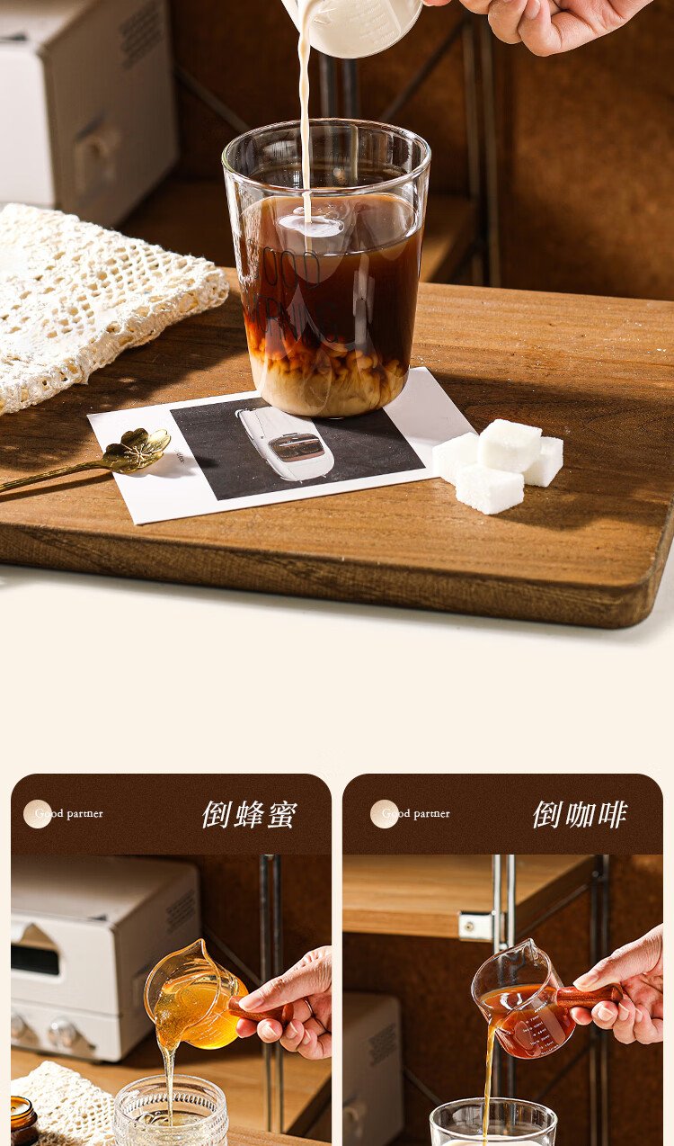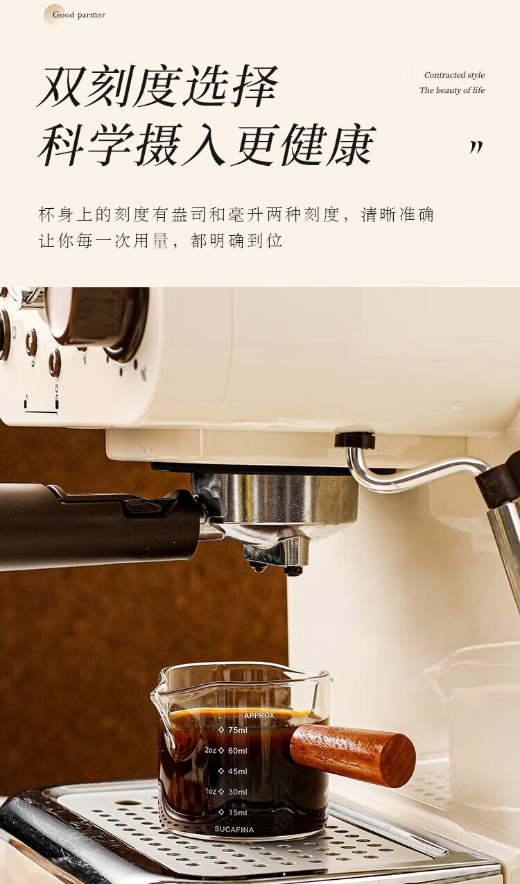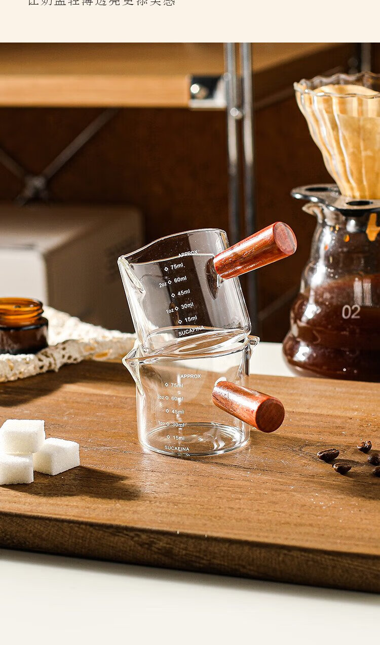 PINYU coffee measuring cup glass with double scale espresso extraction cup double diversion port wooden handle small milk cup