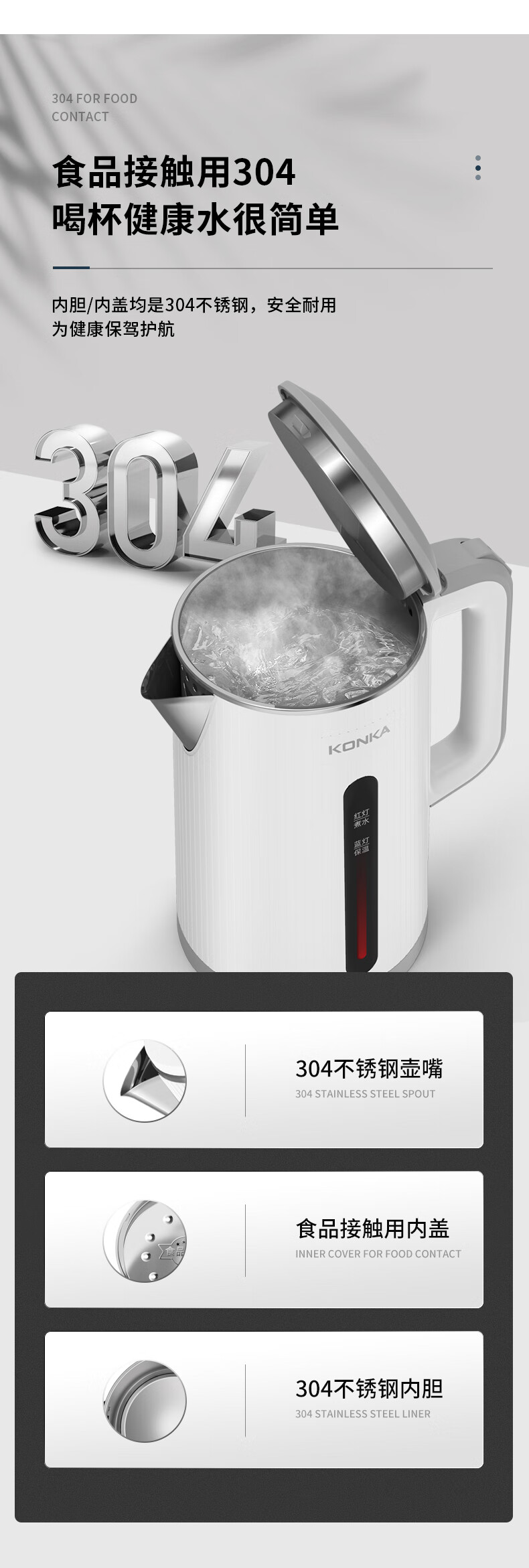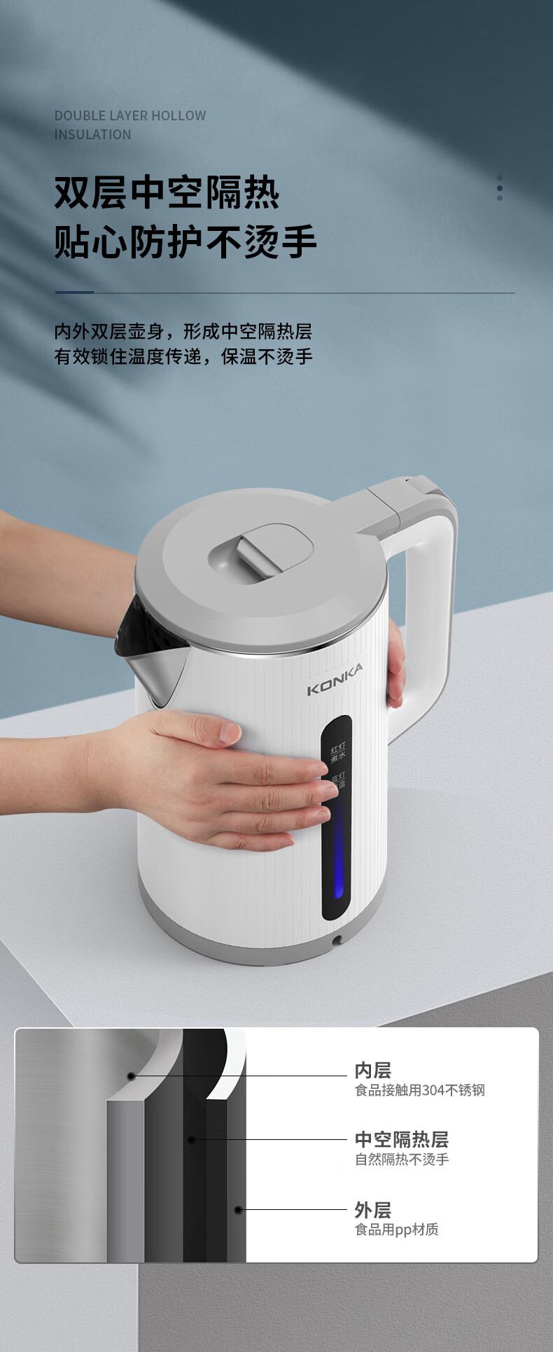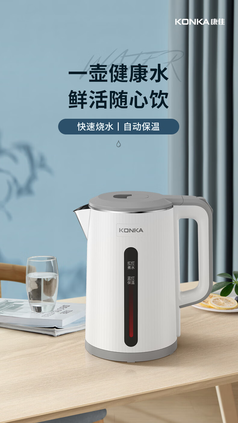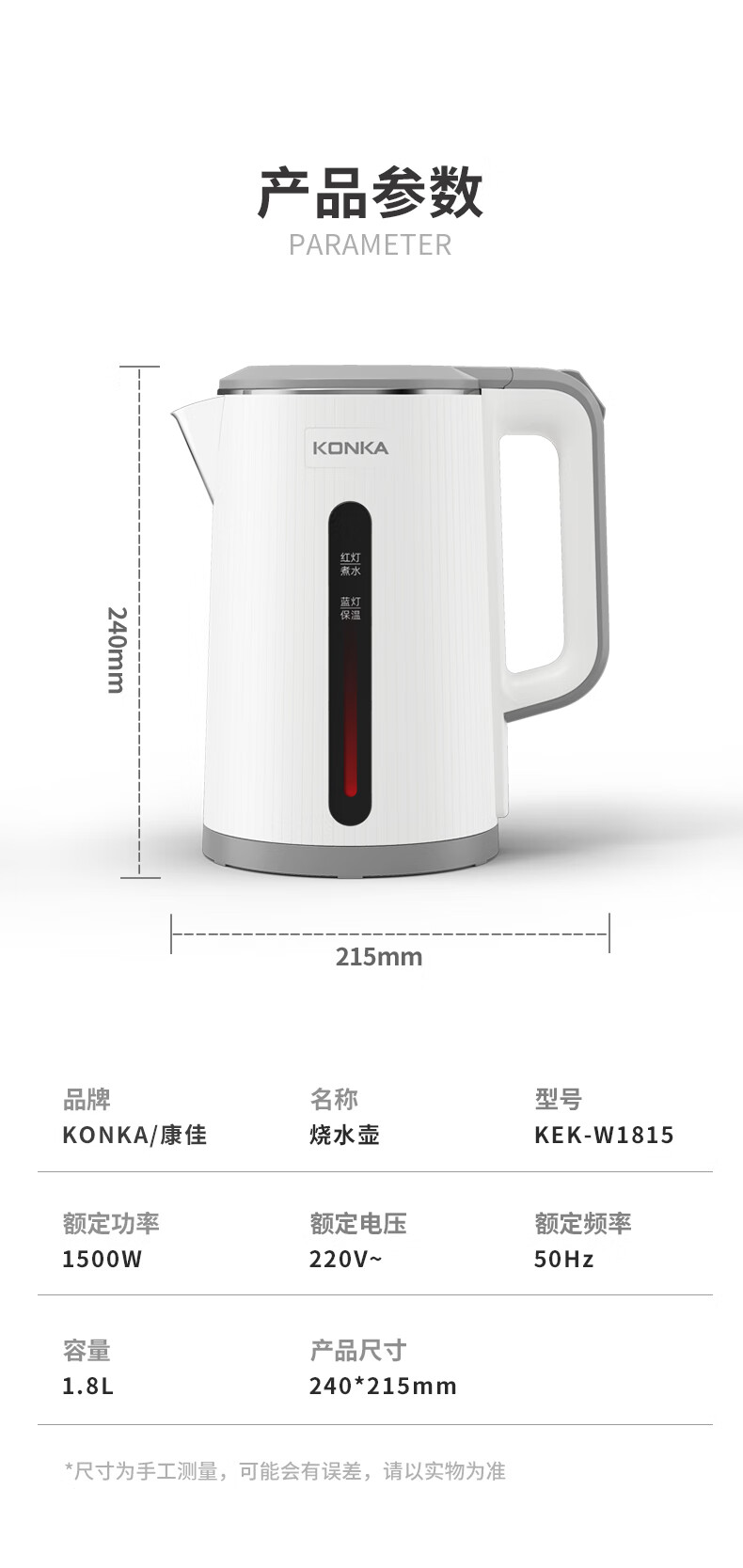 KONKA electric kettle 304 stainless steel double-layer anti-scald 1.8L large capacity thermal insulation kettle warm kettle kettle electric water bottle KEK-W1815