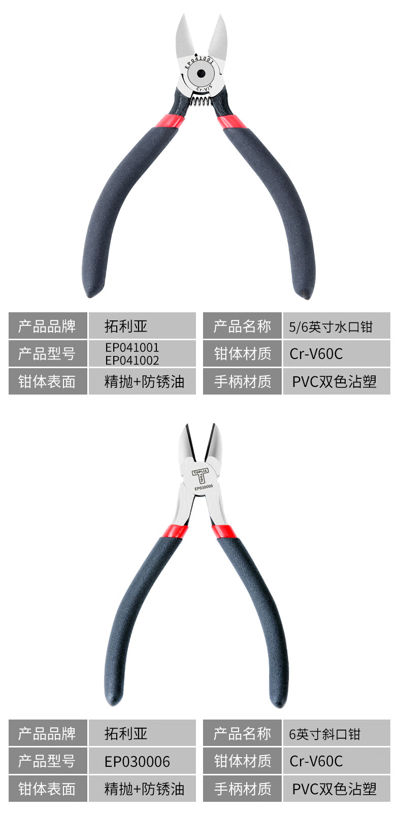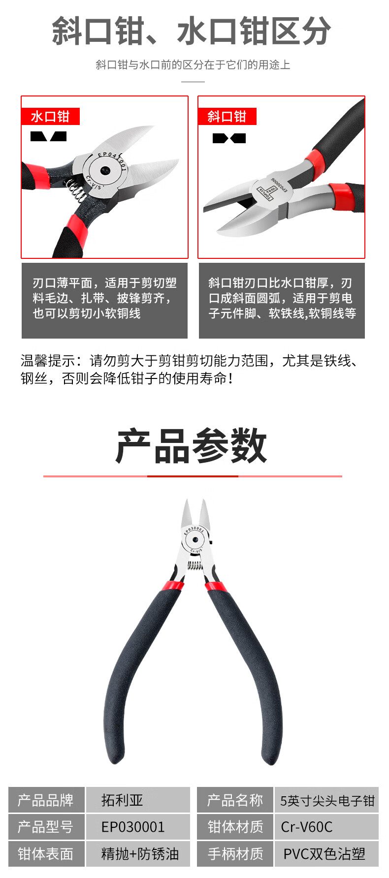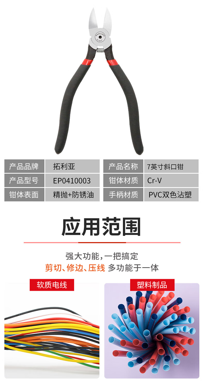 拓利亚大斜角薄刀水口钳7英寸水口钳子模型电工剪斜咀钳 EP041003