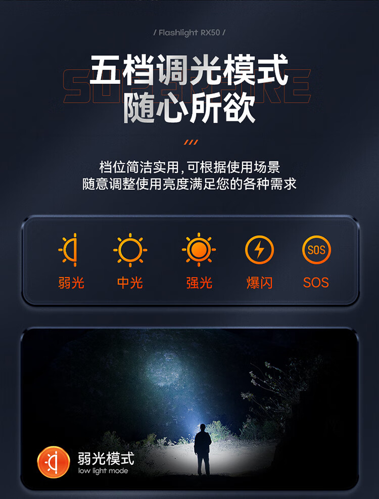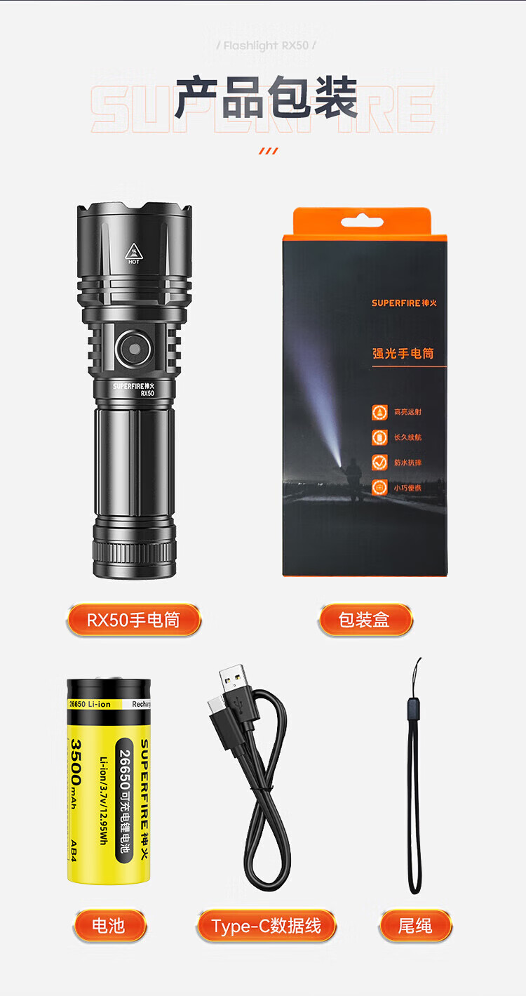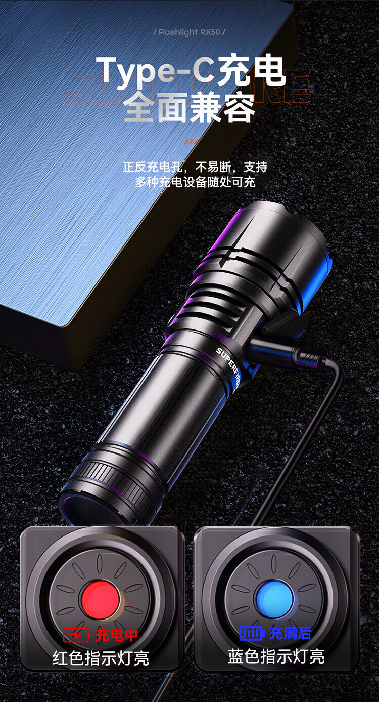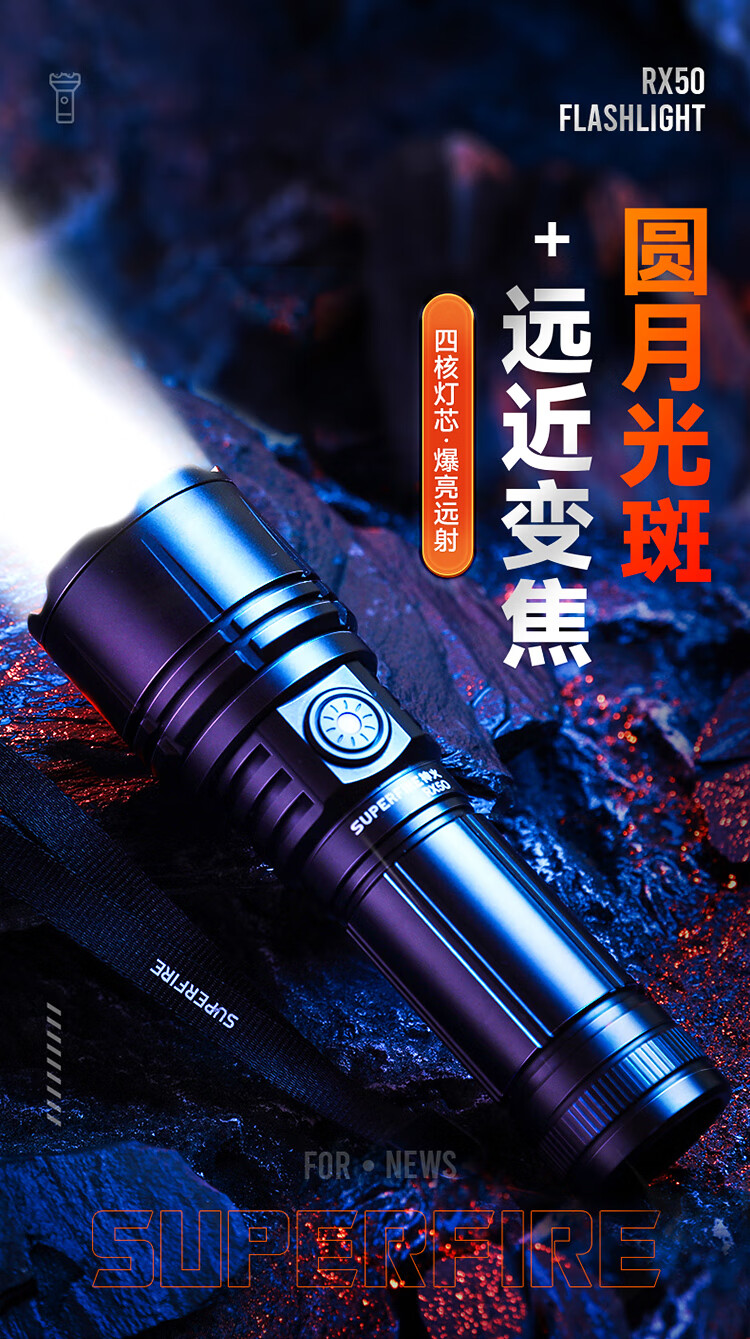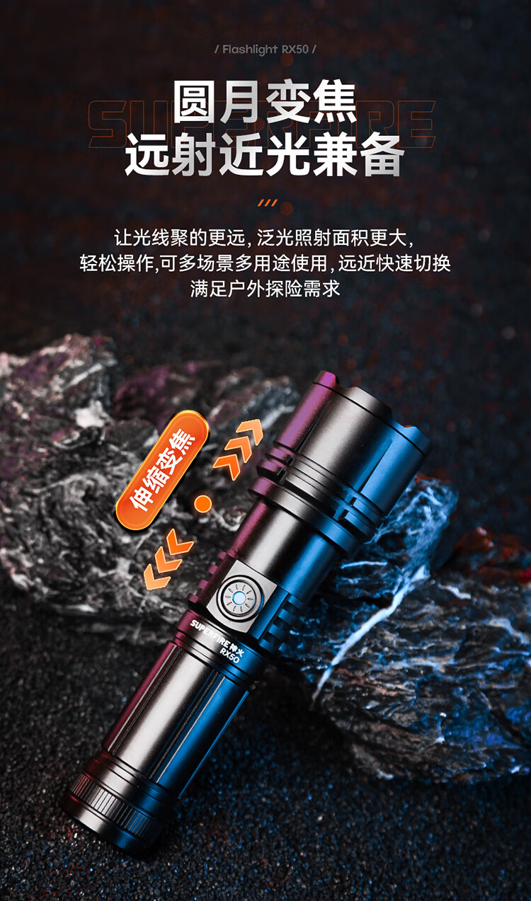 SupFire RX50 flashlight, strong light, zoom, ultra-bright, long-lasting, portable military long-range outdoor emergency light for home riding
