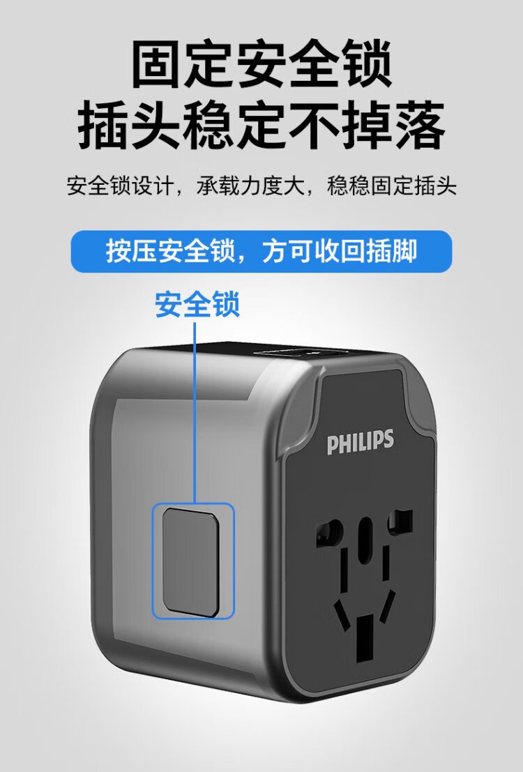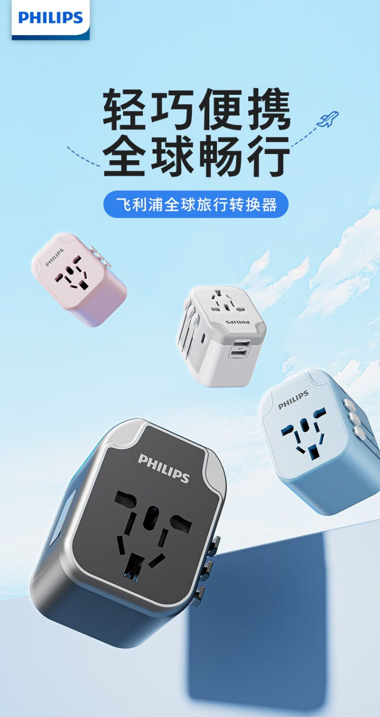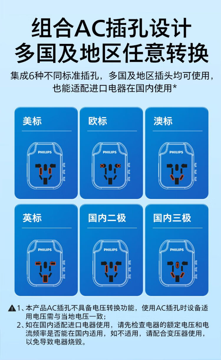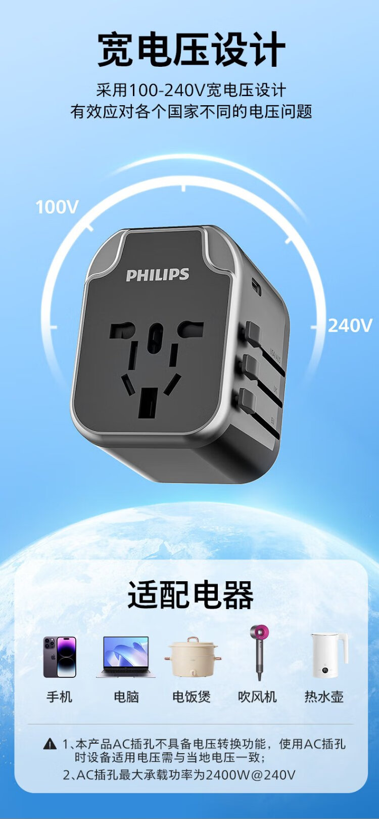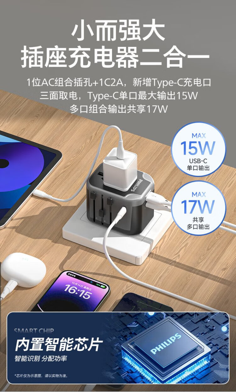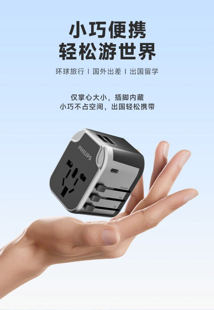 Philips (PHILIPS) Overseas Conversion Plug Adapter/International Travel Socket Adapter/UK, Europe, America, Australia Standard, Germany, Japan, Singapore and Hong Kong Applicable/2A1C Charging 17W Black