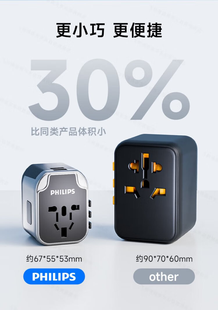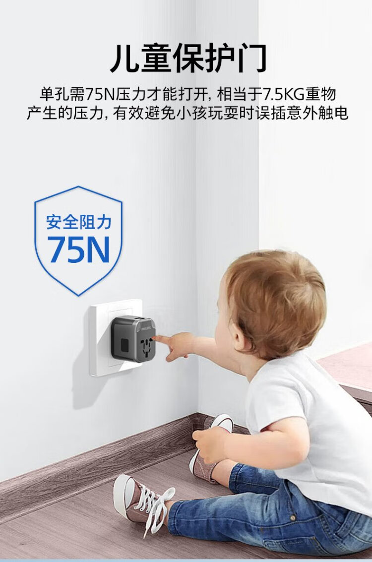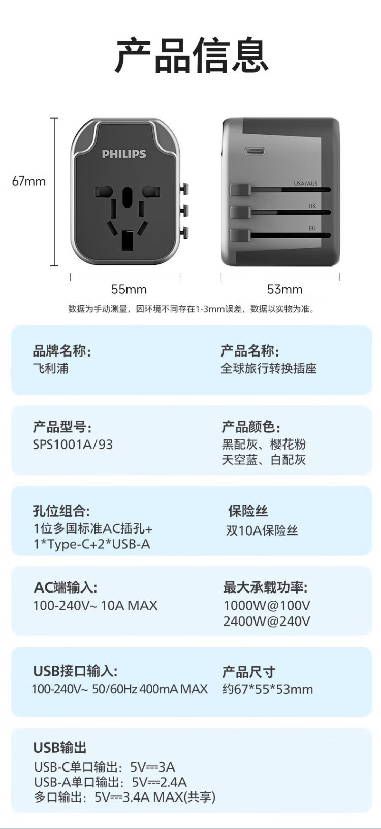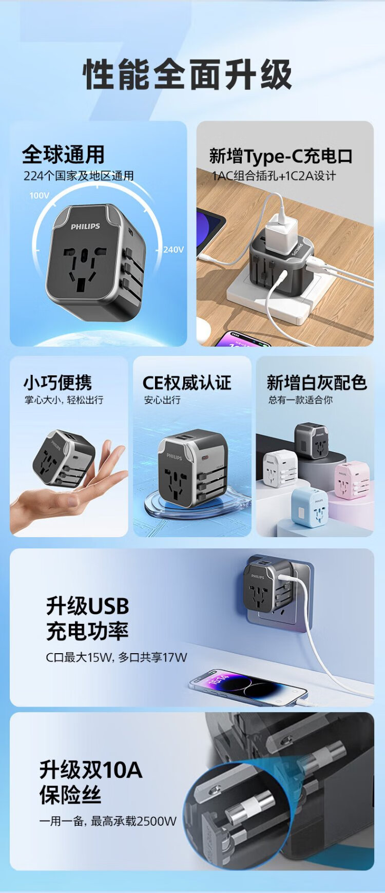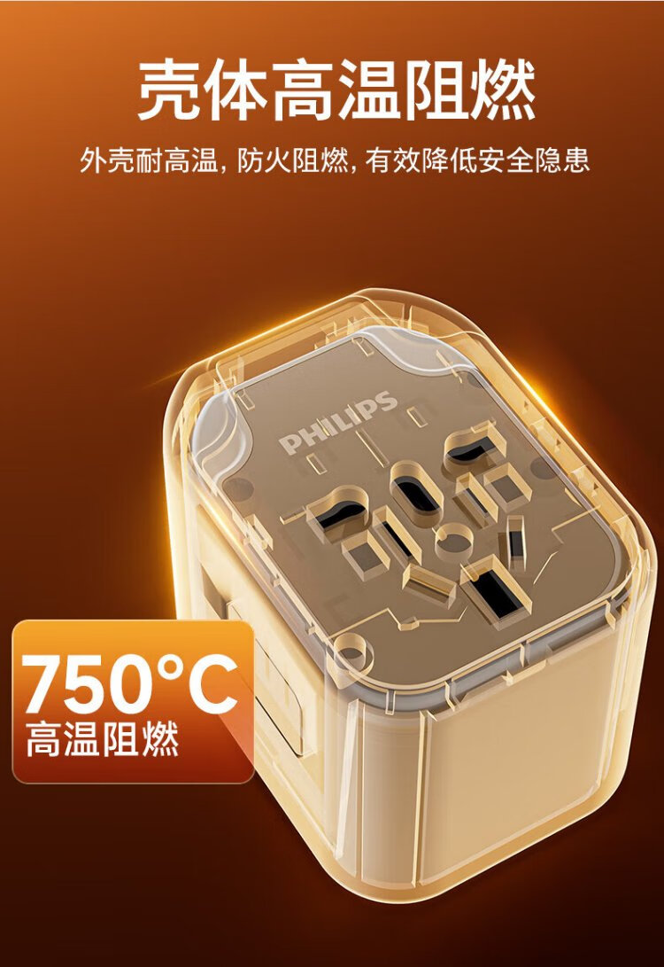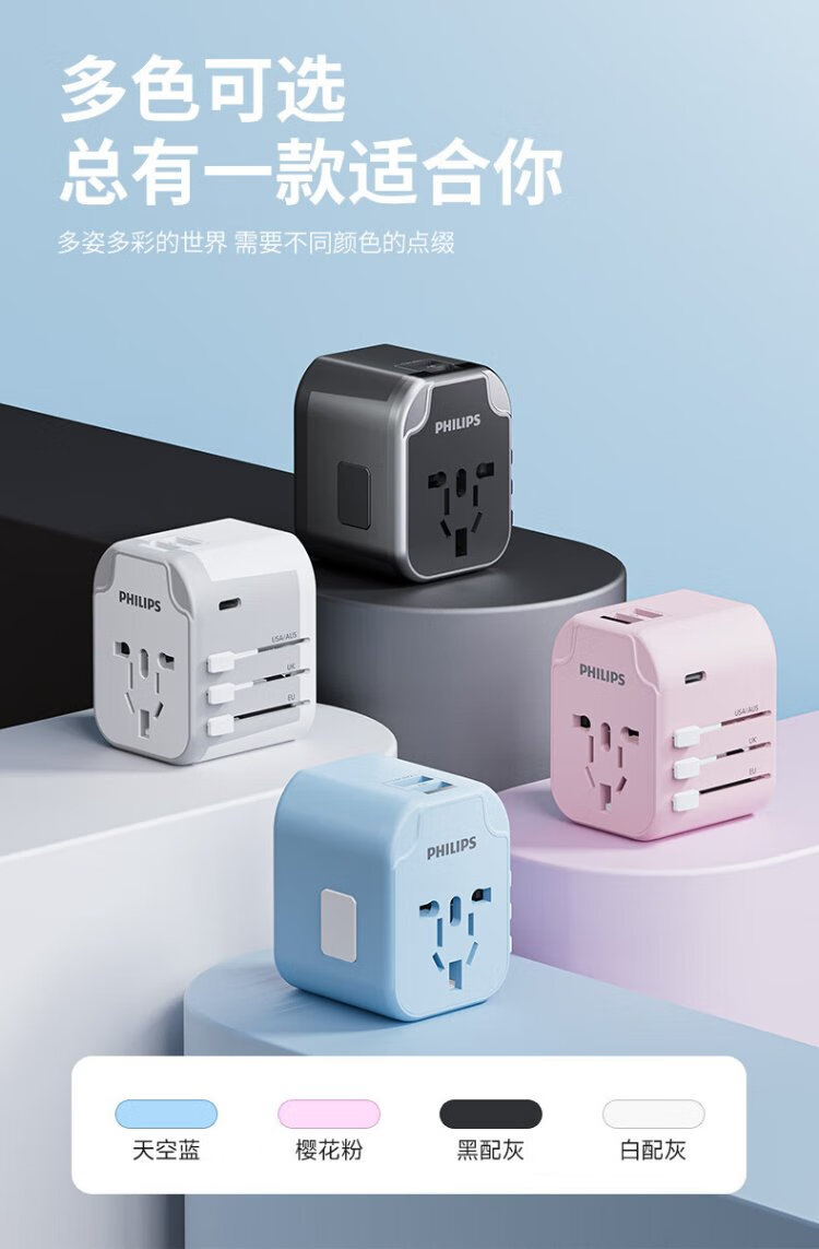 Philips (PHILIPS) Overseas Conversion Plug Adapter/International Travel Socket Adapter/UK, Europe, America, Australia Standard, Germany, Japan, Singapore and Hong Kong Applicable/2A1C Charging 17W Black