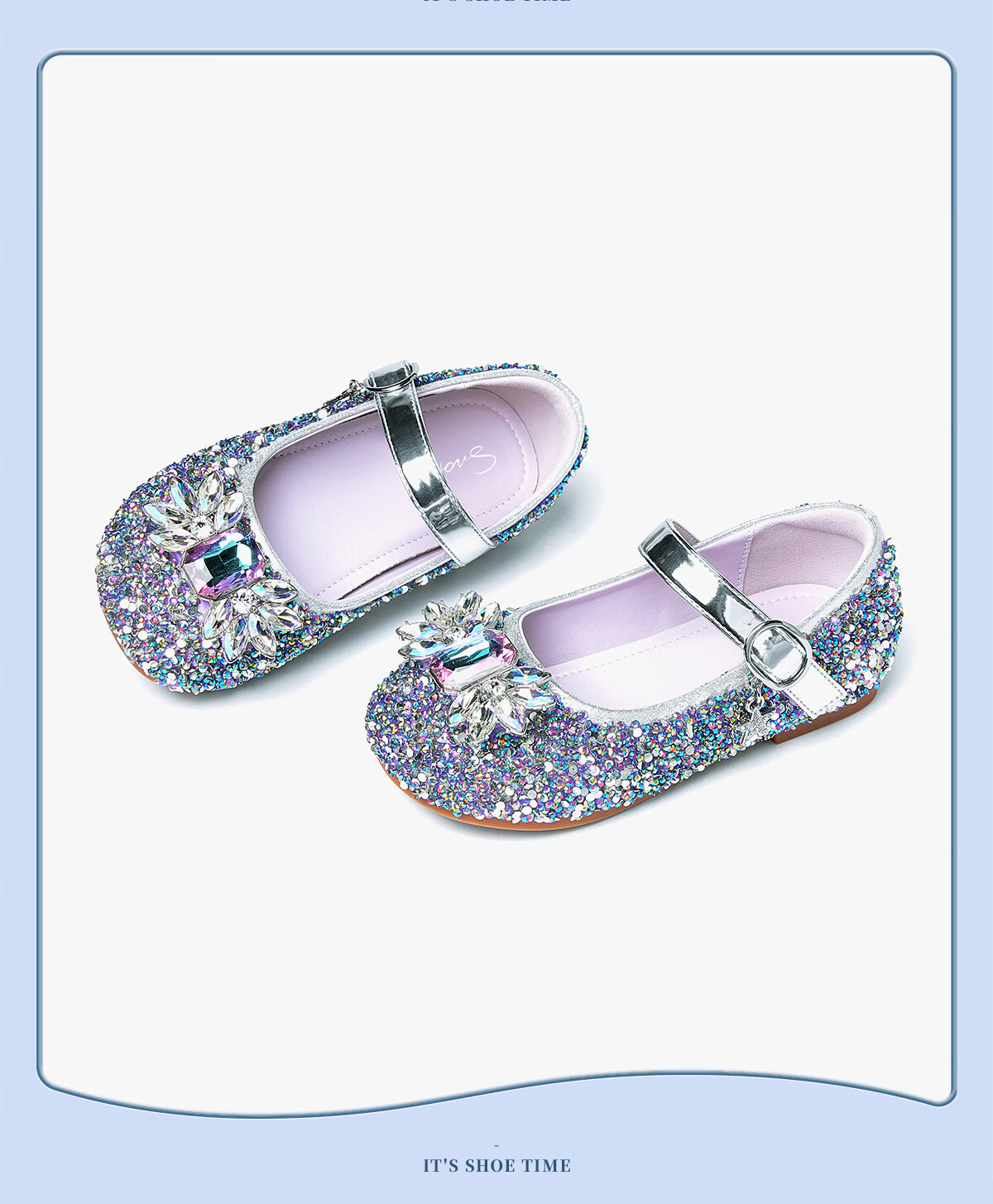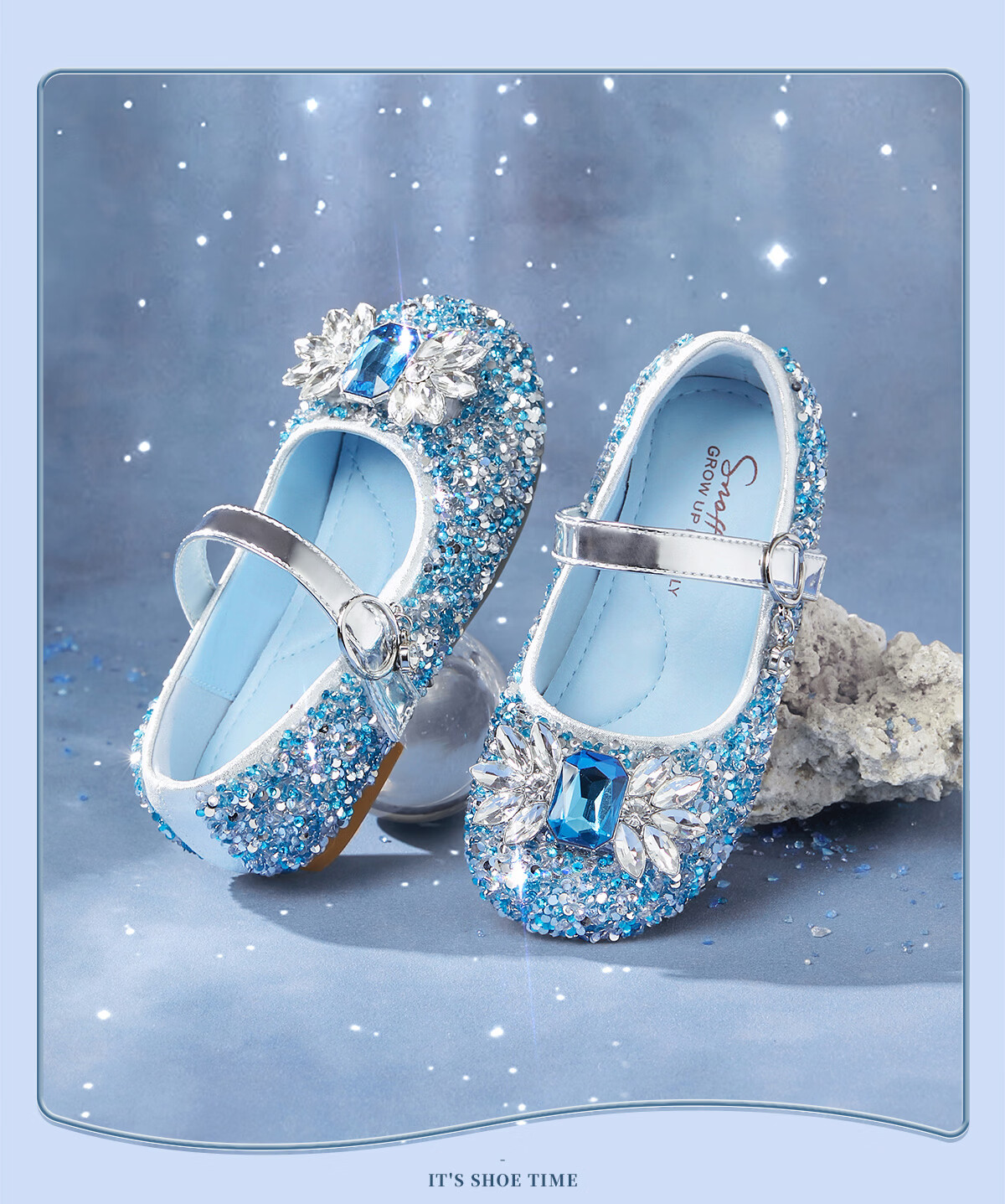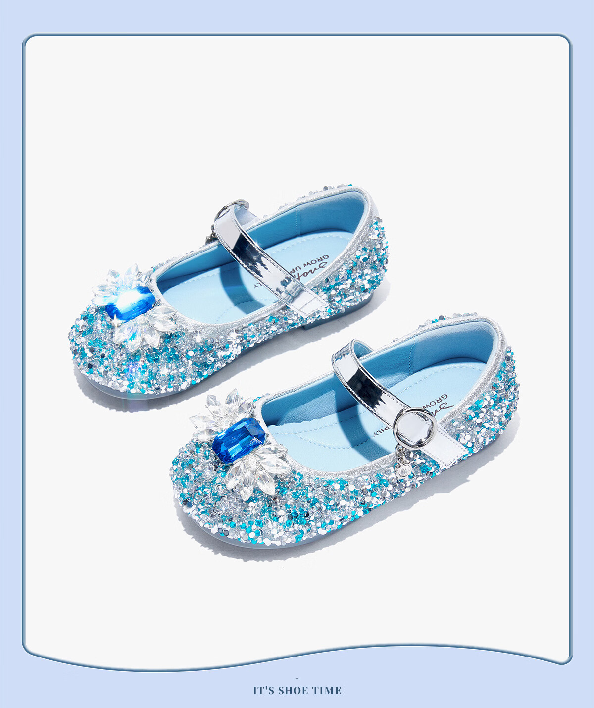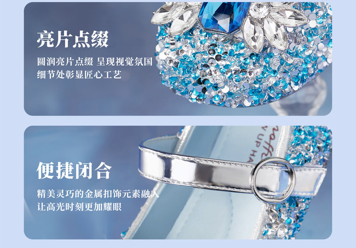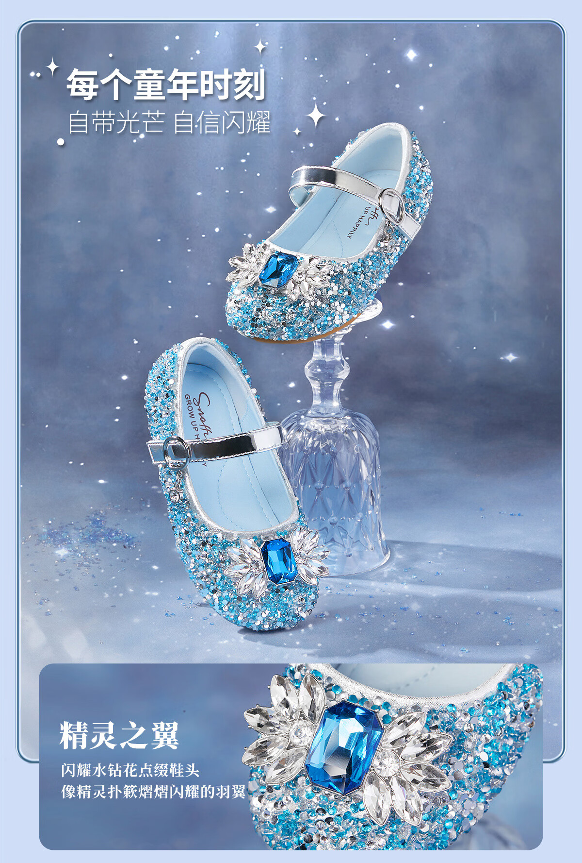 Snuffy girls' leather shoes spring Elsa princess shoes children's crystal shoes medium and large children's performance shoes soft-soled shoes ice and snow blue 26