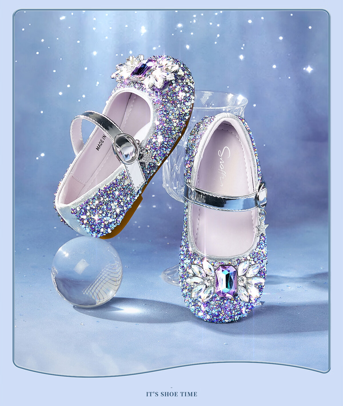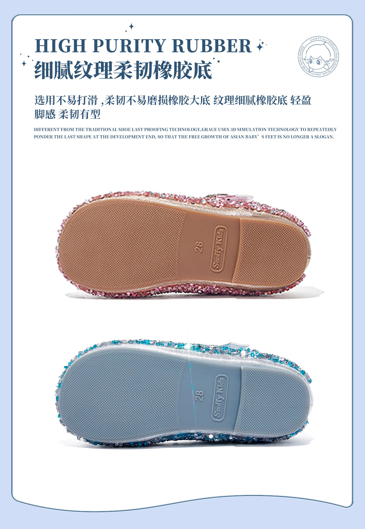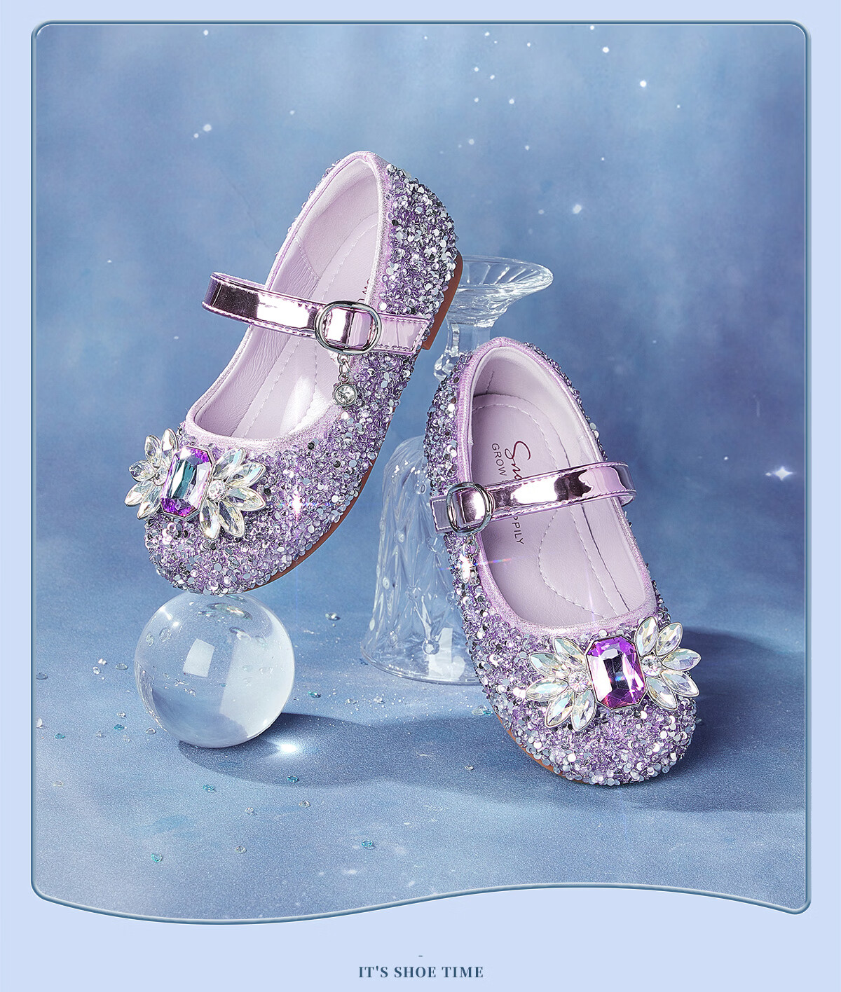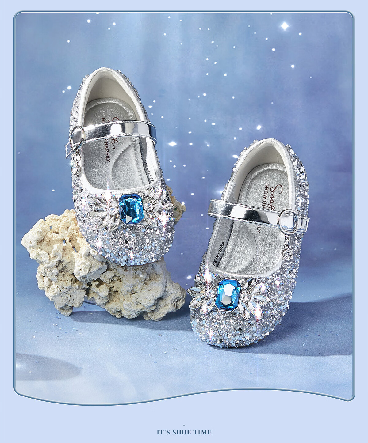 Snuffy girls' leather shoes spring Elsa princess shoes children's crystal shoes medium and large children's performance shoes soft-soled shoes ice and snow blue 26