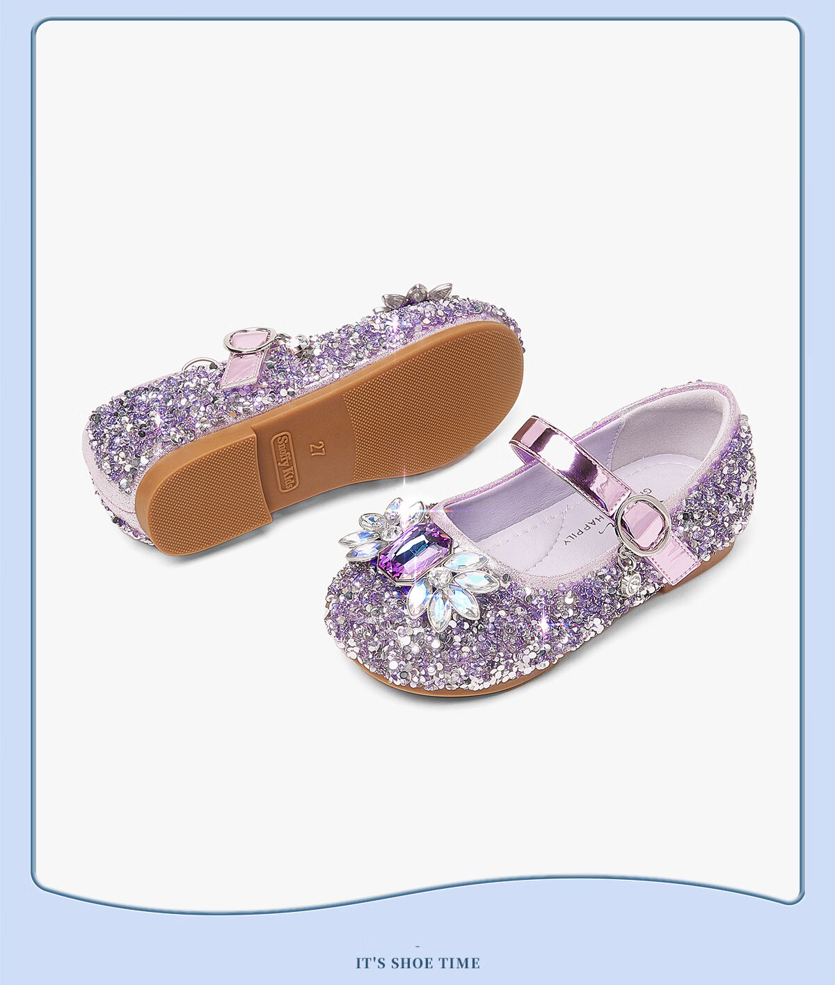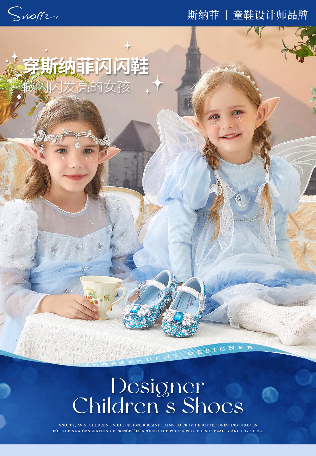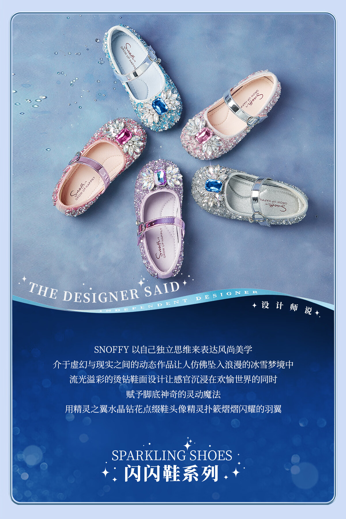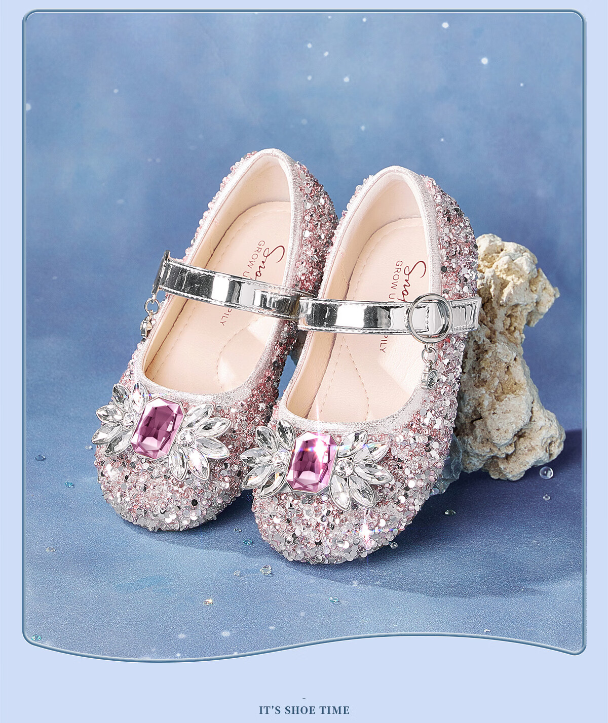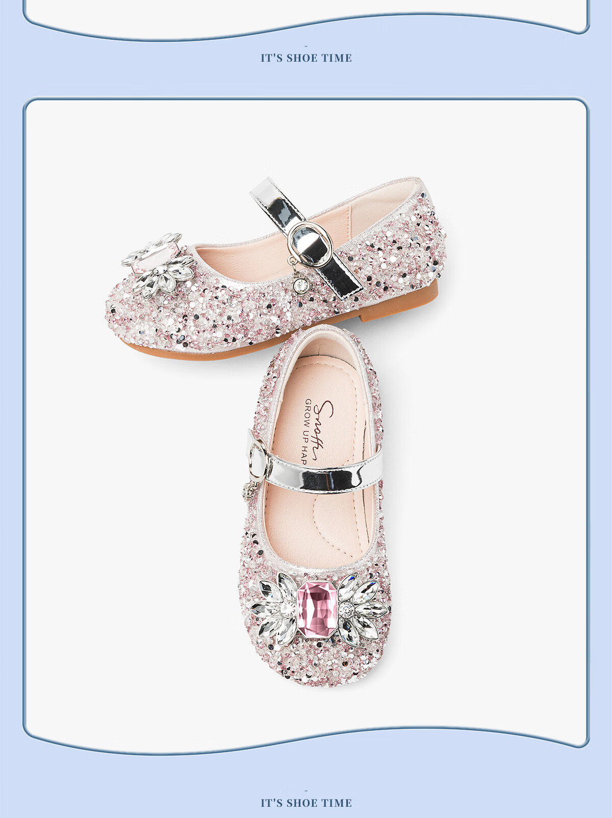 Snuffy girls' leather shoes spring Elsa princess shoes children's crystal shoes medium and large children's performance shoes soft-soled shoes ice and snow blue 26
