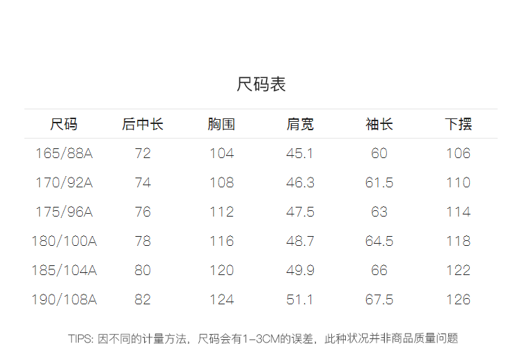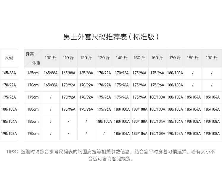 China (cm) 165 / 88-90 170 / 96-98 175 / 108-110 180 / 118-122 185 / 126-130
