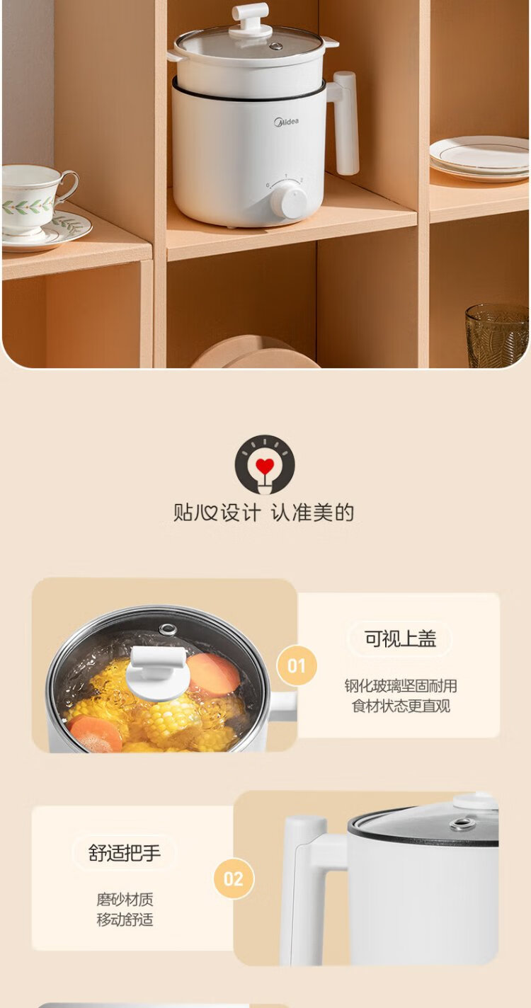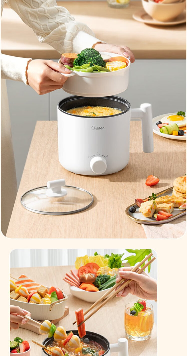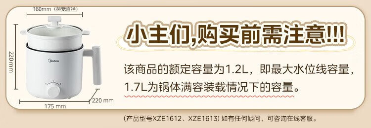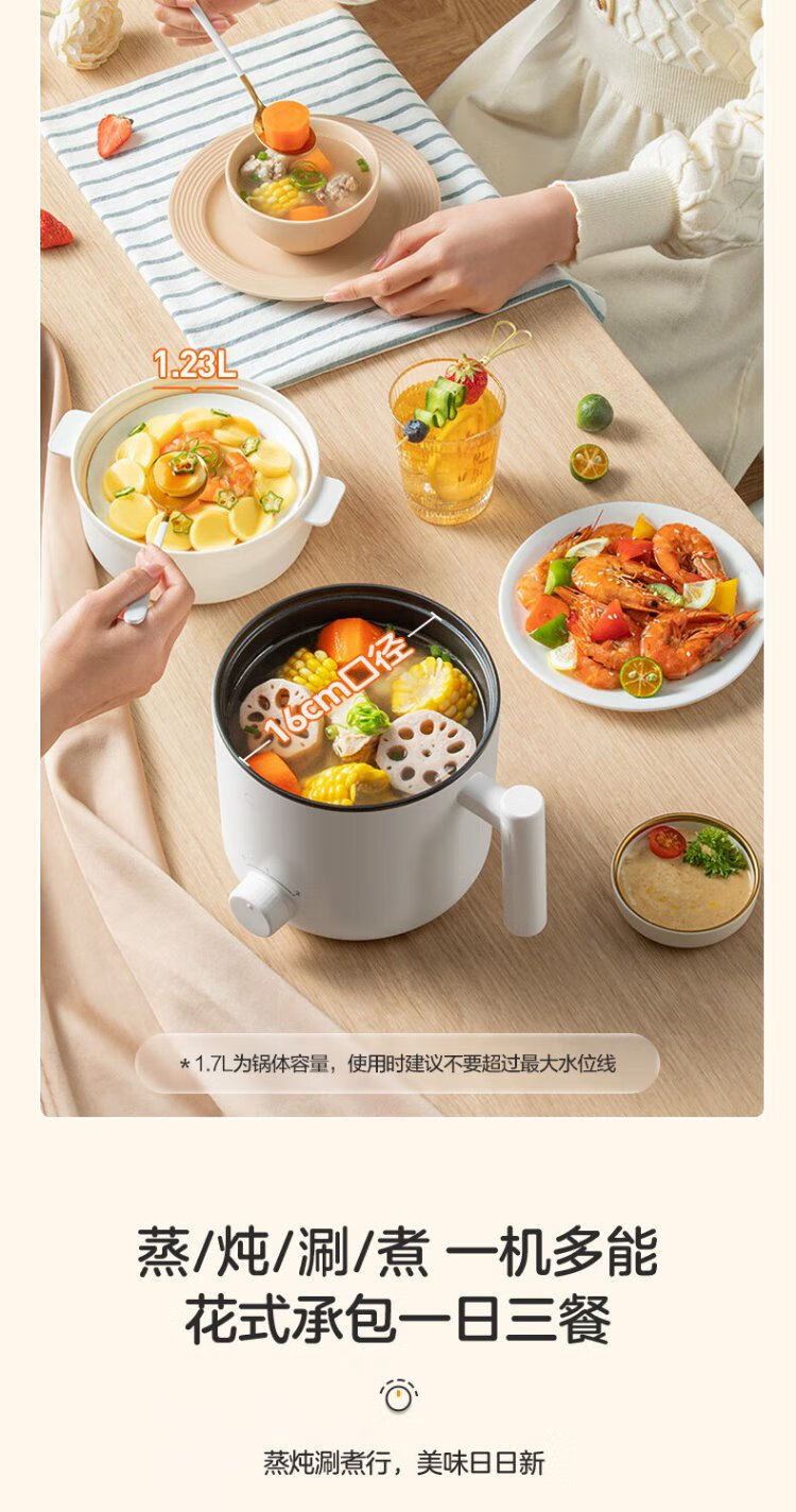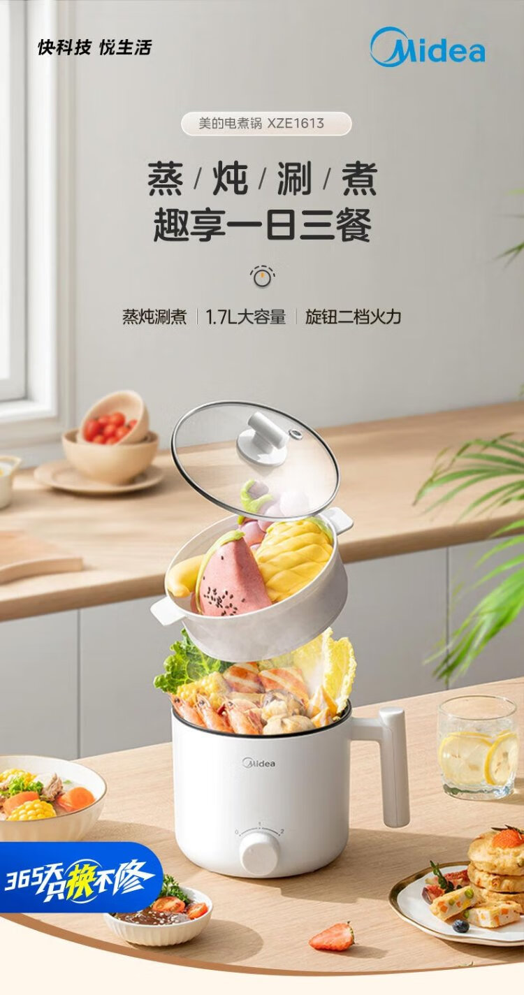 Midea electric cooking pot, dormitory small electric pot, electric steamer, student dormitory all-in-one instant noodles small hot pot, multi-function pot XZE1613 1.7L with steamer, national subsidy
