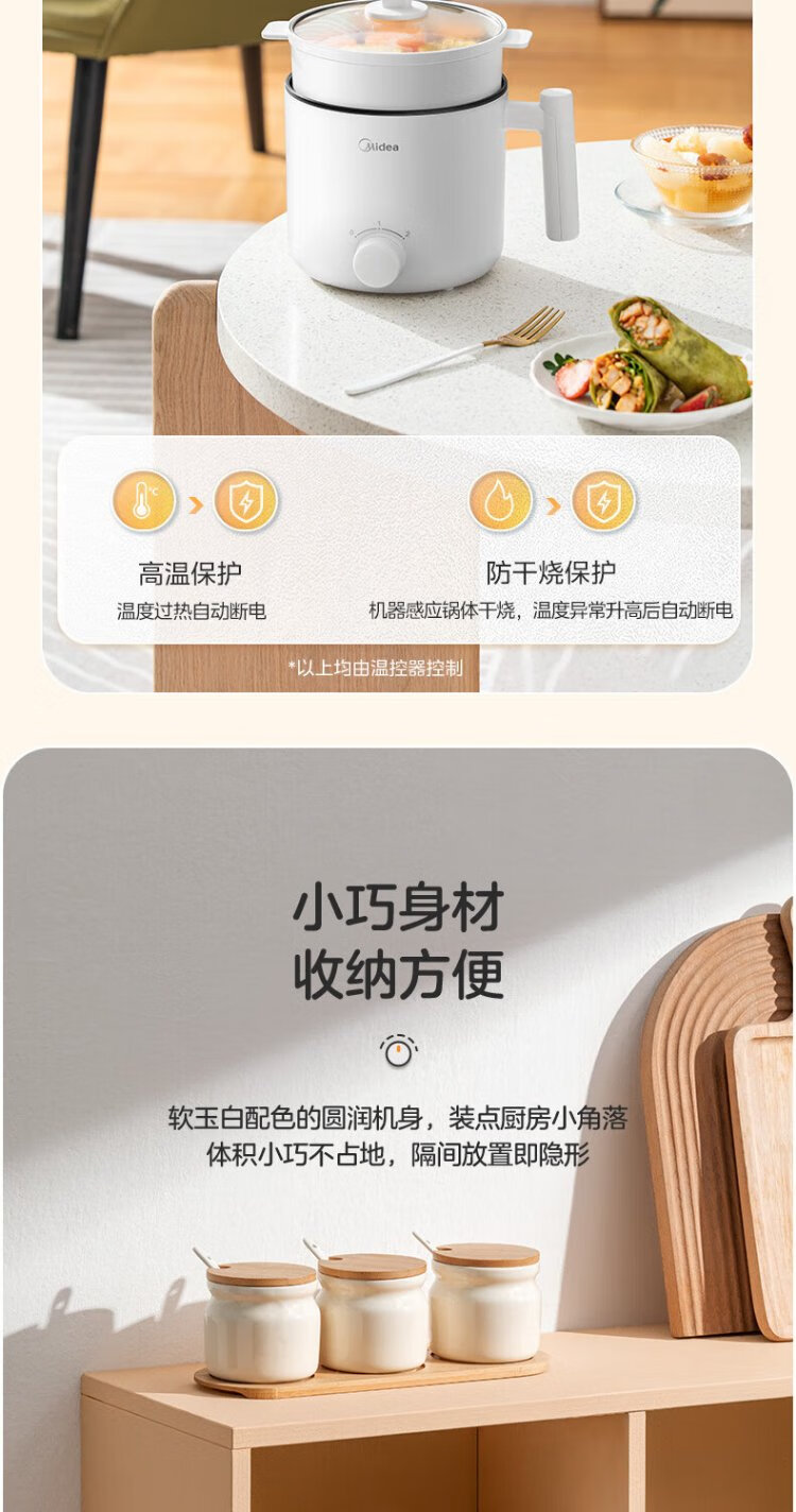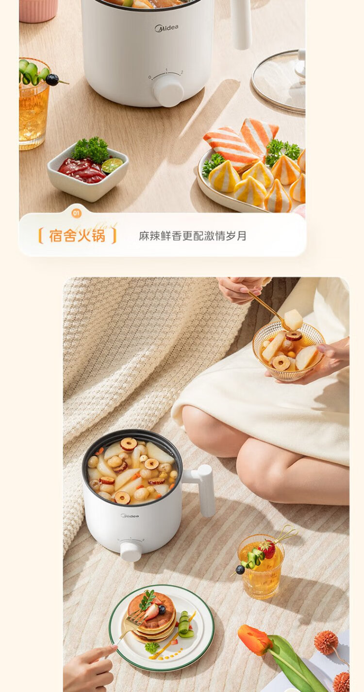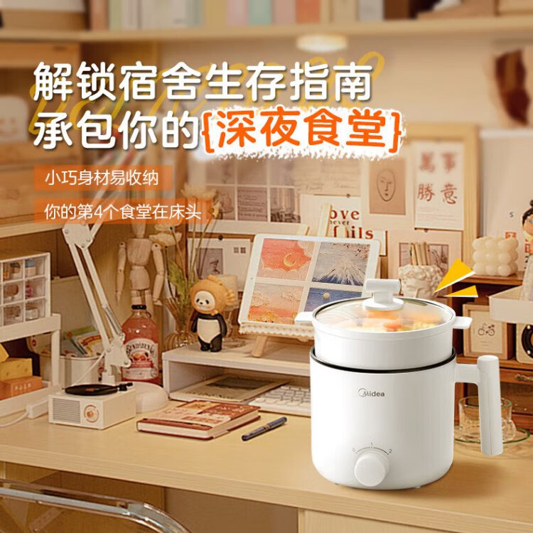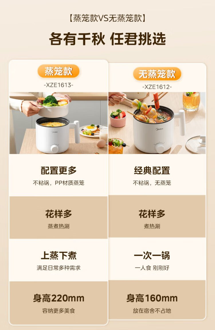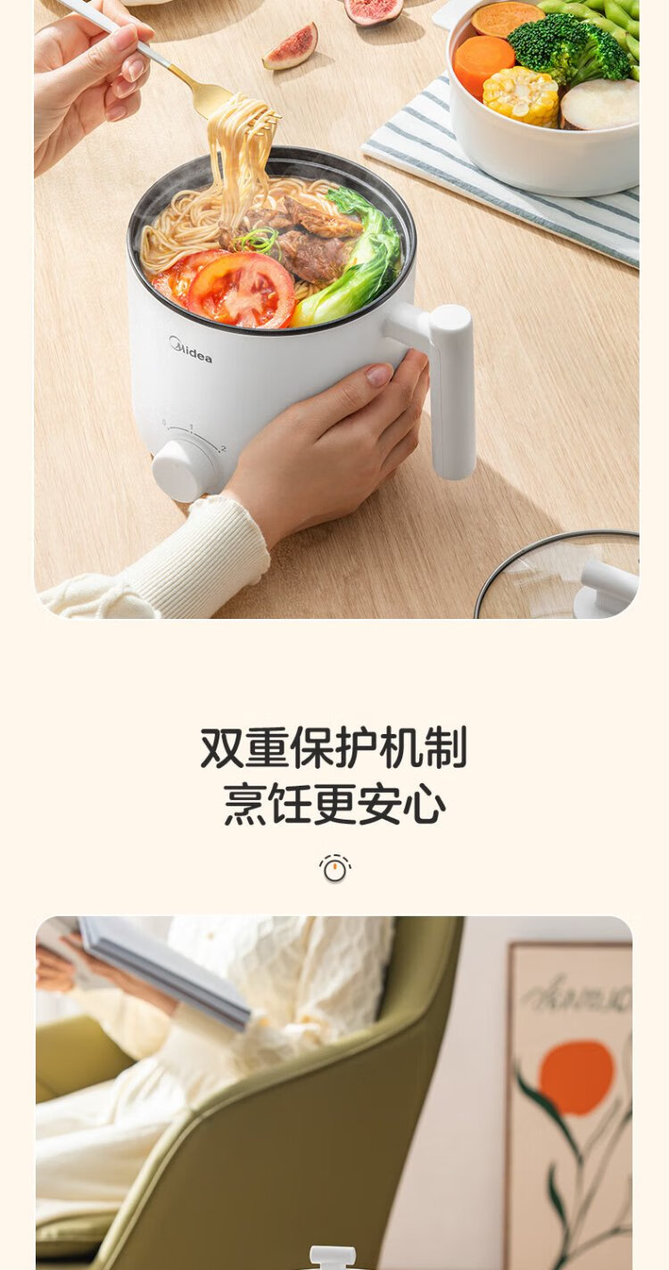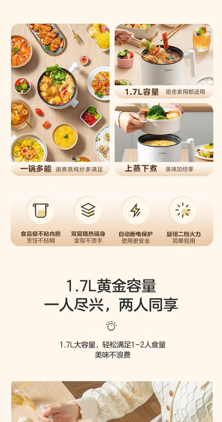 Midea electric cooking pot, dormitory small electric pot, electric steamer, student dormitory all-in-one instant noodles small hot pot, multi-function pot XZE1613 1.7L with steamer, national subsidy