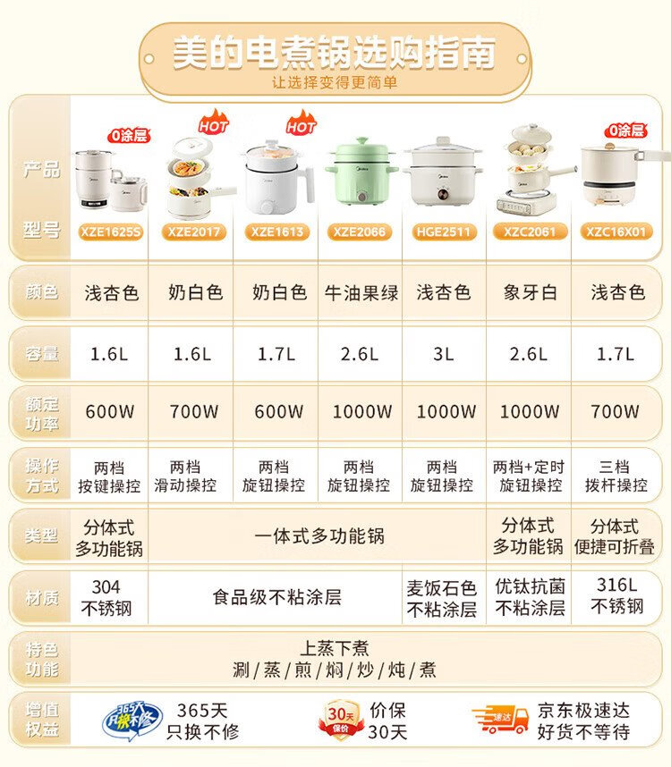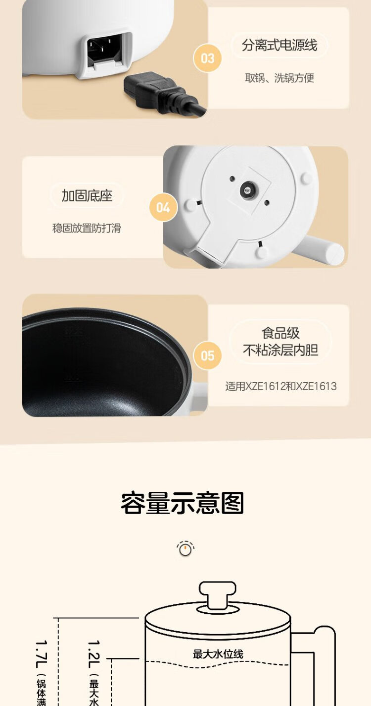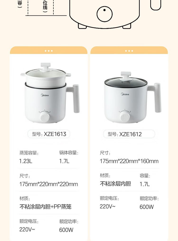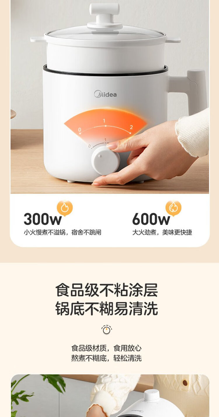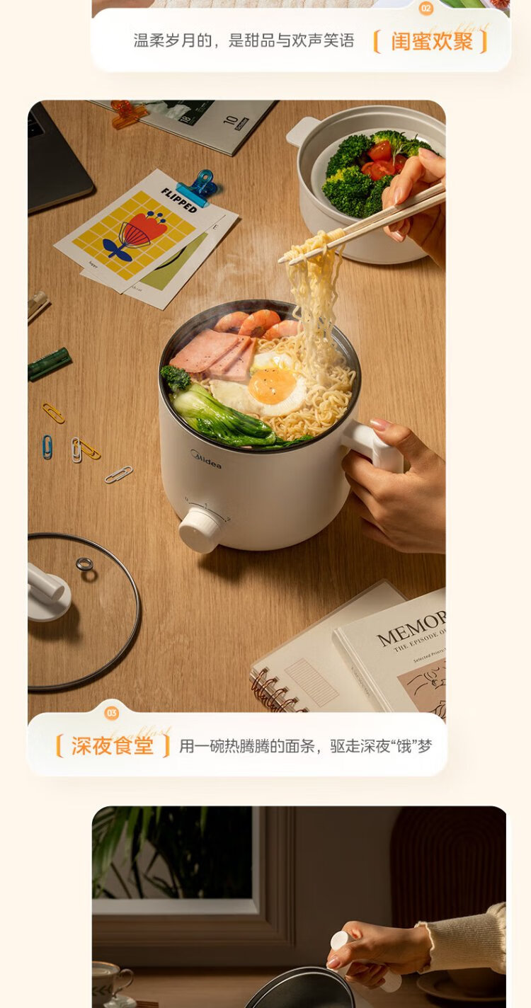 Midea electric cooking pot, dormitory small electric pot, electric steamer, student dormitory all-in-one instant noodles small hot pot, multi-function pot XZE1613 1.7L with steamer, national subsidy