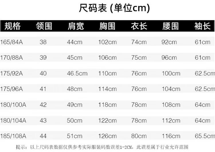 China (cm) 160-165/84-86 165-170 / 88-90 167-172 / 92-96 168-173 / 98-102 170-176 / 106-110