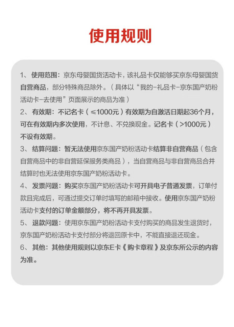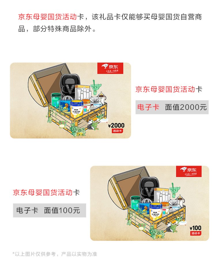 The JD Maternal and Infant Domestic Product Activity Card with a face value of 100 (electronic gift card) can only purchase self-operated products in the designated maternal and infant category for the activity, excluding some special products!
