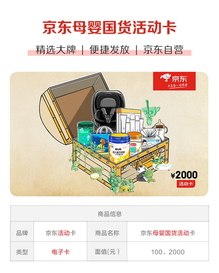 JD.com’s maternal and infant domestic product activity card with a face value of 2,000 (electronic gift card) can only purchase self-operated products in the designated maternal and infant category for the activity, excluding some special products!