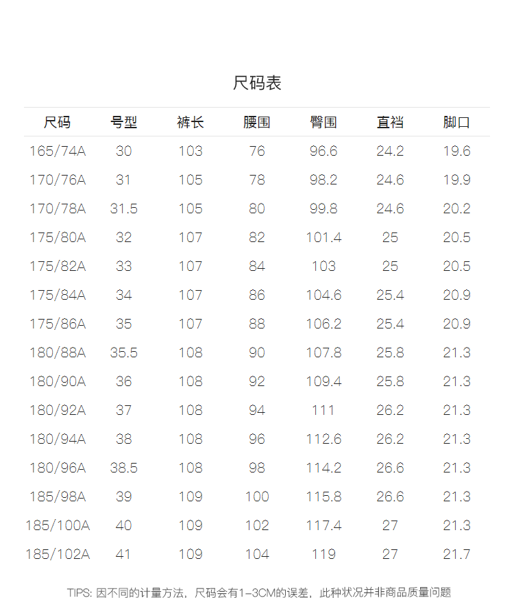 China (cm) 160-165/84-86 165-170 / 88-90 167-172 / 92-96 168-173 / 98-102 170-176 / 106-110