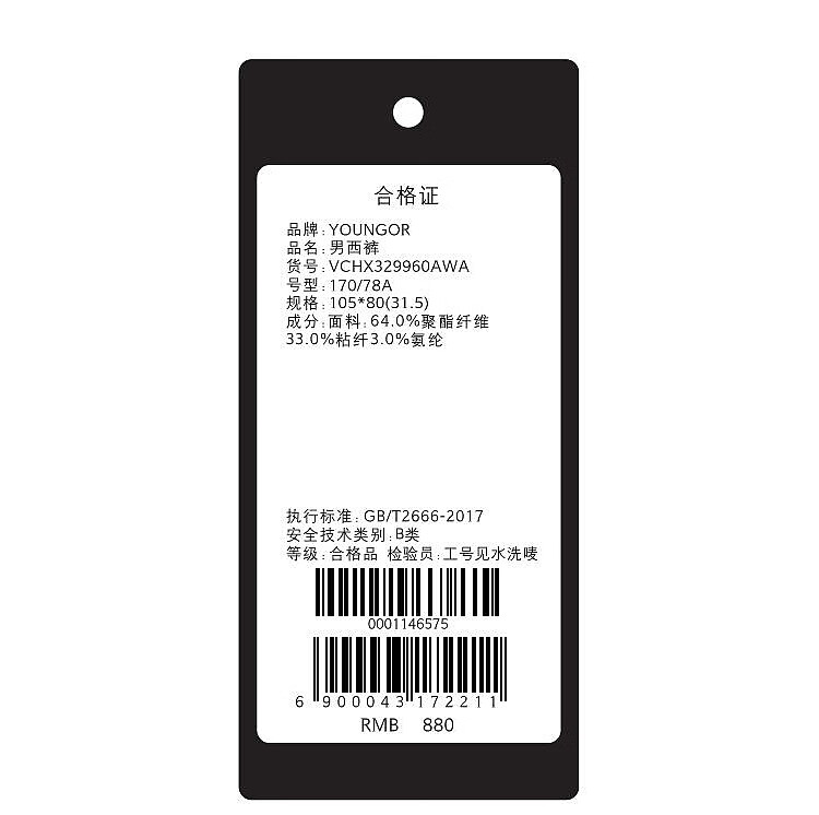 Youngor trousers men's autumn and winter young men's business casual trousers VCHX329960AWA black 170/78A
