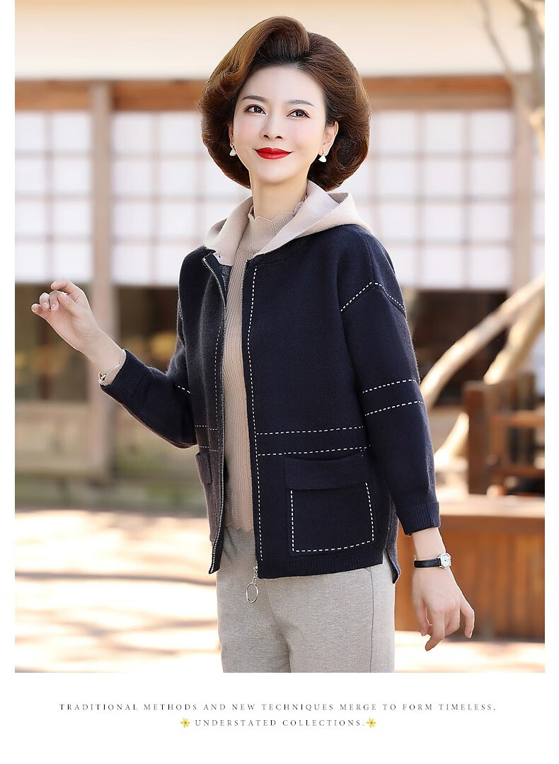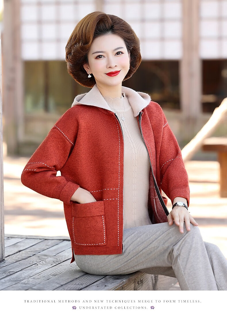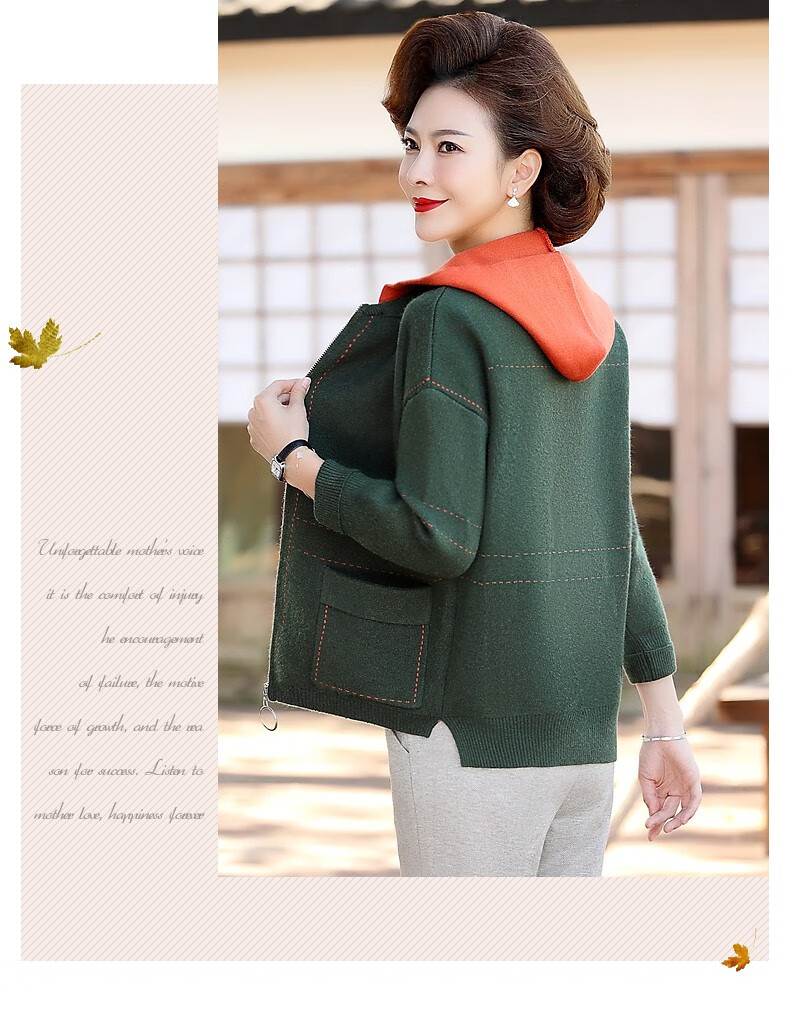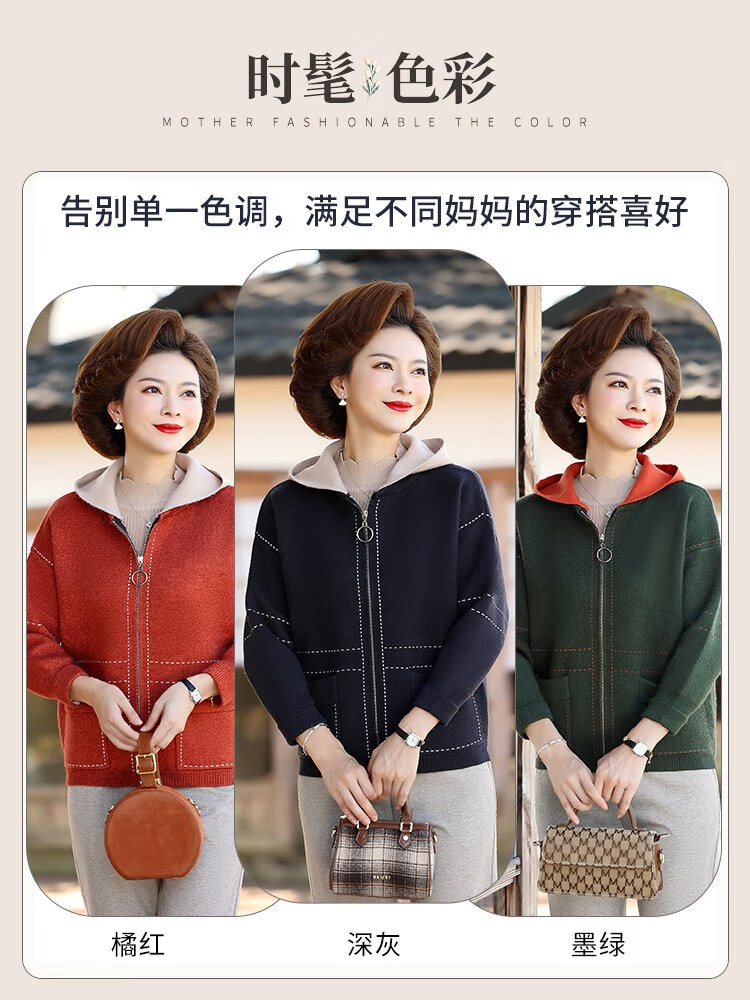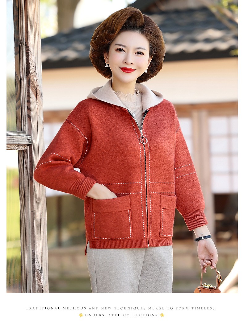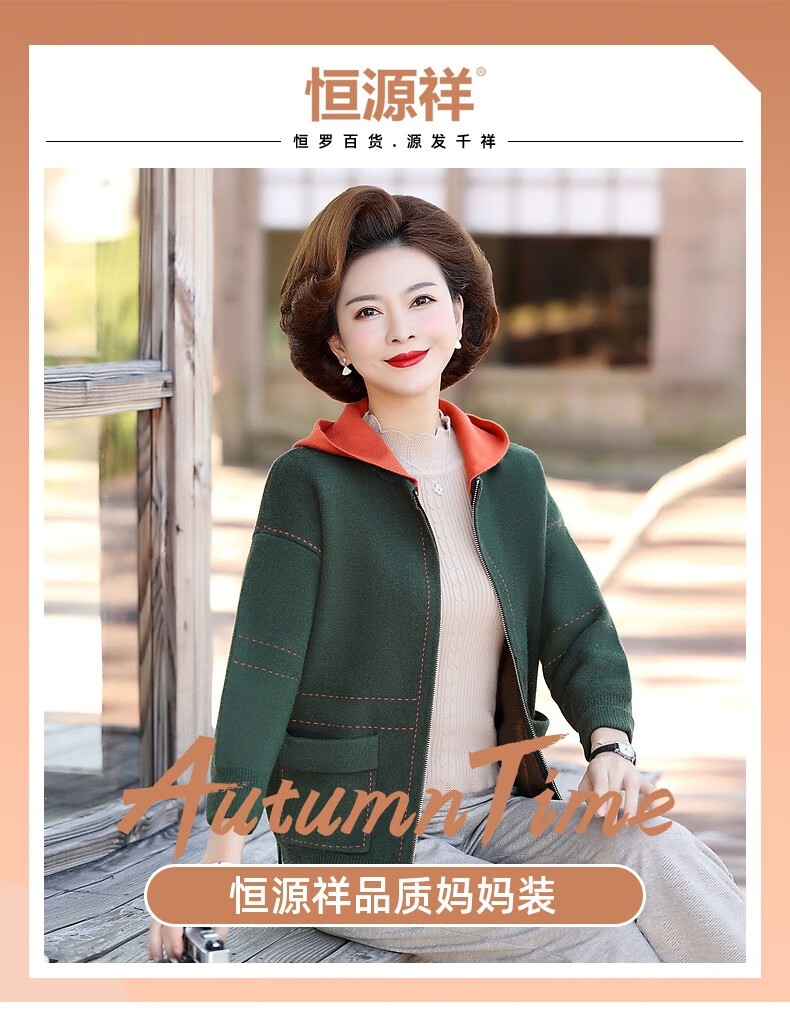Hengyuanxiang middle-aged mother's clothing, autumn style, short knitted jacket, middle-aged and elderly women's clothing, spring and autumn hooded noble cardigan top