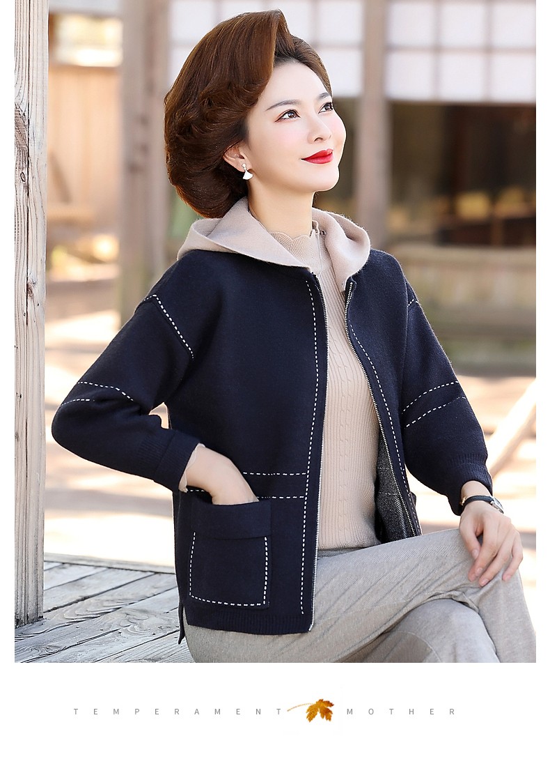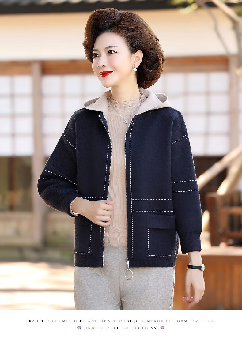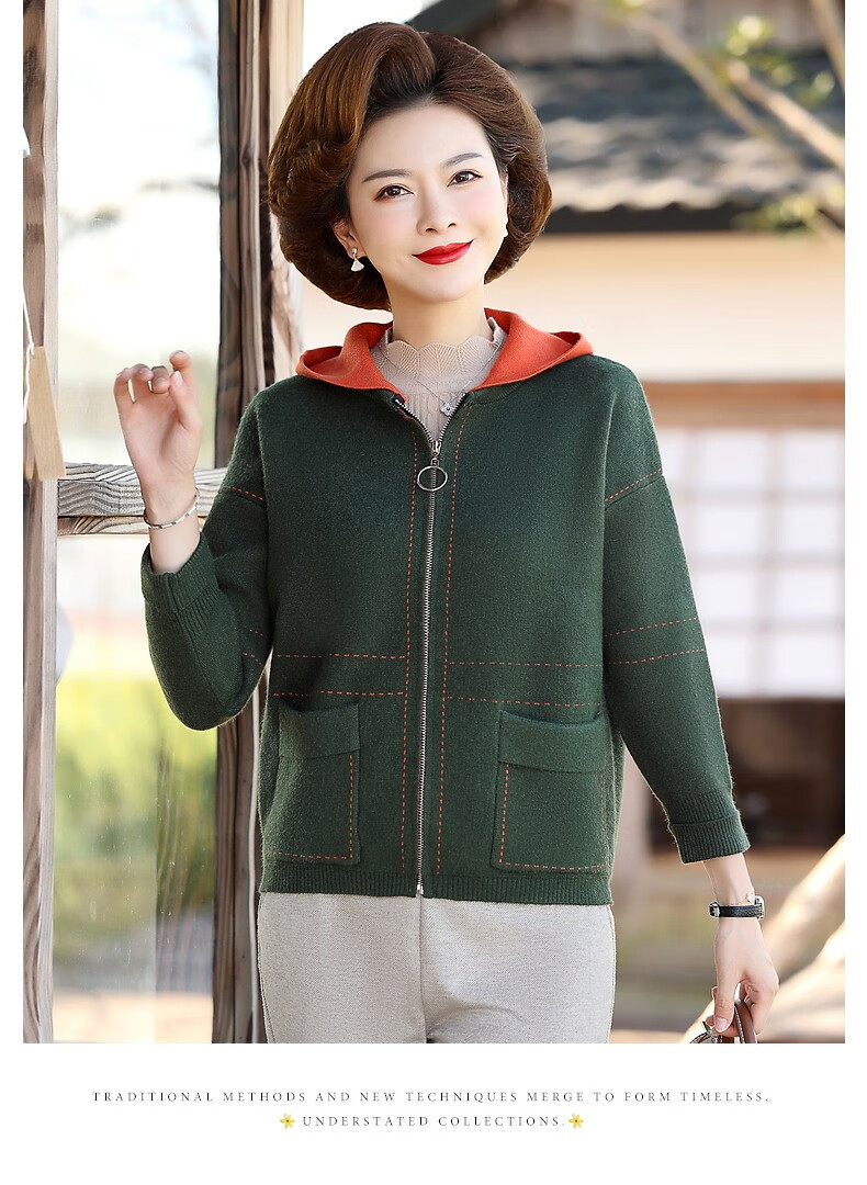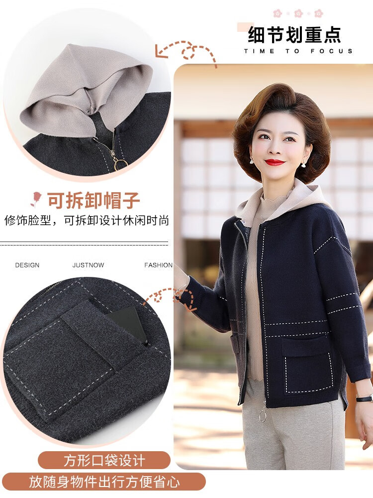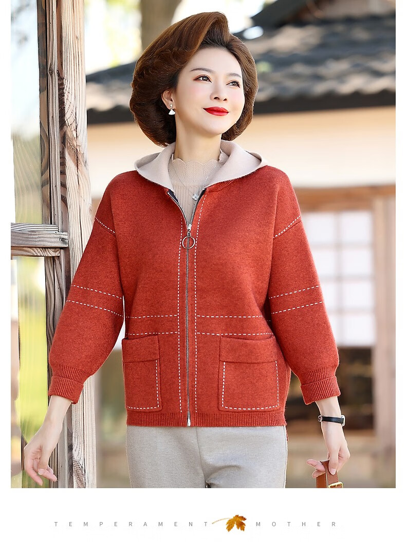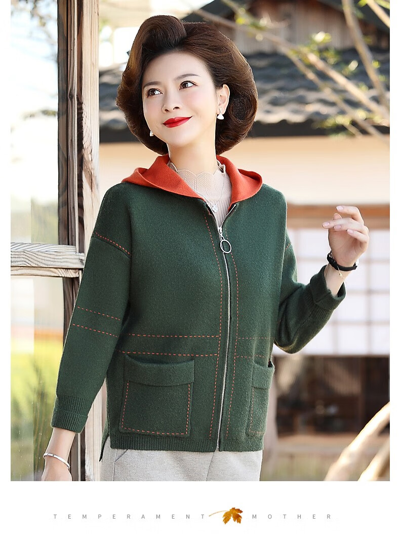 Hengyuanxiang middle-aged mother's clothing, autumn style, short knitted jacket, middle-aged and elderly women's clothing, spring and autumn hooded noble cardigan top