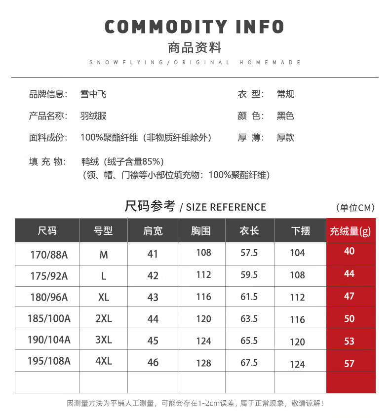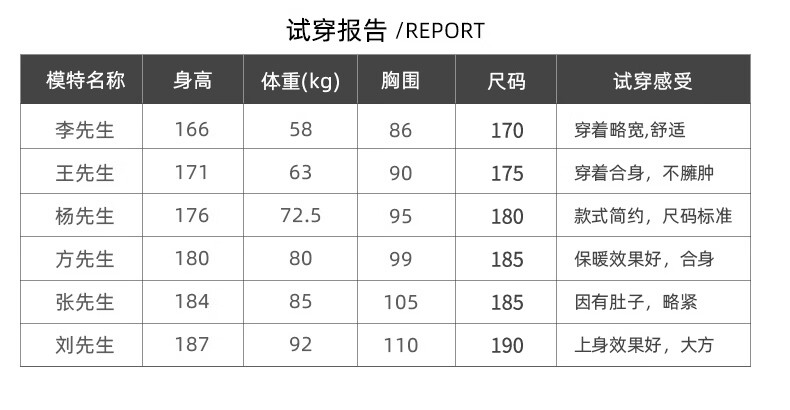 China (cm) 165 / 88-90 170 / 96-98 175 / 108-110 180 / 118-122 185 / 126-130