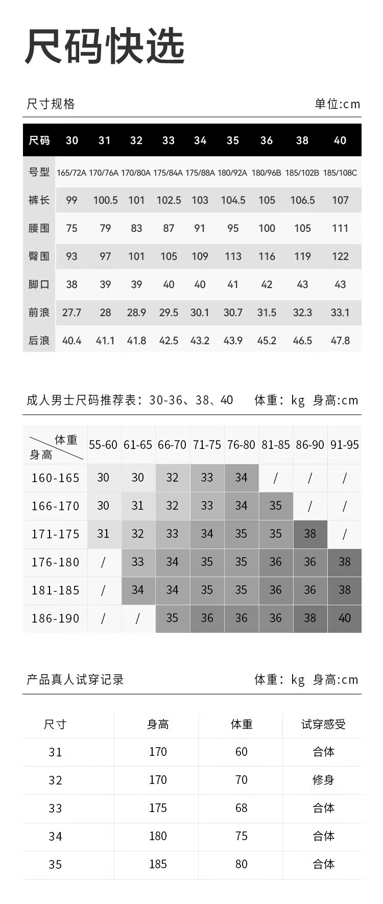 China (cm) 160-165/84-86 165-170 / 88-90 167-172 / 92-96 168-173 / 98-102 170-176 / 106-110