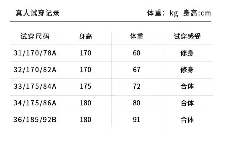 China (cm) 160-165/84-86 165-170 / 88-90 167-172 / 92-96 168-173 / 98-102 170-176 / 106-110