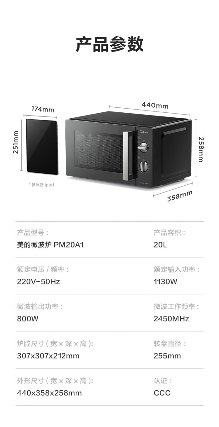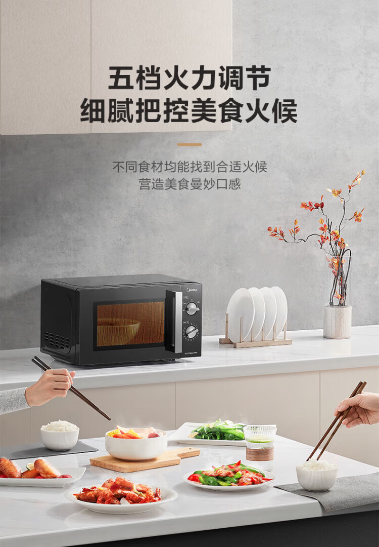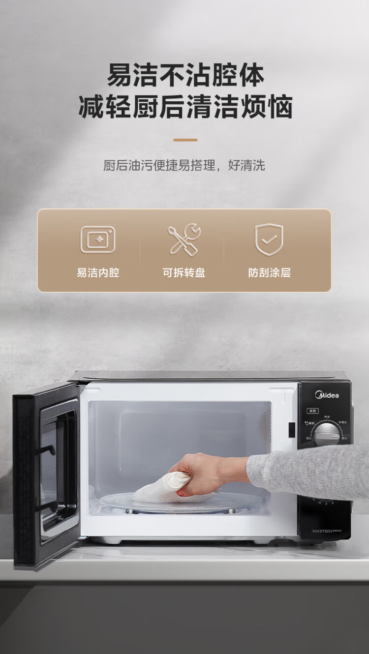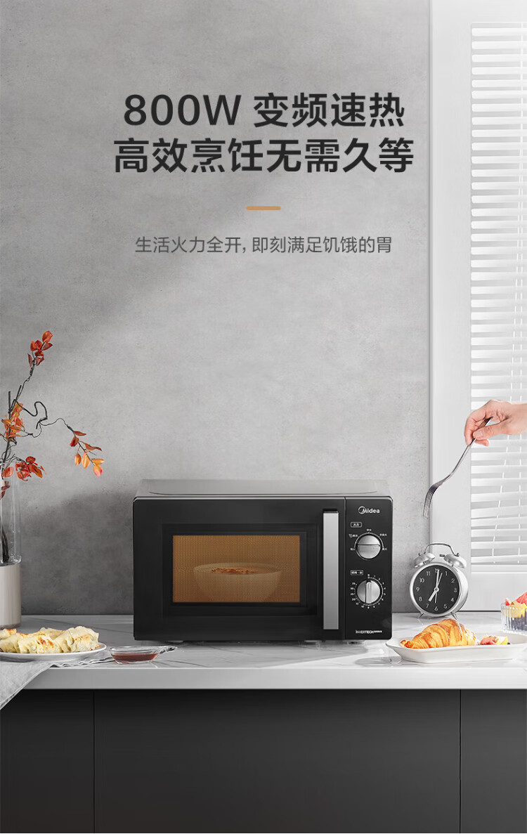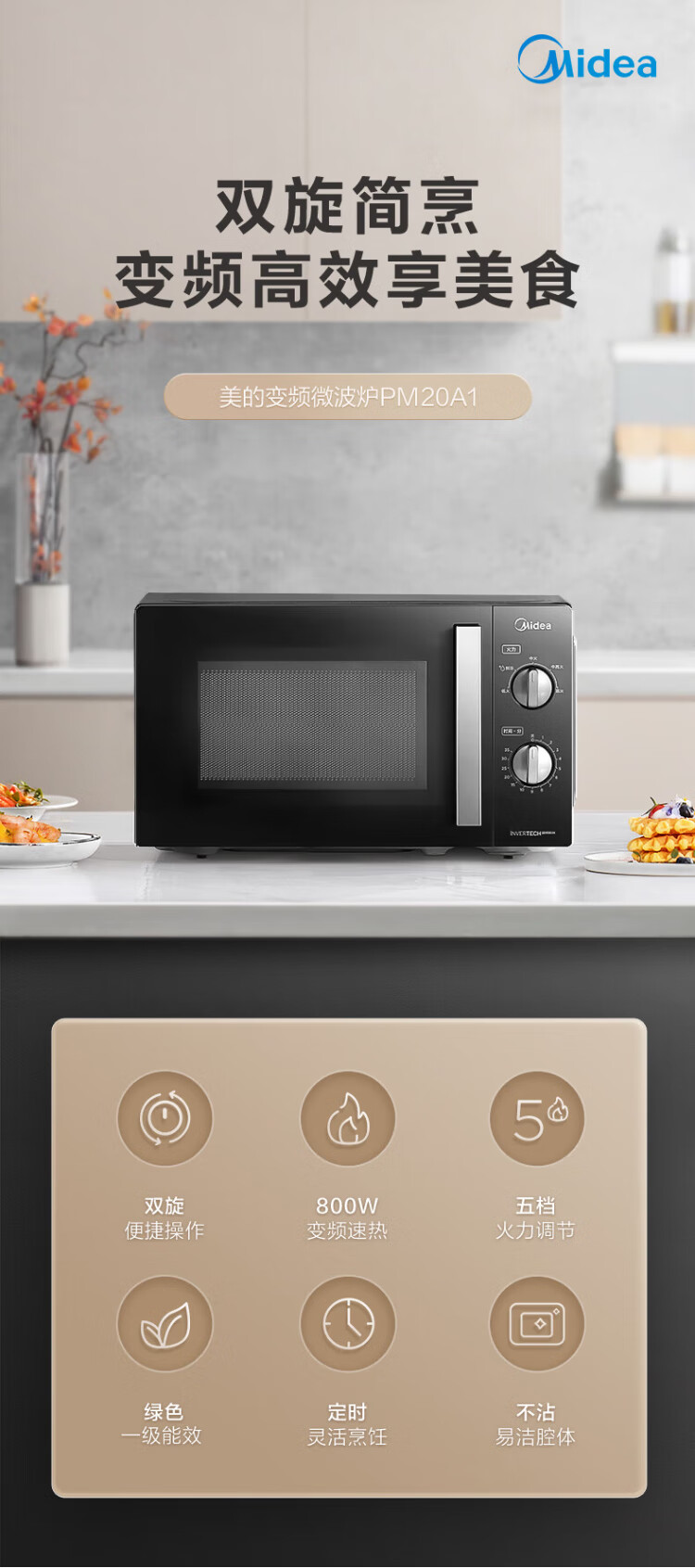 Midea inverter microwave oven, double-turn for easy operation, five-speed rapid heating, 360 turntable heating, 20L compact capacity, micro carbon series PM20A1