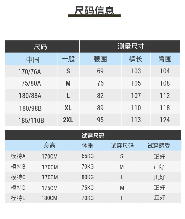 China (cm) 165 / 88-90 170 / 96-98 175 / 108-110 180 / 118-122 185 / 126-130