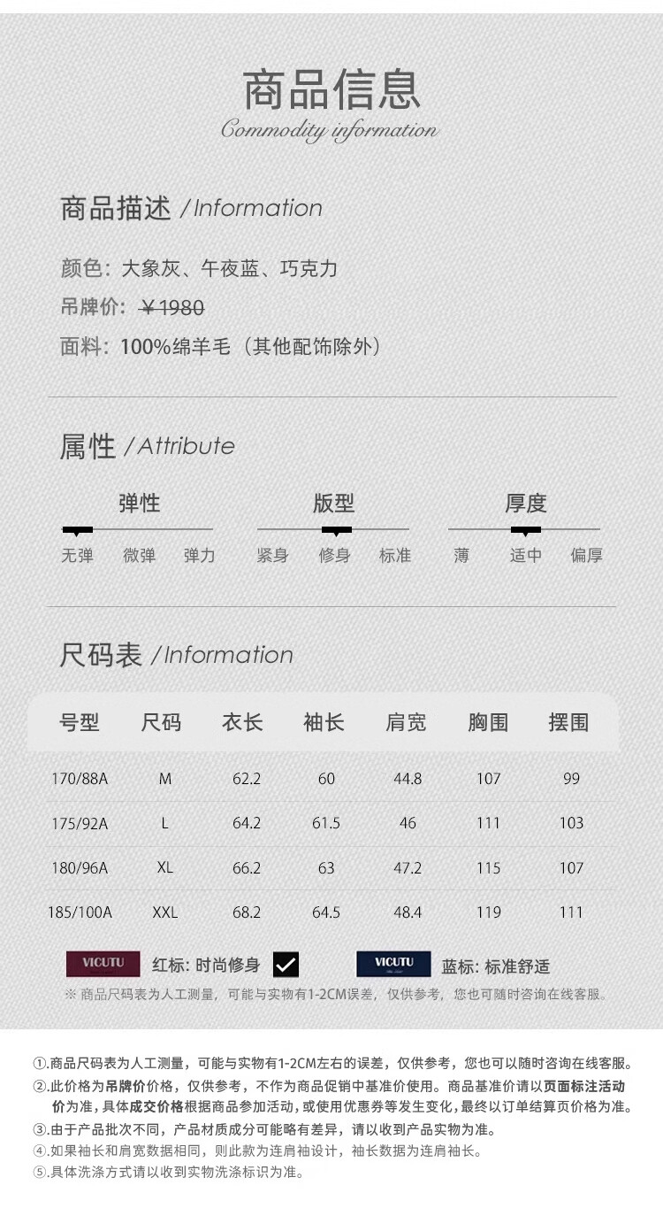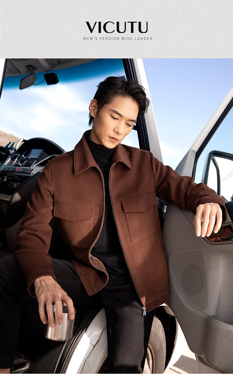 VICUTU 100% sheep wool fine windproof warm jacket Chocolate 175/92A
