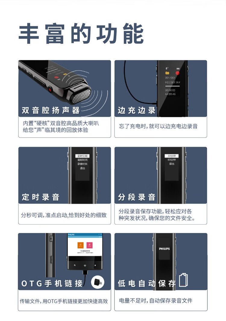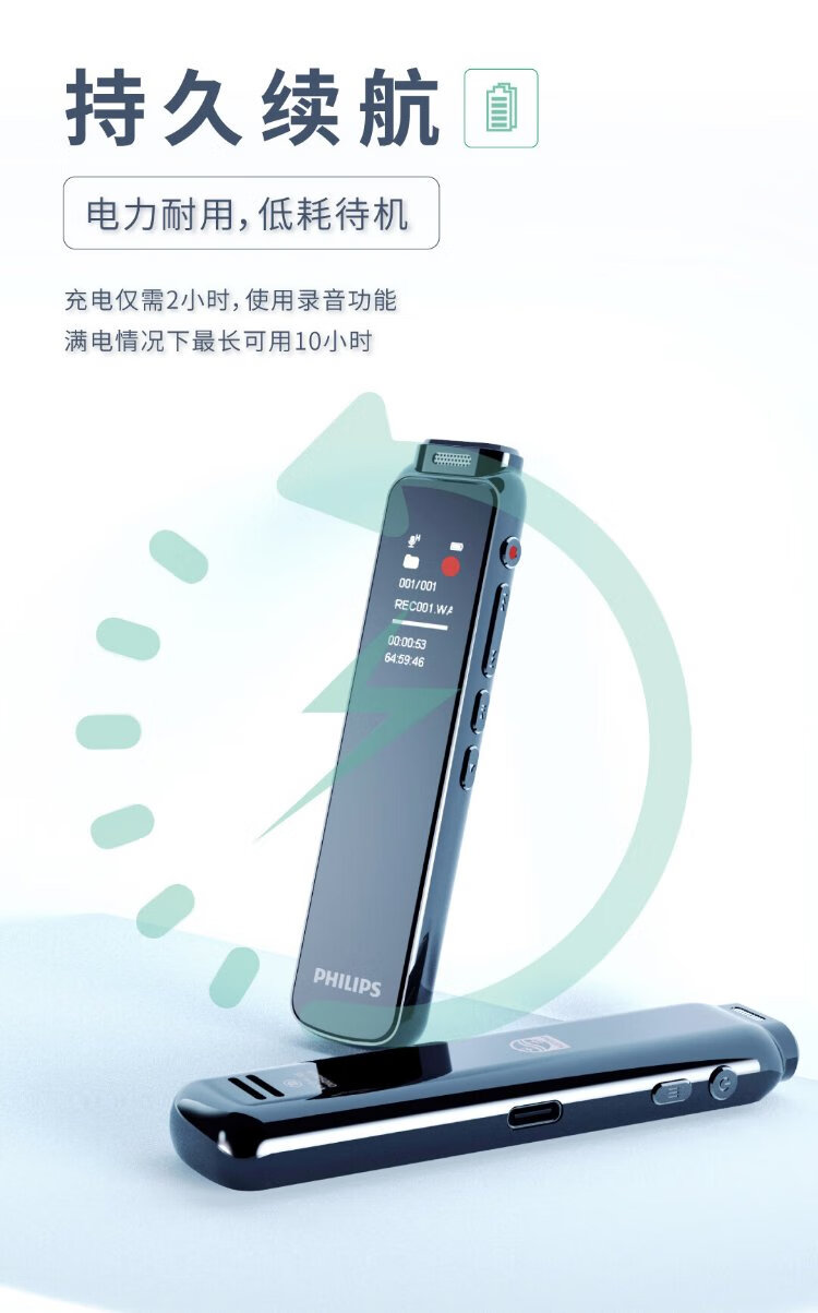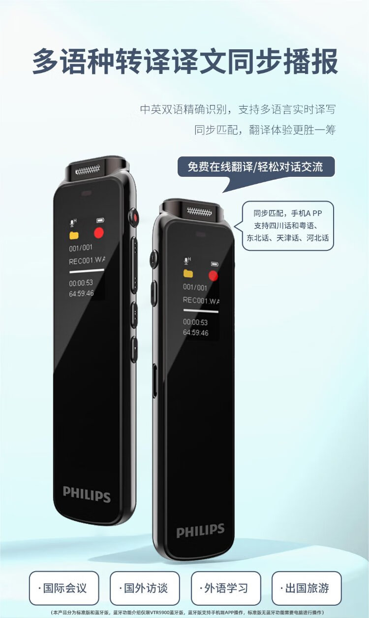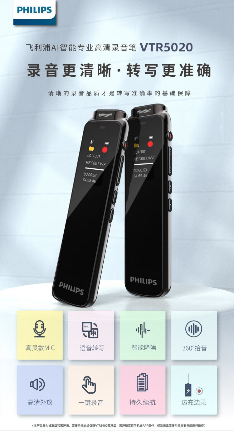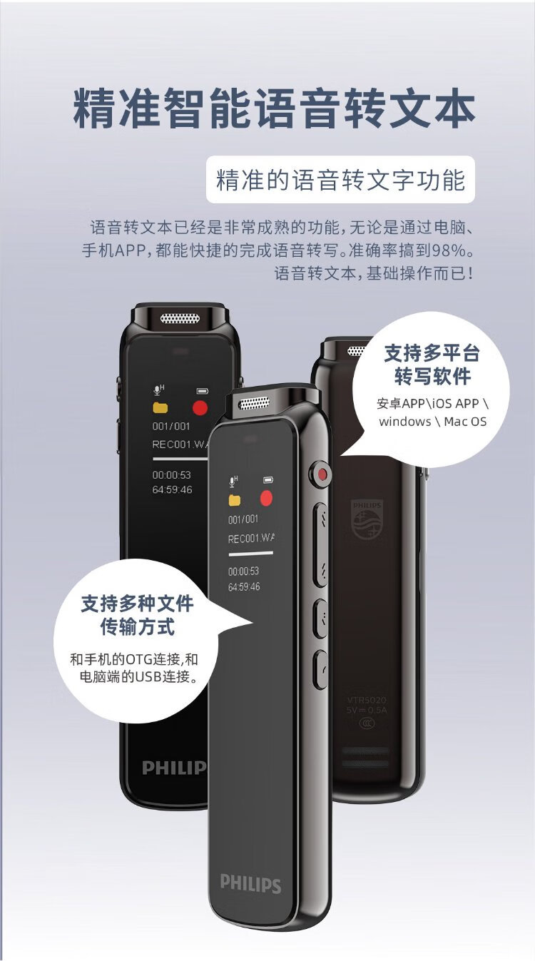 Philips (PHILIPS) smart recorder VTR5020 Bluetooth version 16G voice-to-text professional recording equipment forensics dedicated portable small business meeting learning recording recorder
