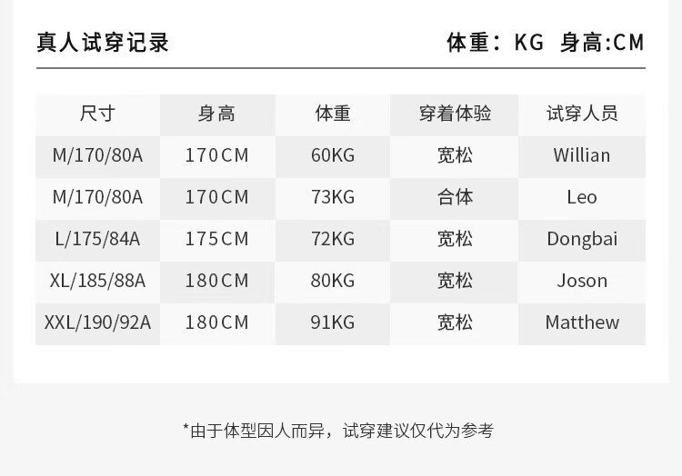 China (cm) 165 / 88-90 170 / 96-98 175 / 108-110 180 / 118-122 185 / 126-130