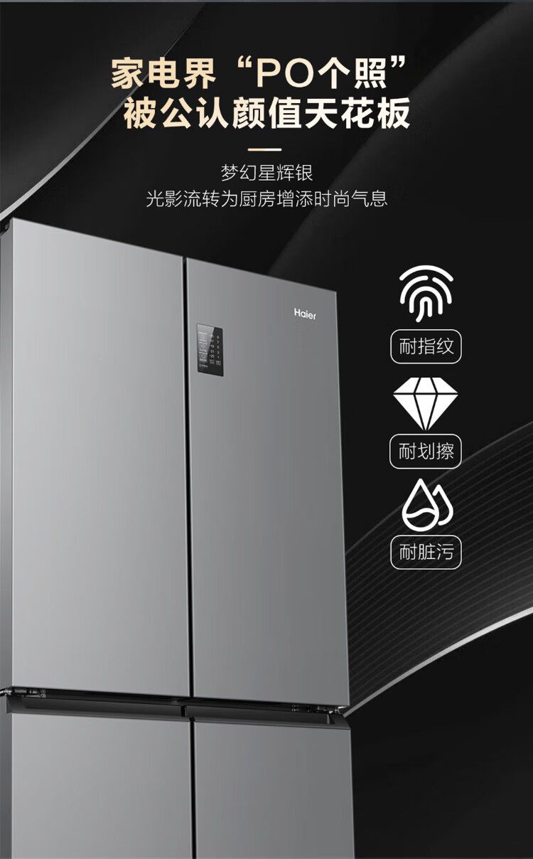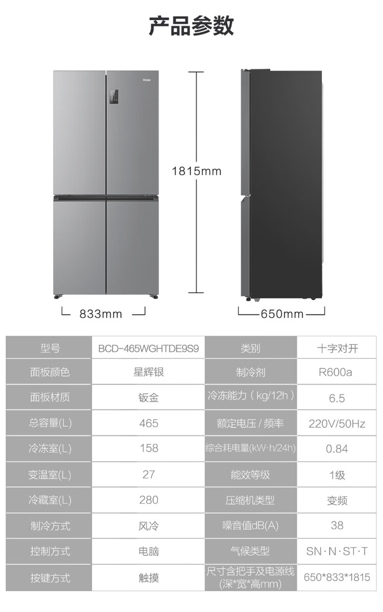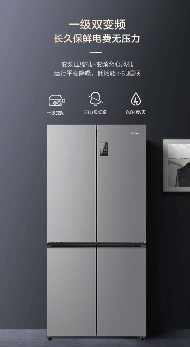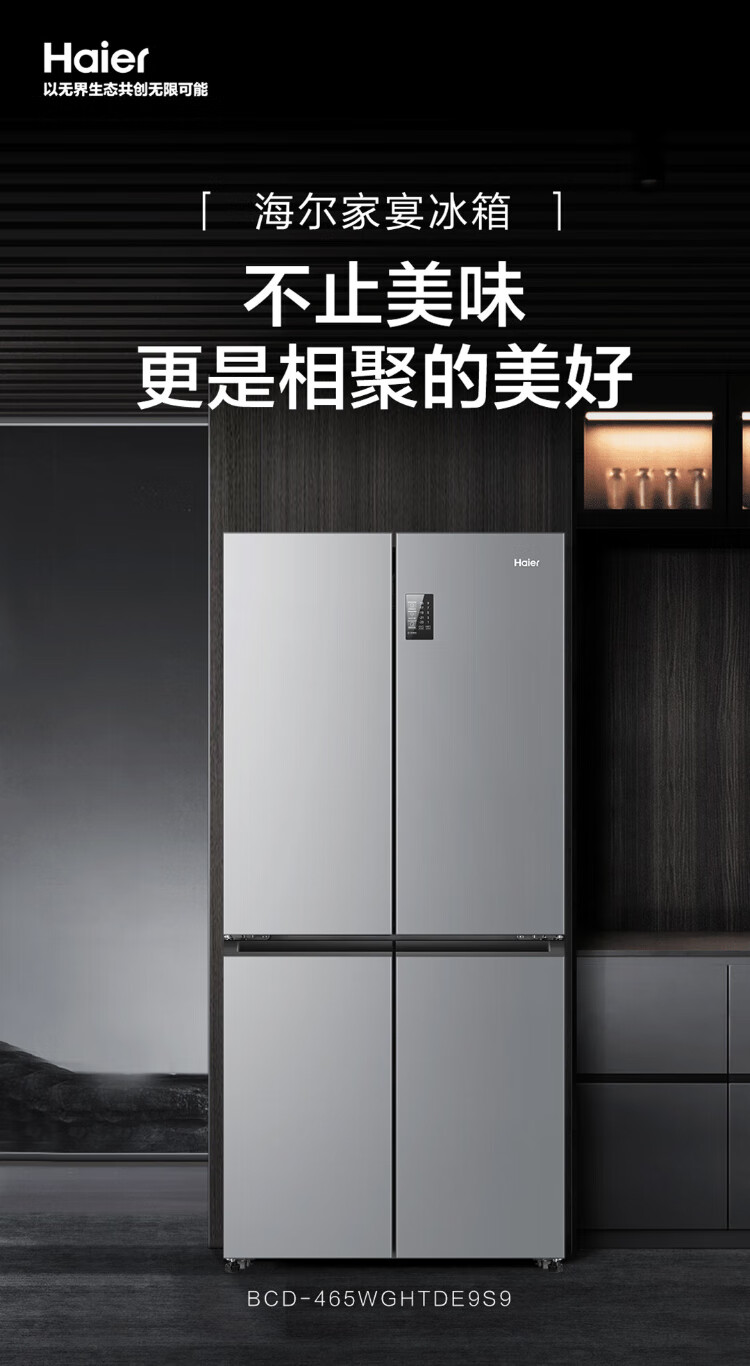 Haier Family Banquet 465 liter cross-fold four-door refrigerator household air-cooled frost-free first-class energy efficiency frequency conversion ultra-thin BCD-465WGHTDE9S9 home appliances national subsidy 20%