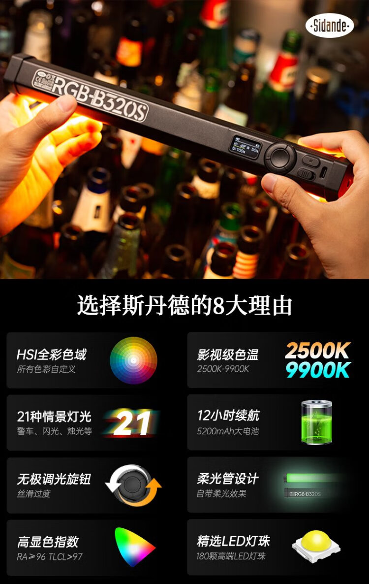 Sidande B320S fill light stick light, handheld fill light shooting special led full-color RGB atmosphere light portable fill light stick photography lighting beauty night scene portrait lamp adjustable color temperature
