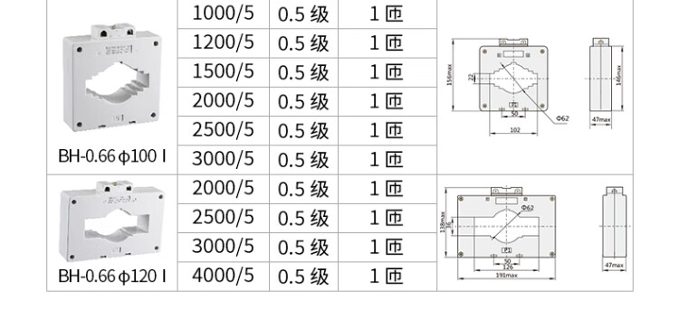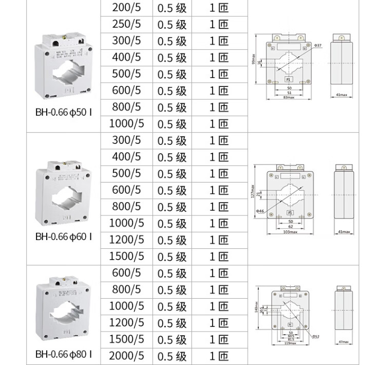 Transformador de corriente tipo Chint (CHNT) BH-0.66I, relación de corriente 400/5A, número de vueltas del núcleo 1 vuelta BH-0.66-50-400/5A-0.5JI