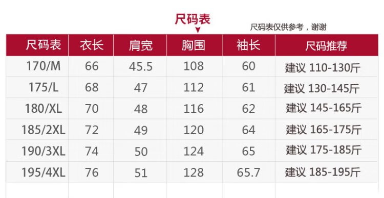 China (cm) 165 / 88-90 170 / 96-98 175 / 108-110 180 / 118-122 185 / 126-130