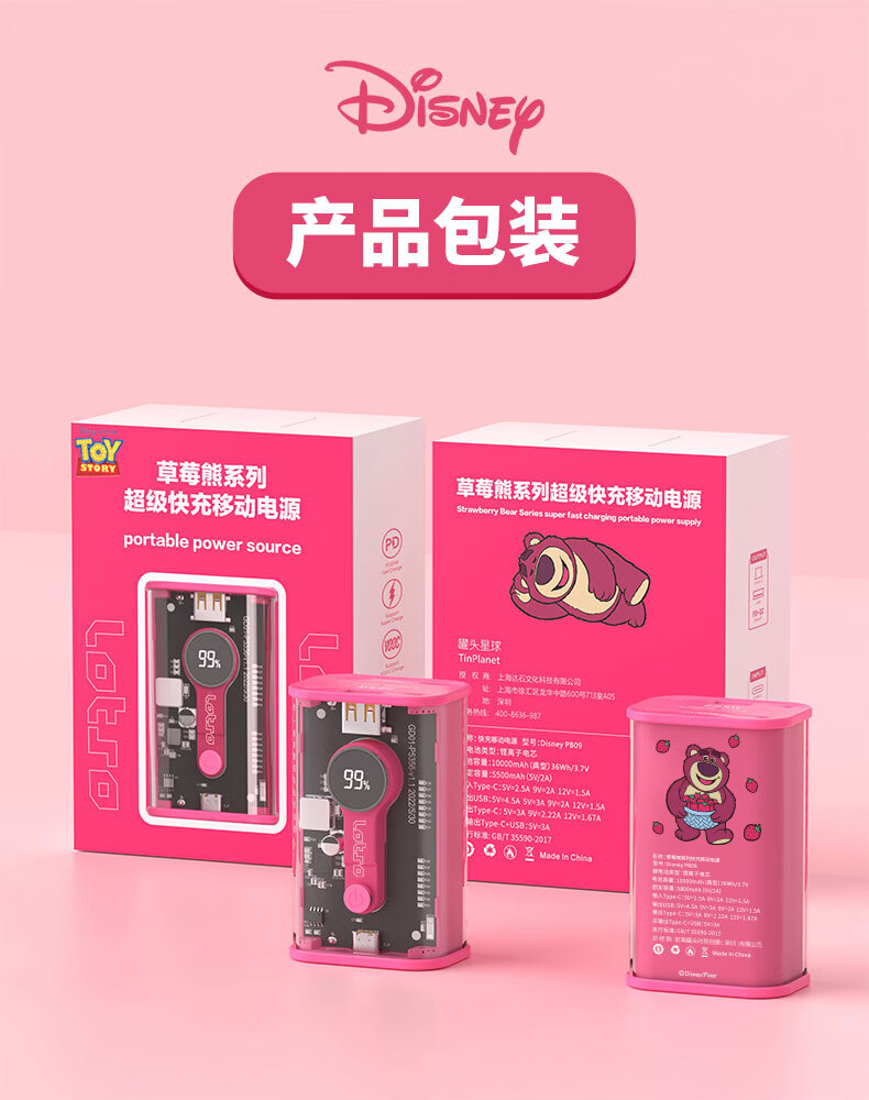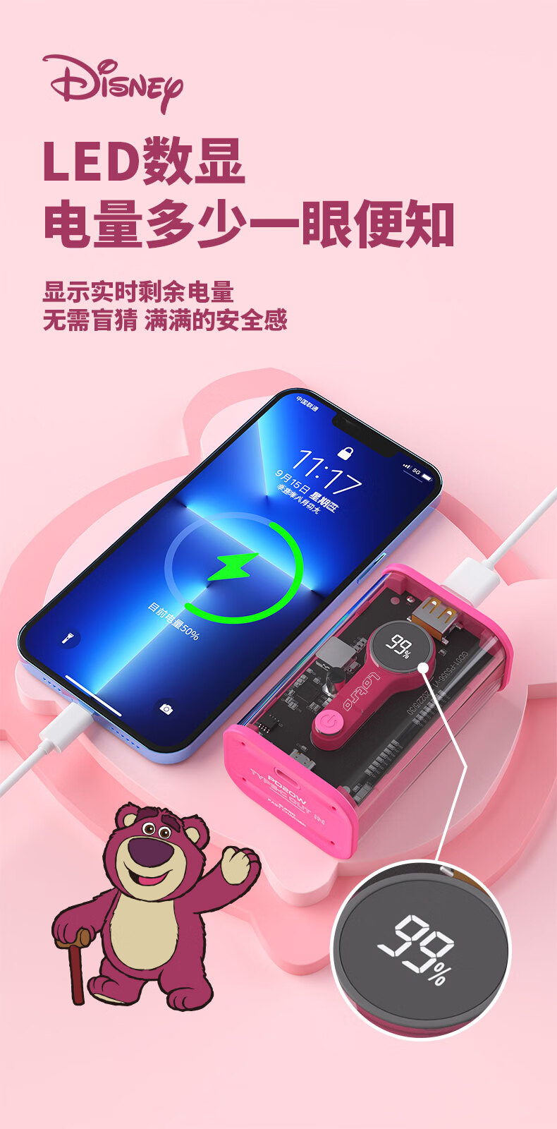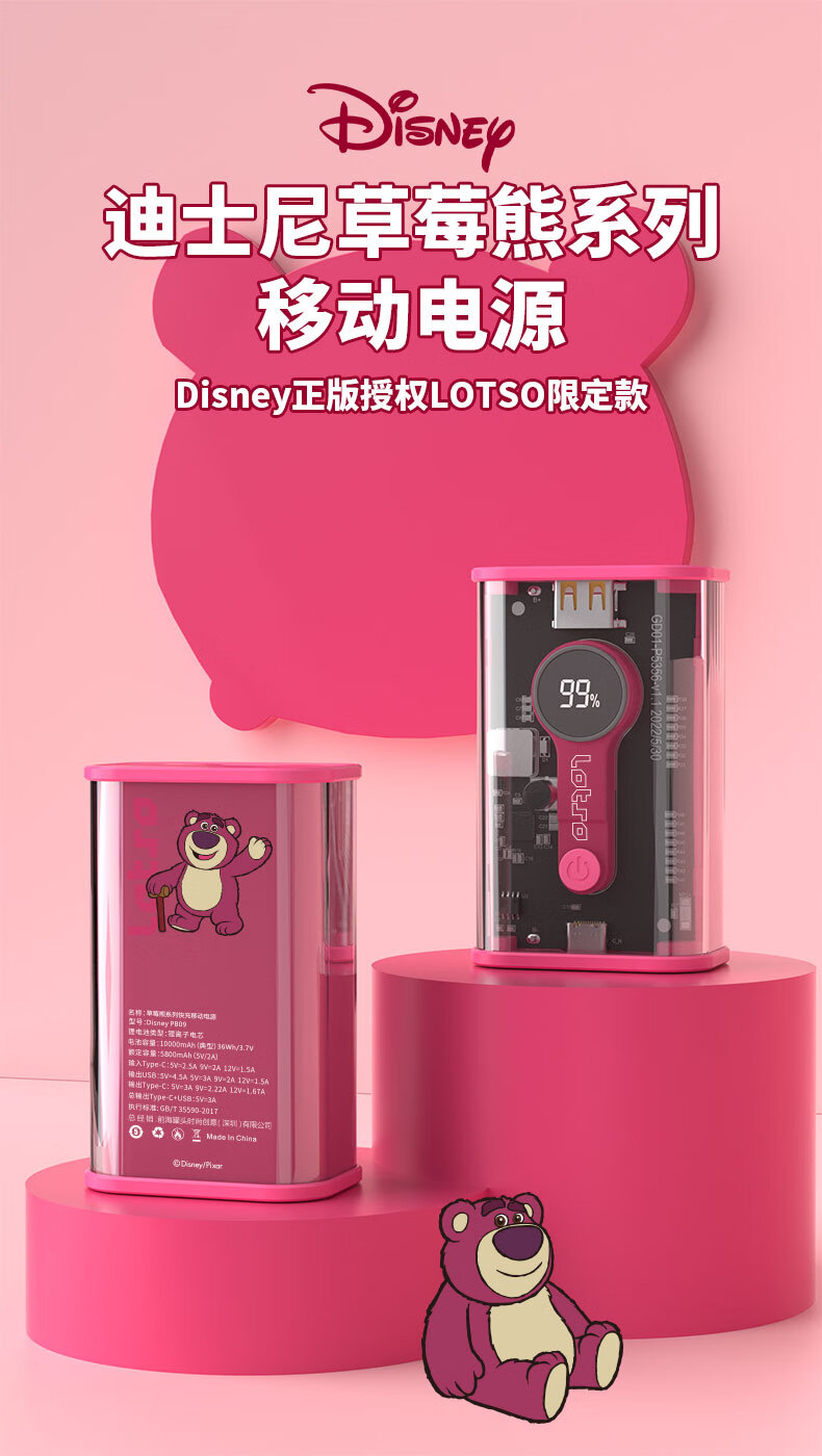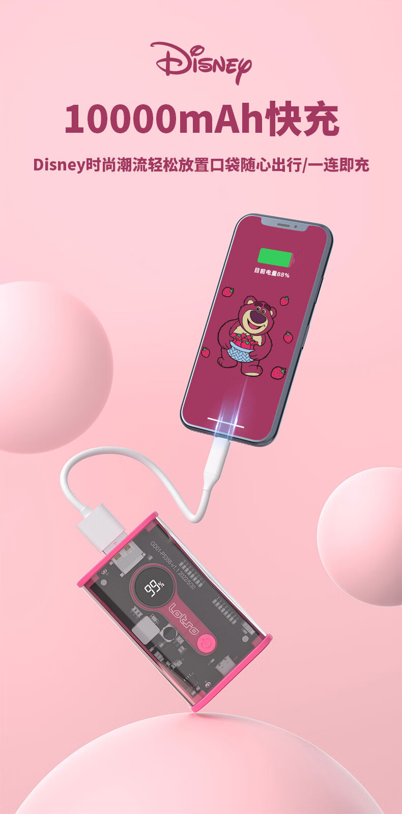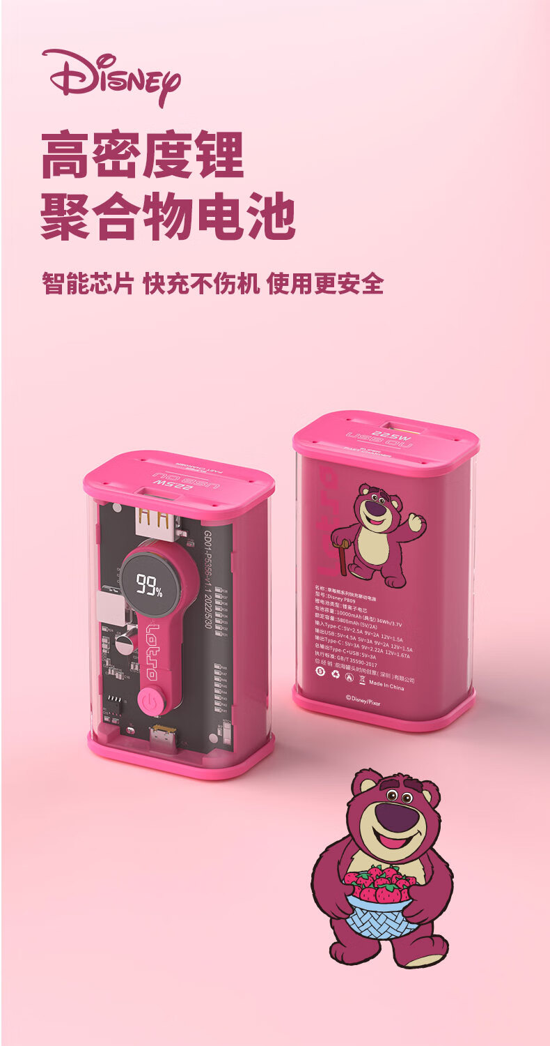 Disney Power Bank 22.5w Flash Charging 10000 mAh Large Capacity Power Bank Portable Outdoor LED Digital Display Power Bank Mobile Phone Universal PB09 Cute Strawberry Bear