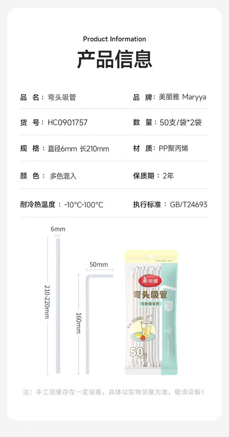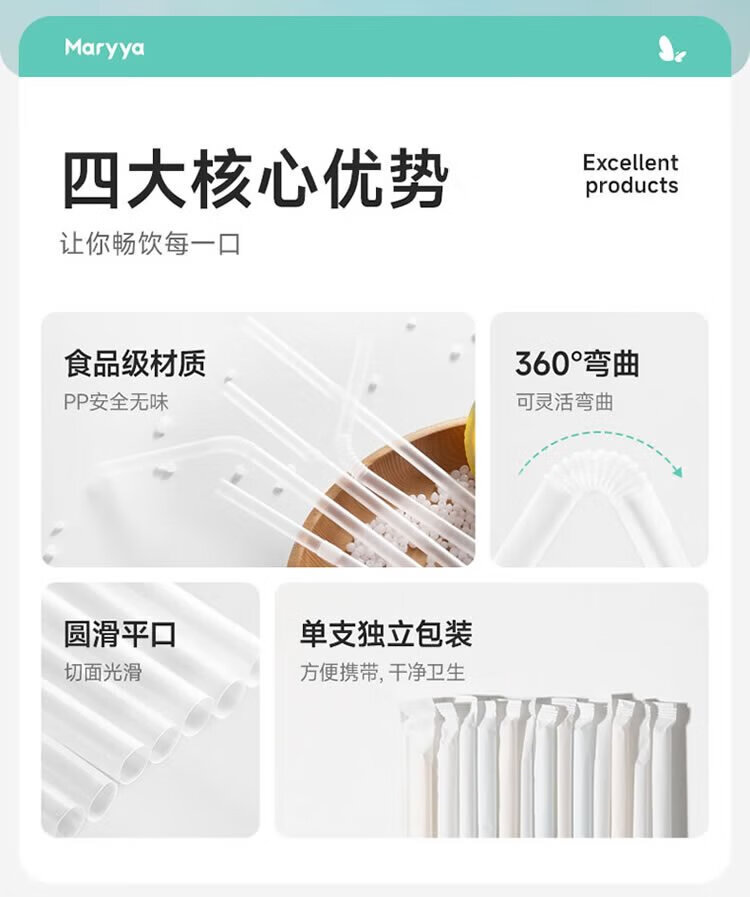 Meiya straws disposable individually packaged 100 pieces milk tea juice yogurt food plastic long hose pregnant women and children
