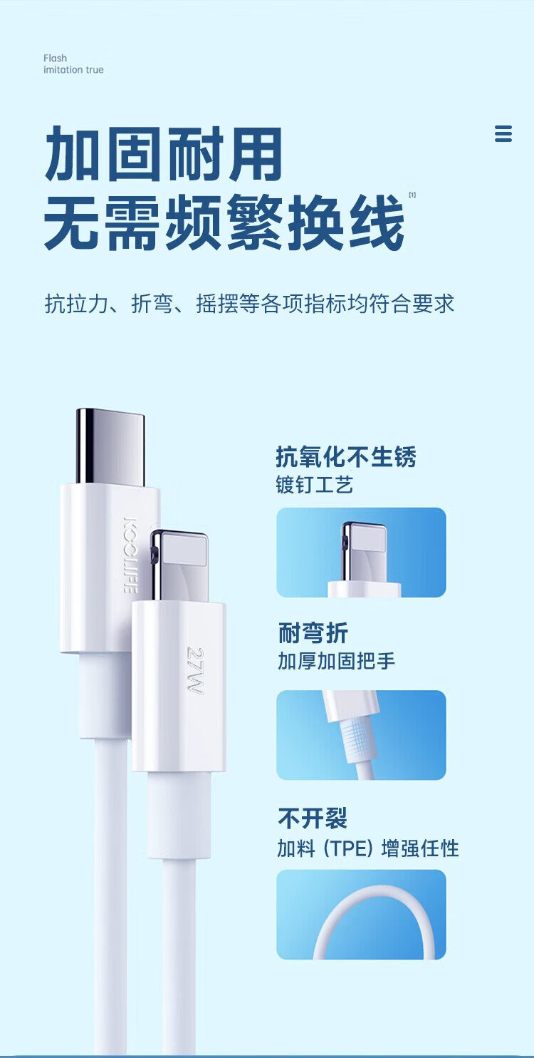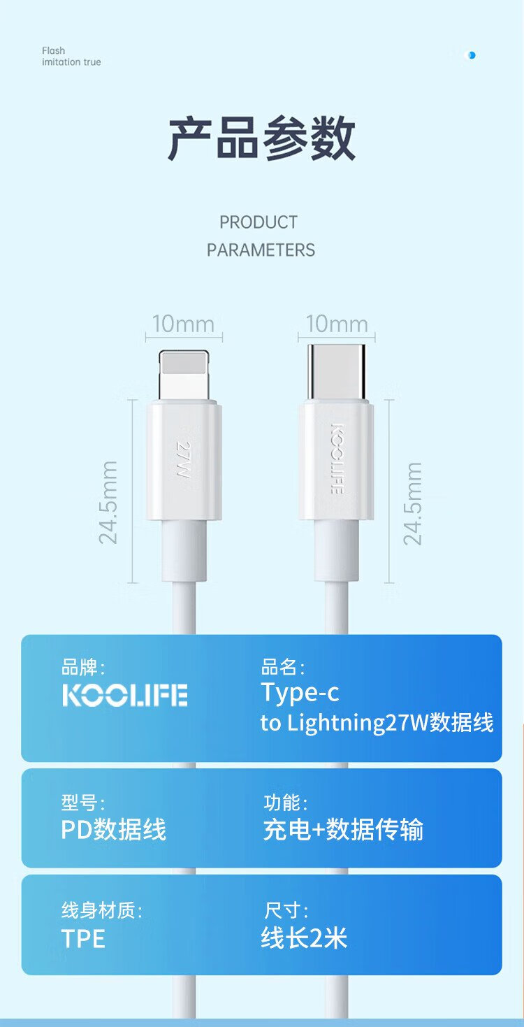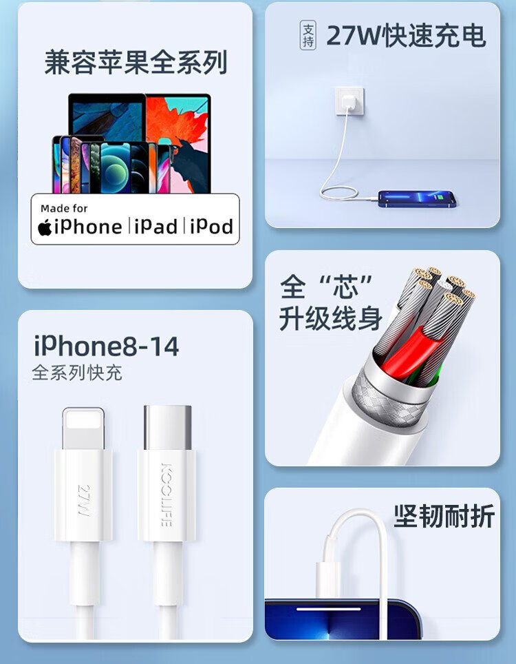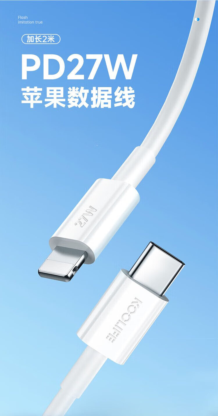 KOOLIFE is suitable for Apple data cable fast charging cable PD27W/20W mobile phone charging cable 2 meters long type-c to lightning universal iPhone14ProMax/13/12/xs