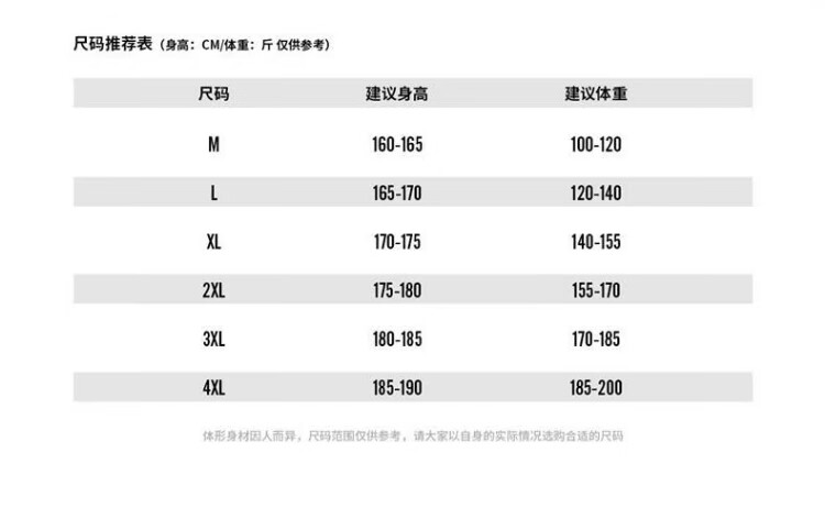 China (cm) 165 / 88-90 170 / 96-98 175 / 108-110 180 / 118-122 185 / 126-130