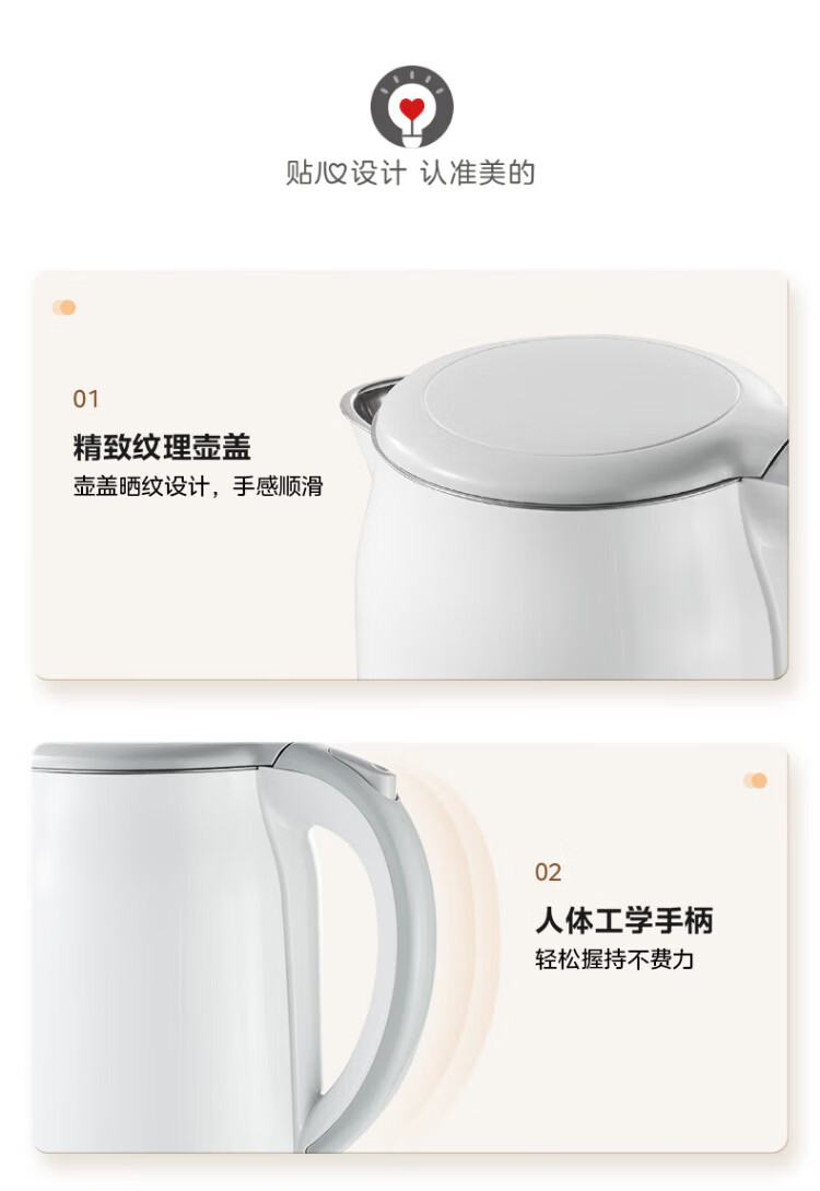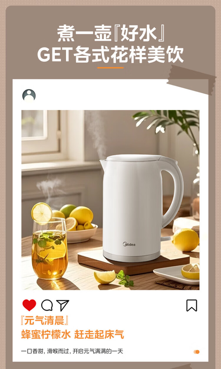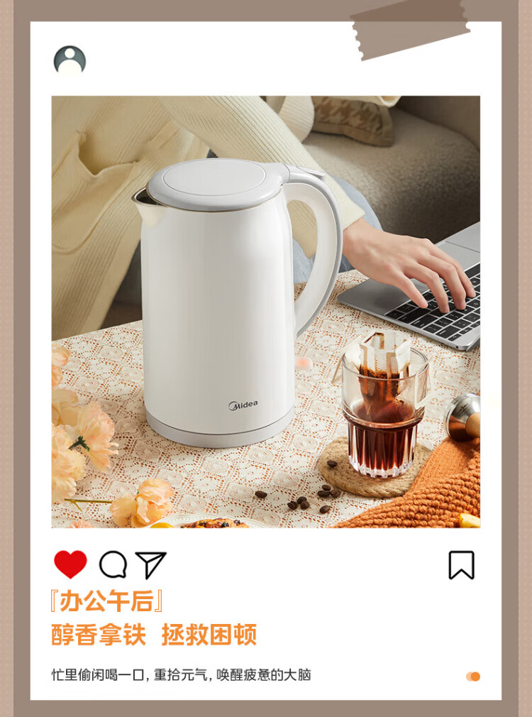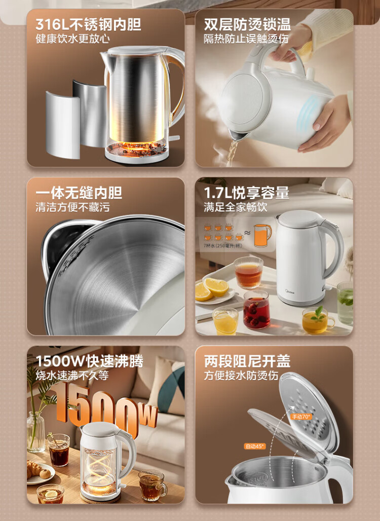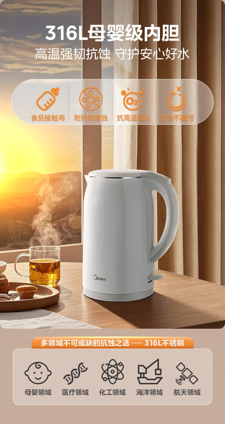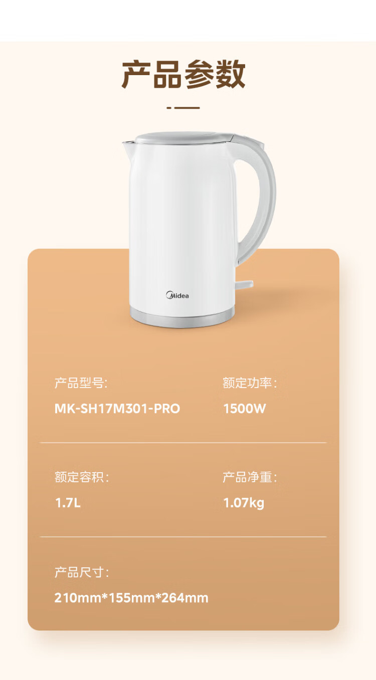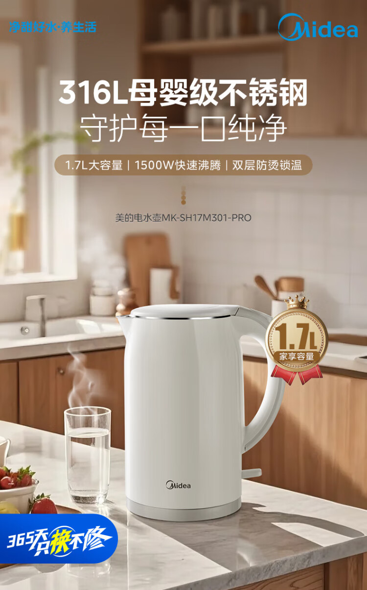 Midea electric kettle food-grade 316L stainless steel double-layer seamless integrated inner tank anti-scalding kettle price guarantee 11.11 1.7L automatic smart power off SH17M301PRO