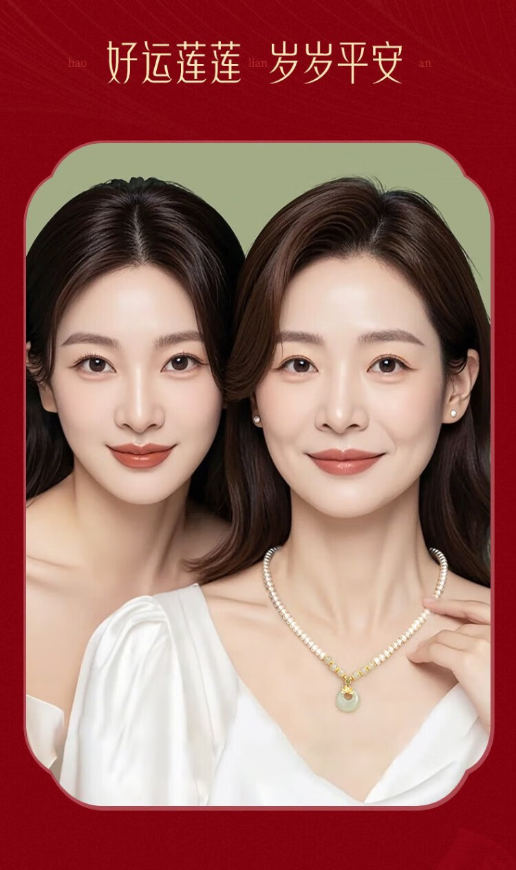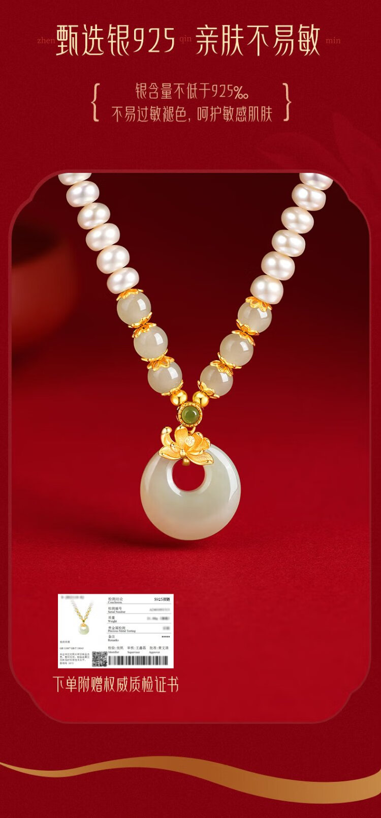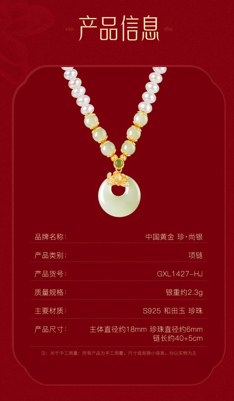 Zhen Shang Silver Chinese Gold Pearl Silver Necklace Women's Peace Button Jade Pendant Mom Mother's Birthday Christmas Gift for Wife
