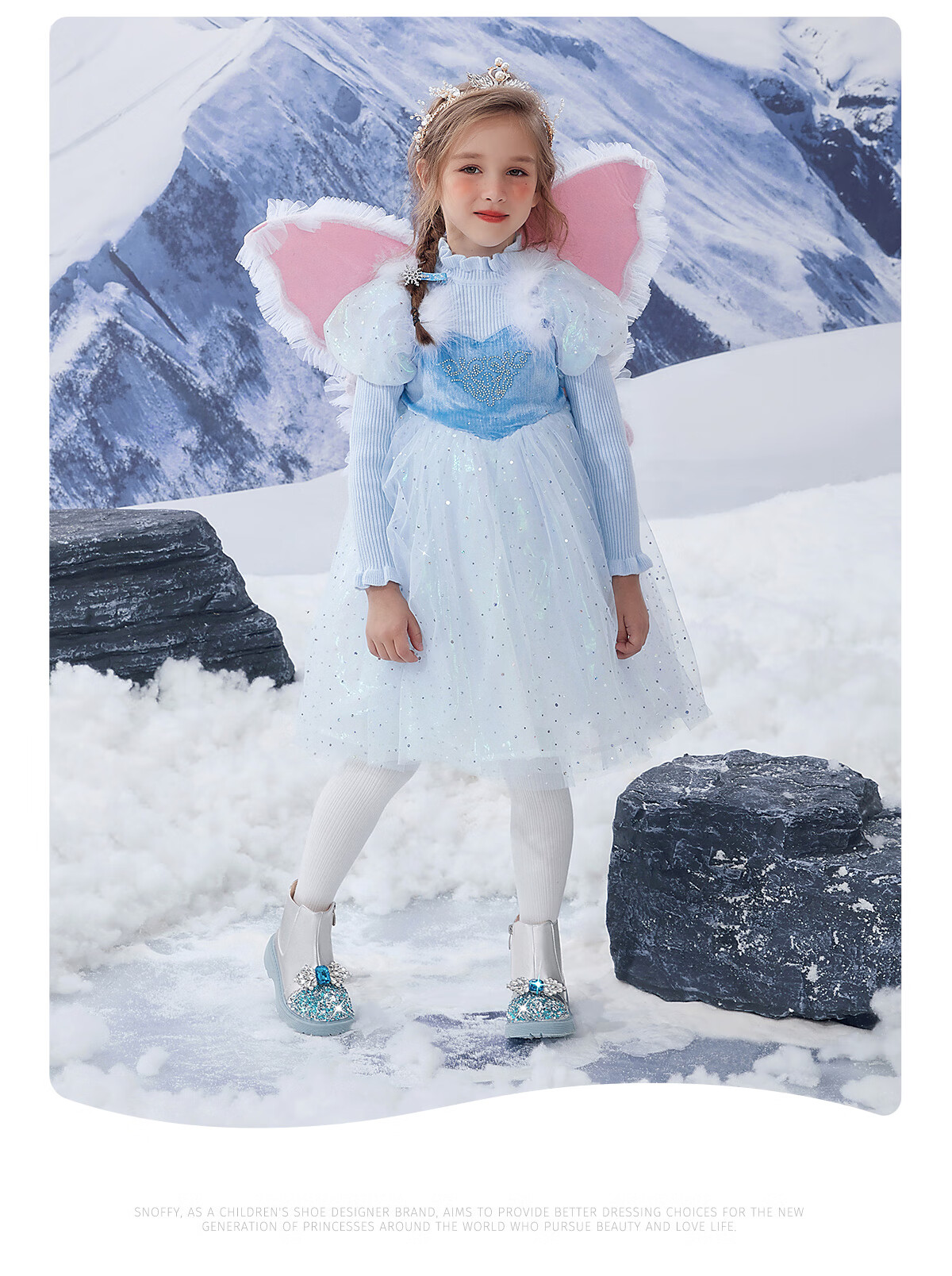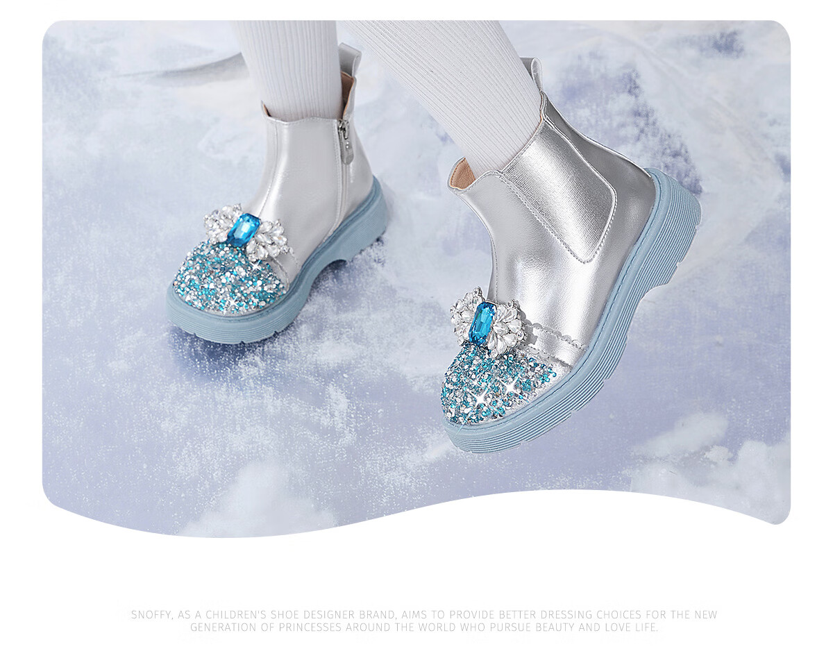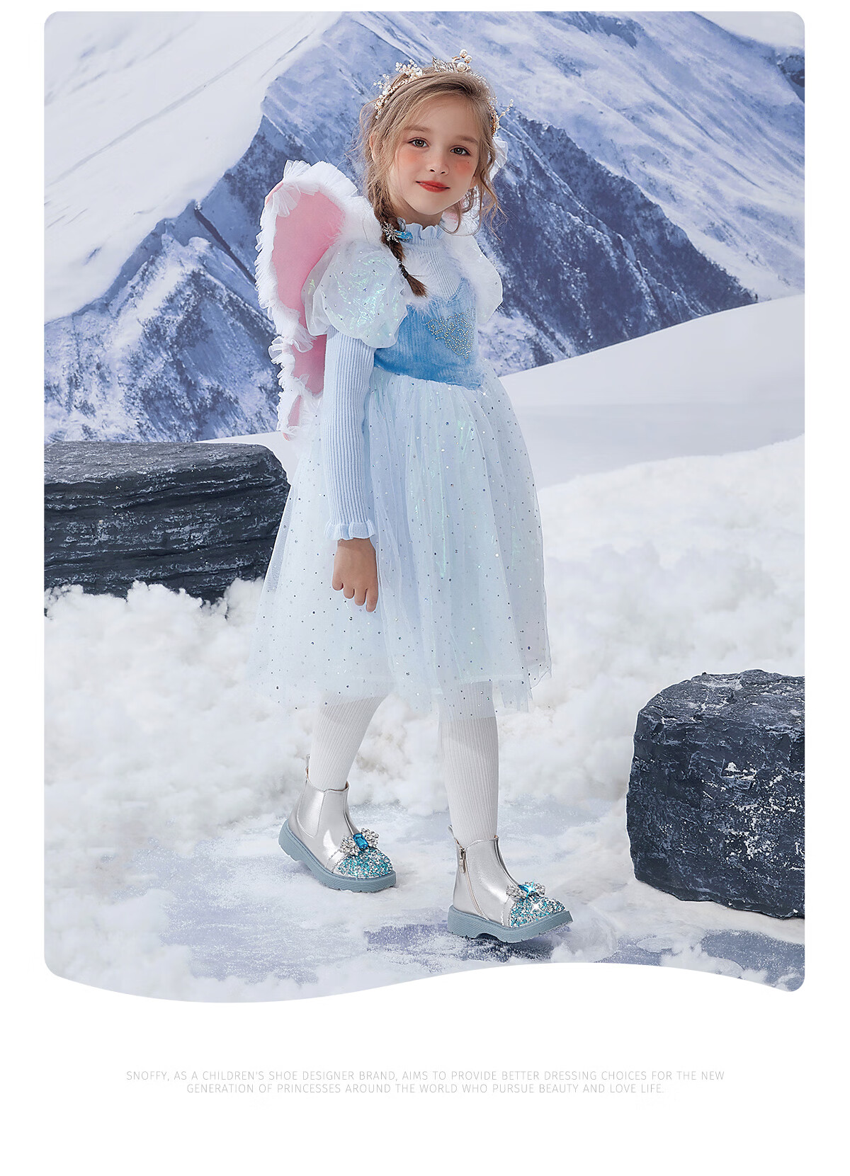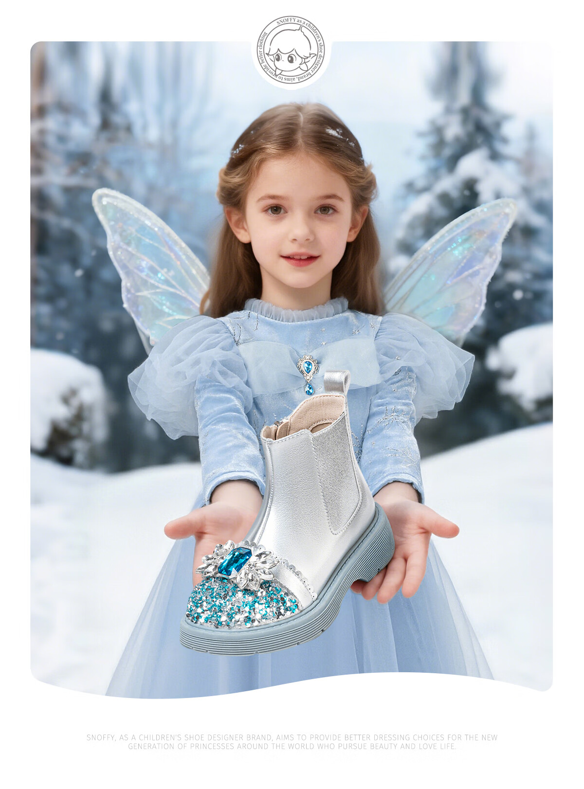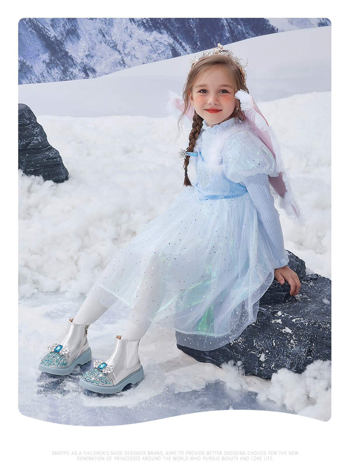 Snuffy Girls' Boots Autumn and Winter Children's Plush Leather Boots Princess Elsa Warm Short Leather Boots Ice Blue 29