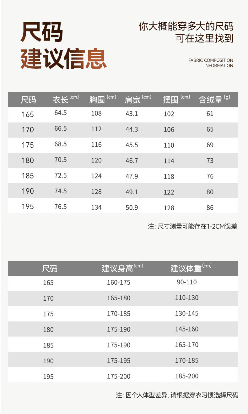 China (cm) 165 / 88-90 170 / 96-98 175 / 108-110 180 / 118-122 185 / 126-130