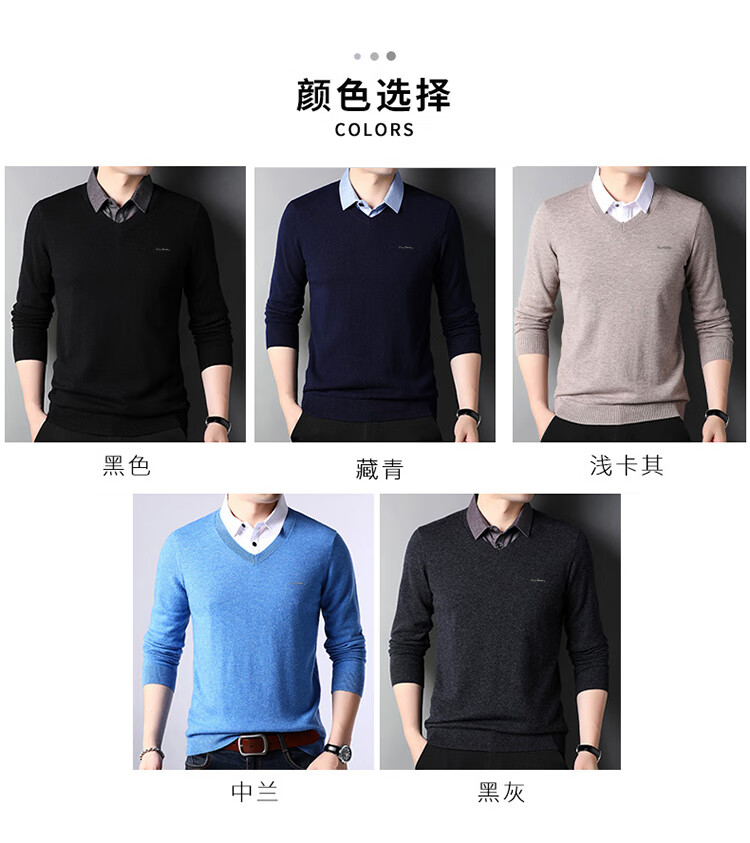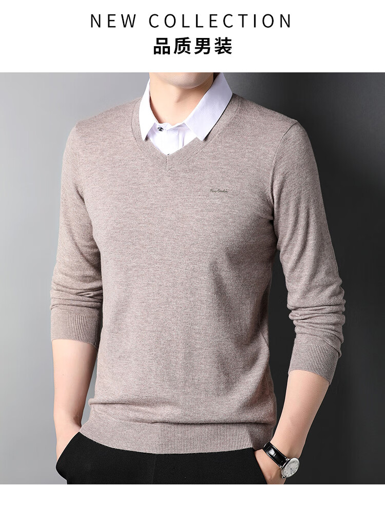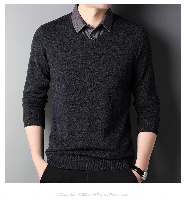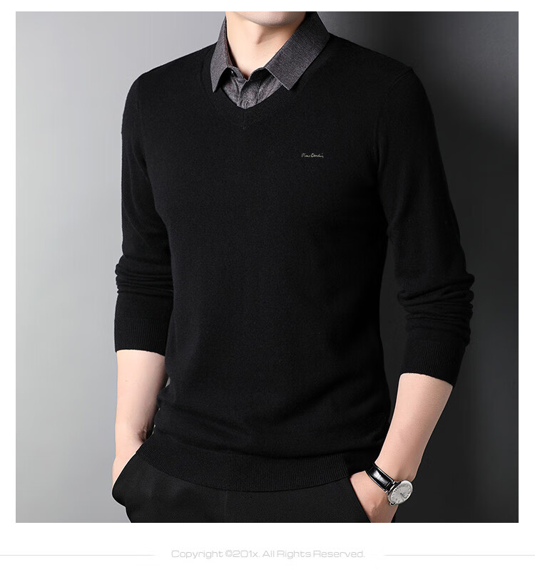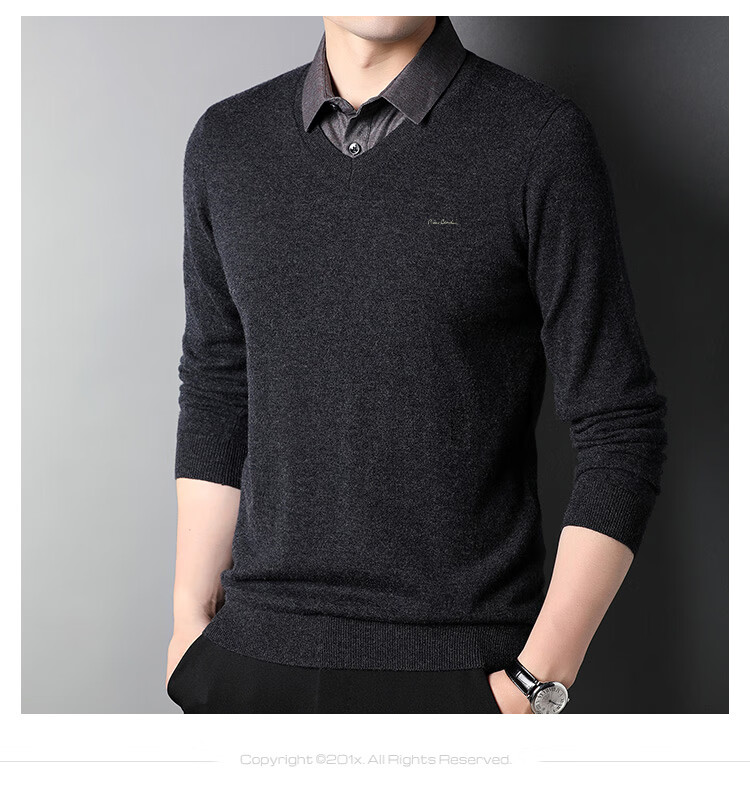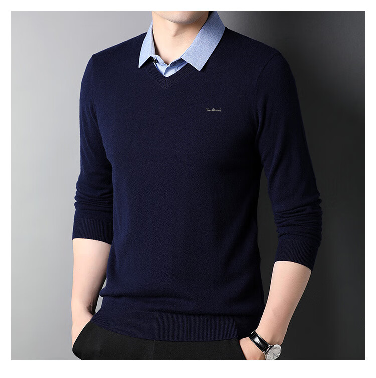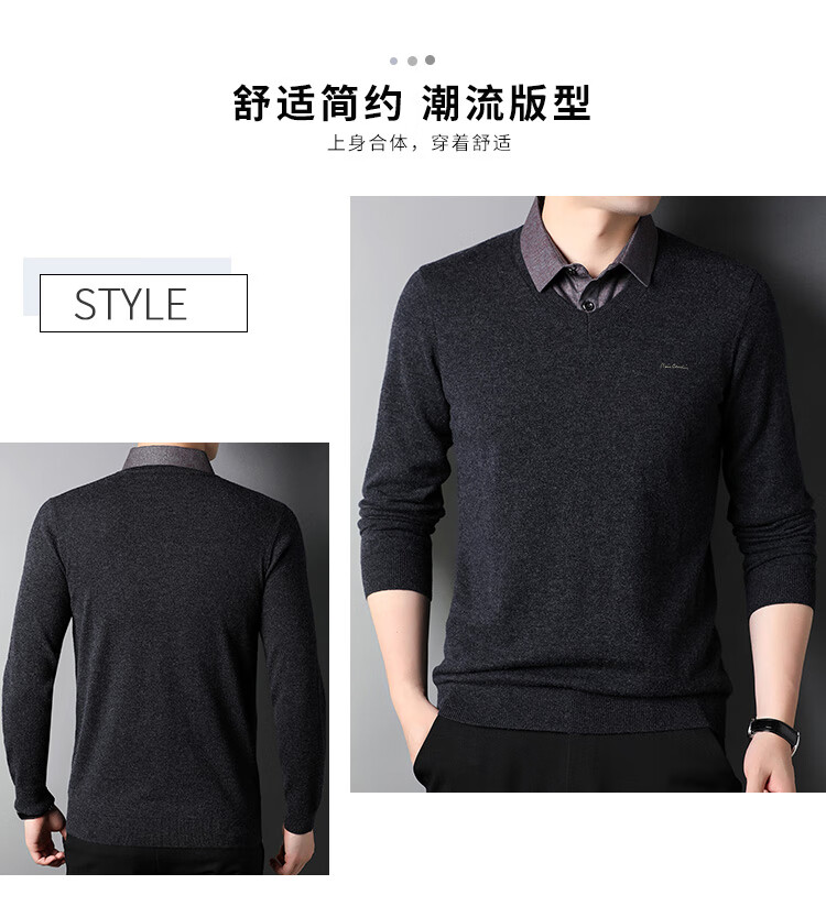 皮尔卡丹纯羊毛衫男士衬衫领假两件针织衫秋冬季100%羊毛线衣中年保暖毛衣