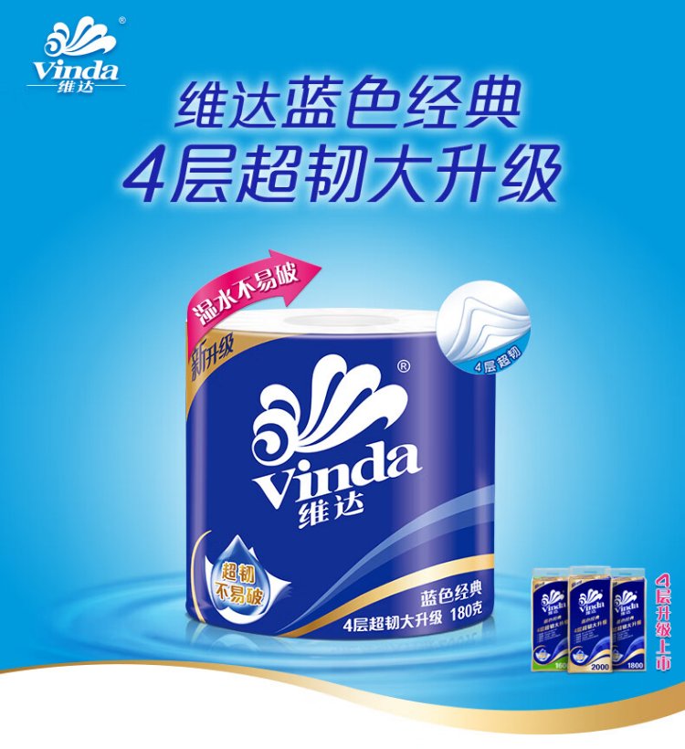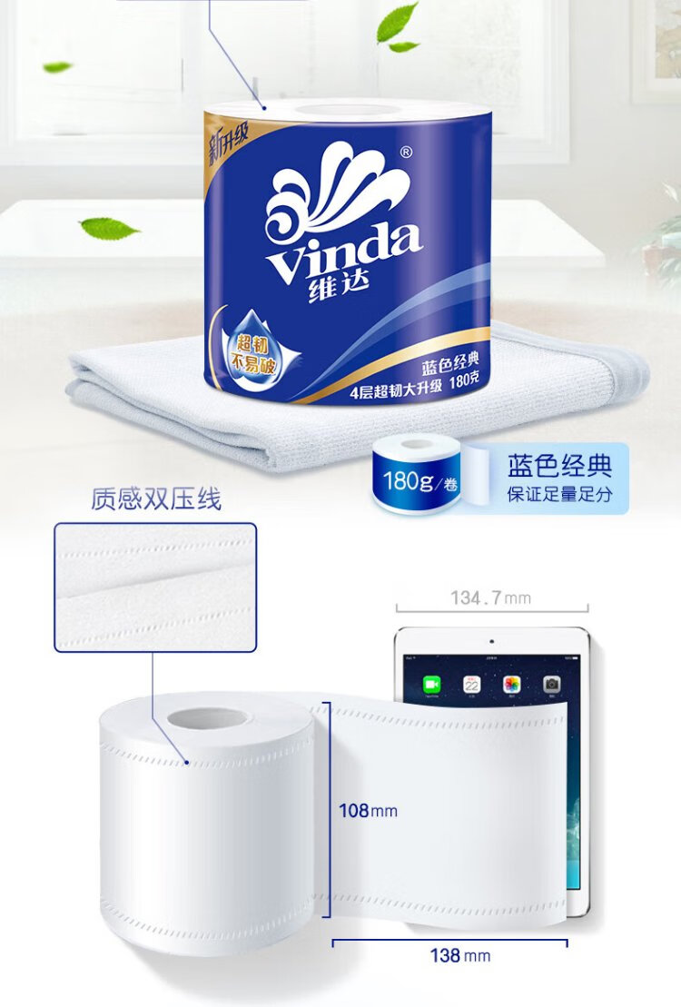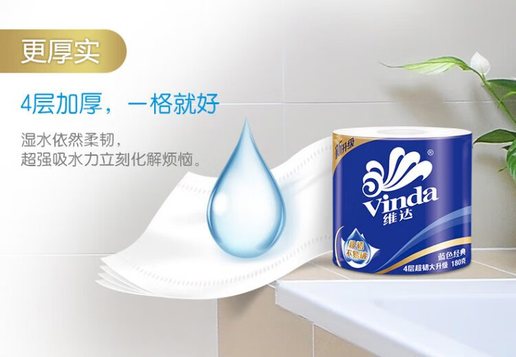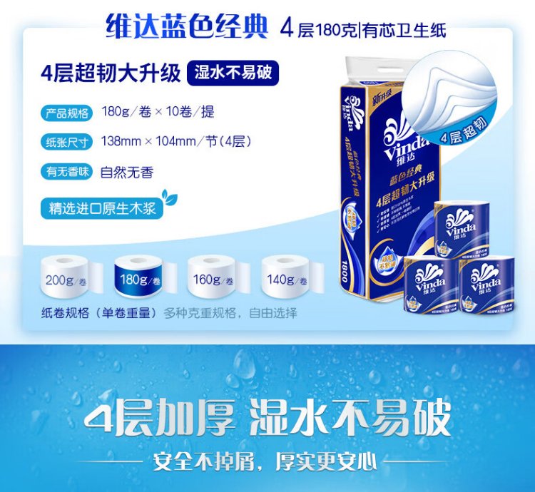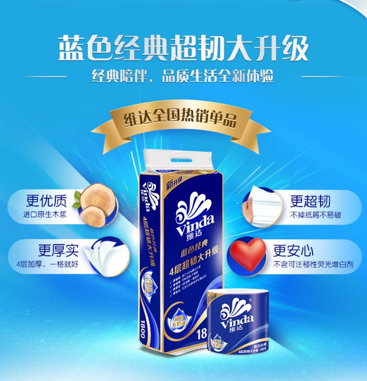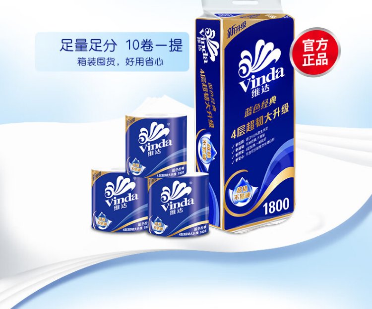 Vinda roll toilet paper blue classic 4 layers 1800g core roll toilet paper family affordable pack 1 pack 10 rolls AV4028-1