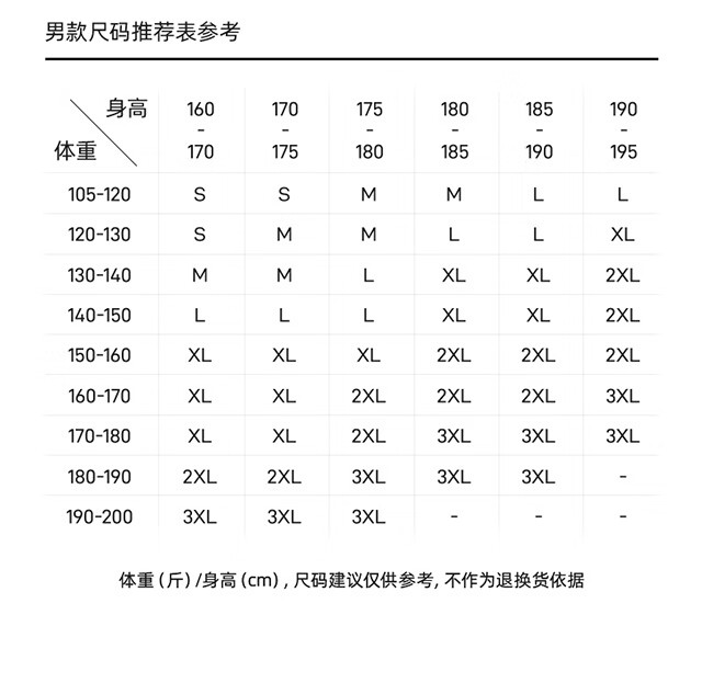China (cm) 165 / 88-90 170 / 96-98 175 / 108-110 180 / 118-122 185 / 126-130