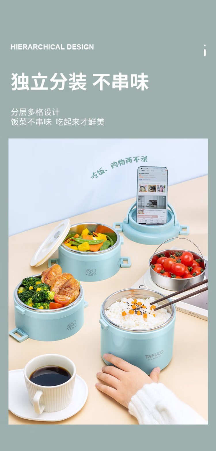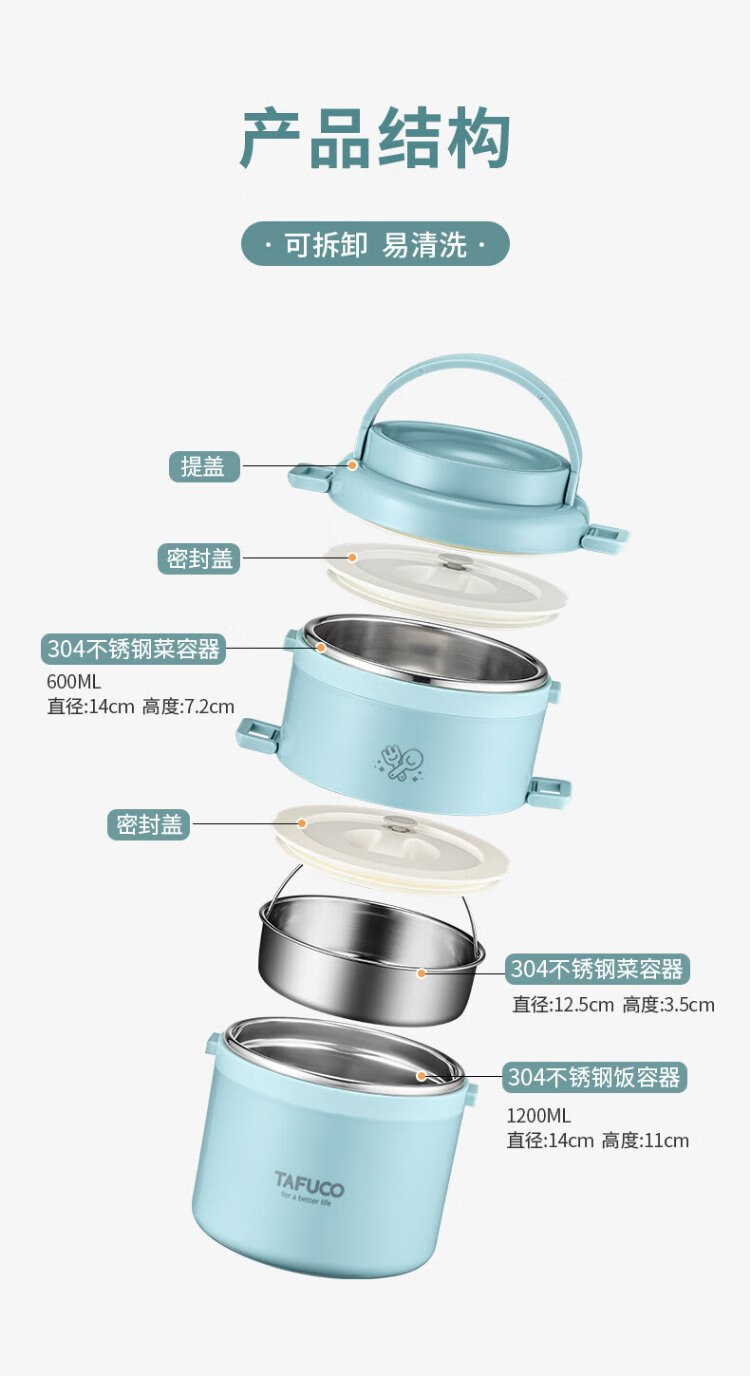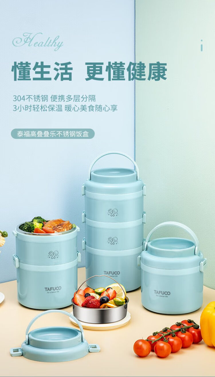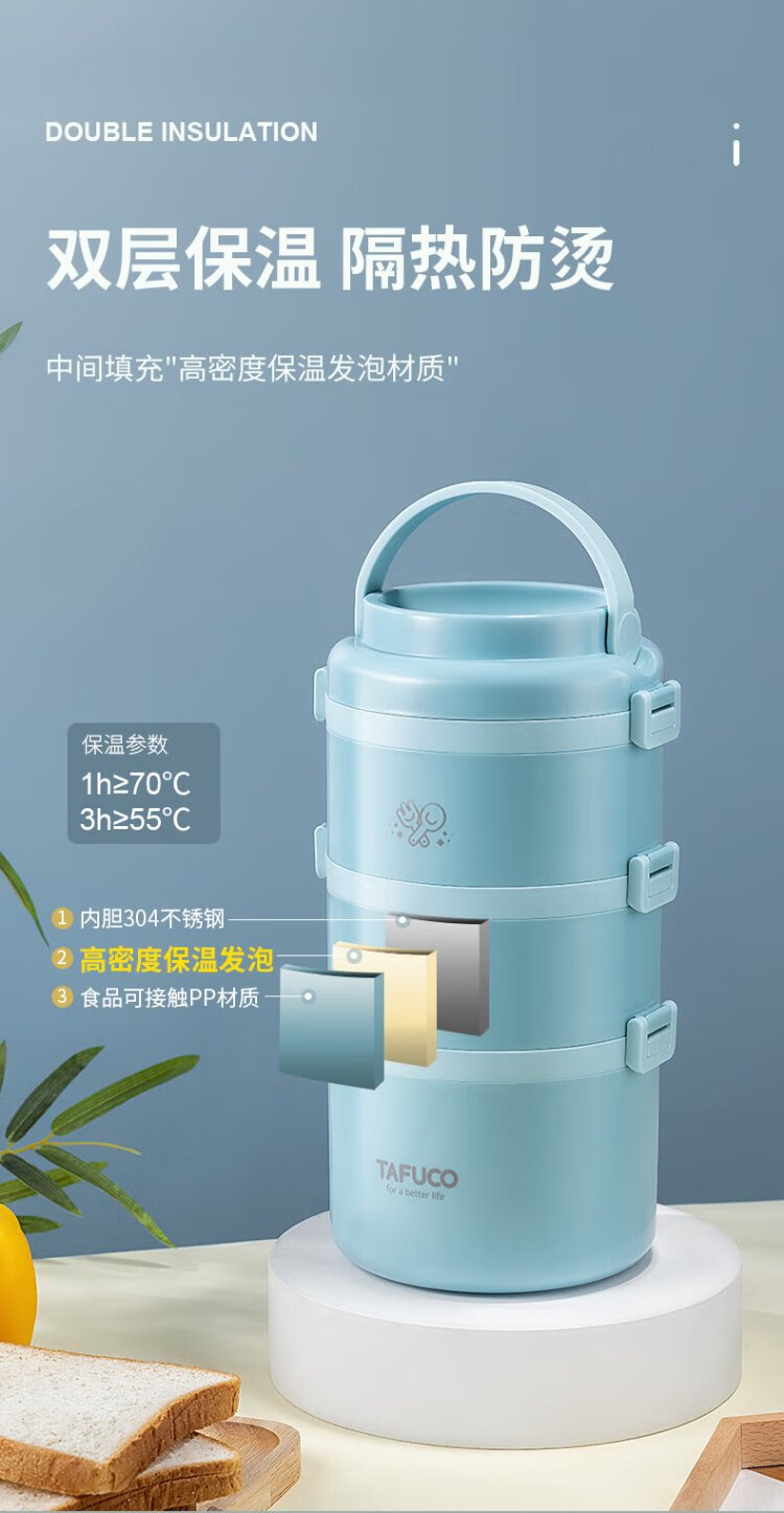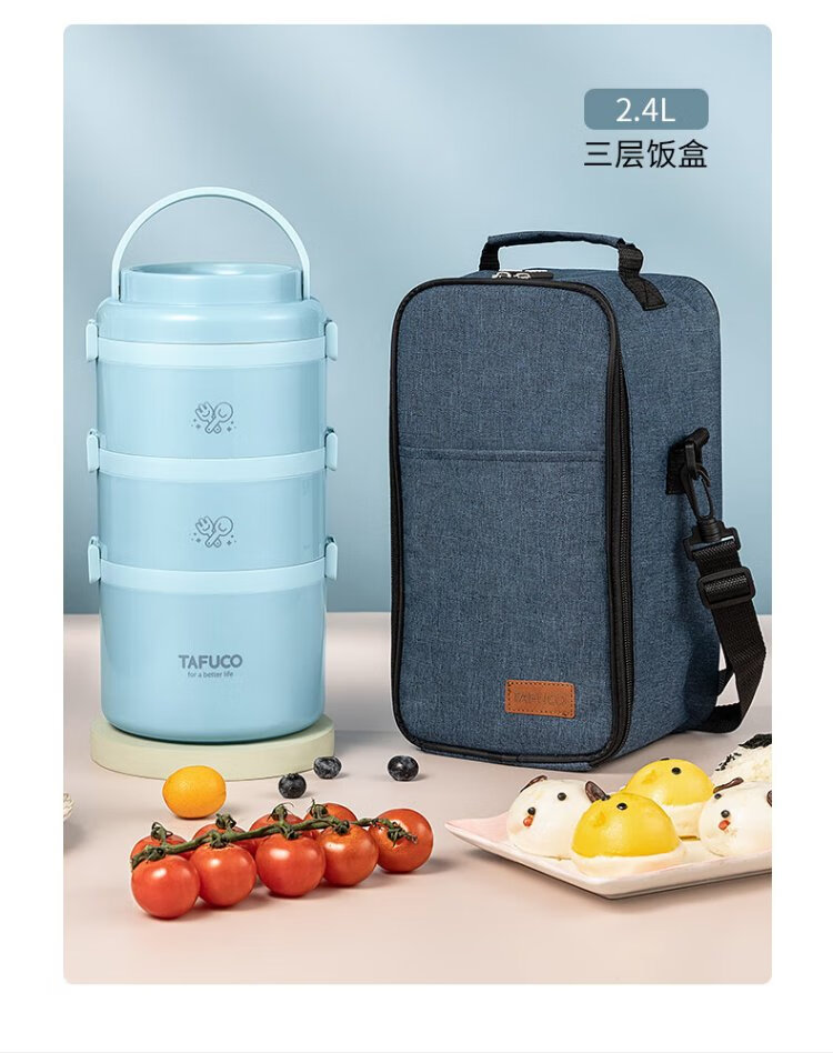 TAFUCO student lunch box 304 stainless steel work divider large capacity three-layer dinner plate 2.4L-Tianhu Blue-T5349