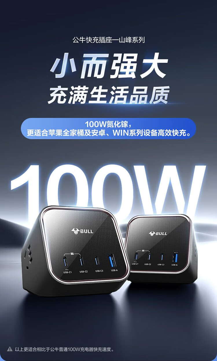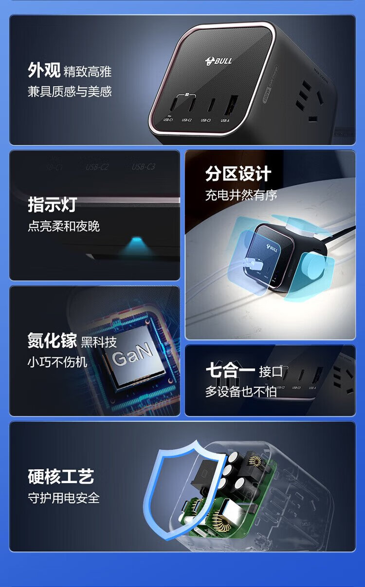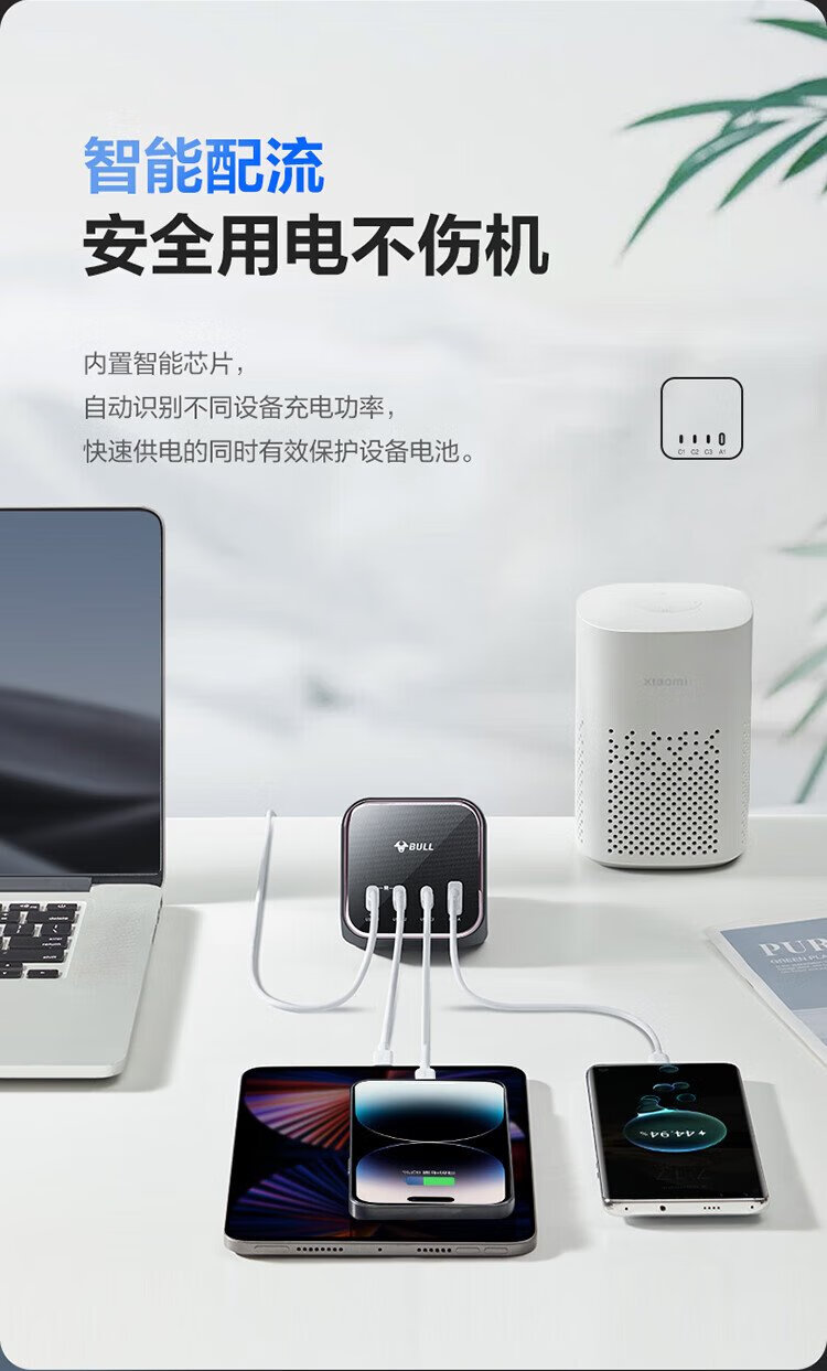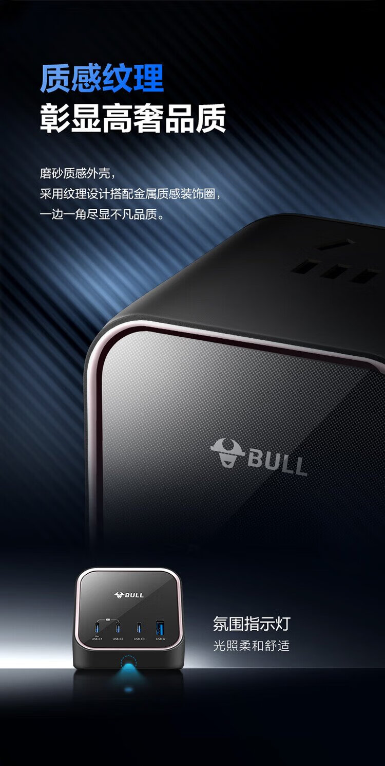 BULL gallium nitride 100W fast charging laptop socket/desktop charging station socket/plug board/socket strip 3C certification suitable for iphone17 master control switch 3C1A+3 jacks