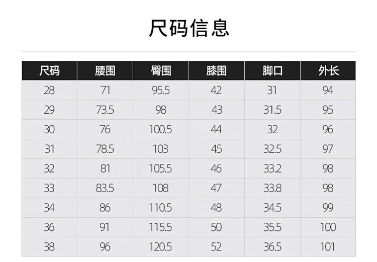 Outseam (cm) 99 cm 101.5 cm 104 cm 106.5 cm 109 cm