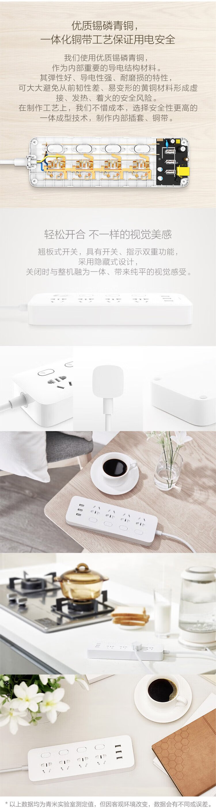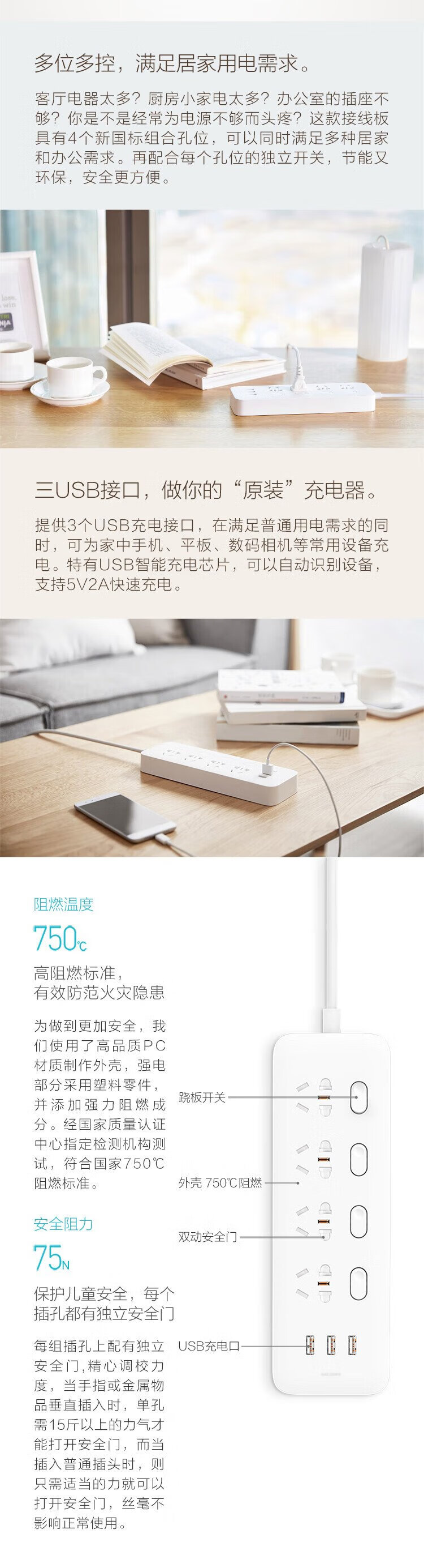 Xiaomi (MI) Mijia four-position four-control power strip/USB socket/socket strip/socket strip/plug strip/plug strip/terminal strip 3USB interface 2A fast charge independent control total length 1.8 meters