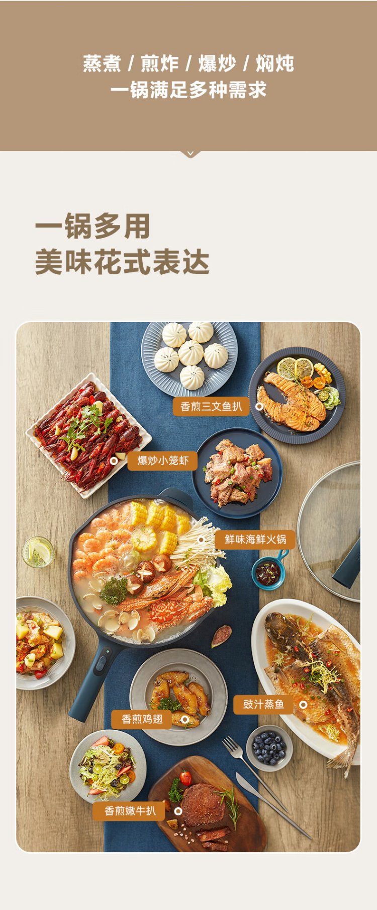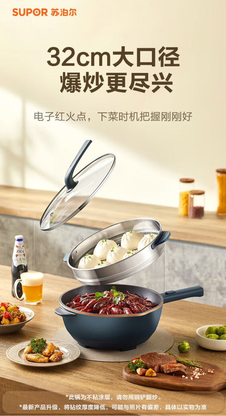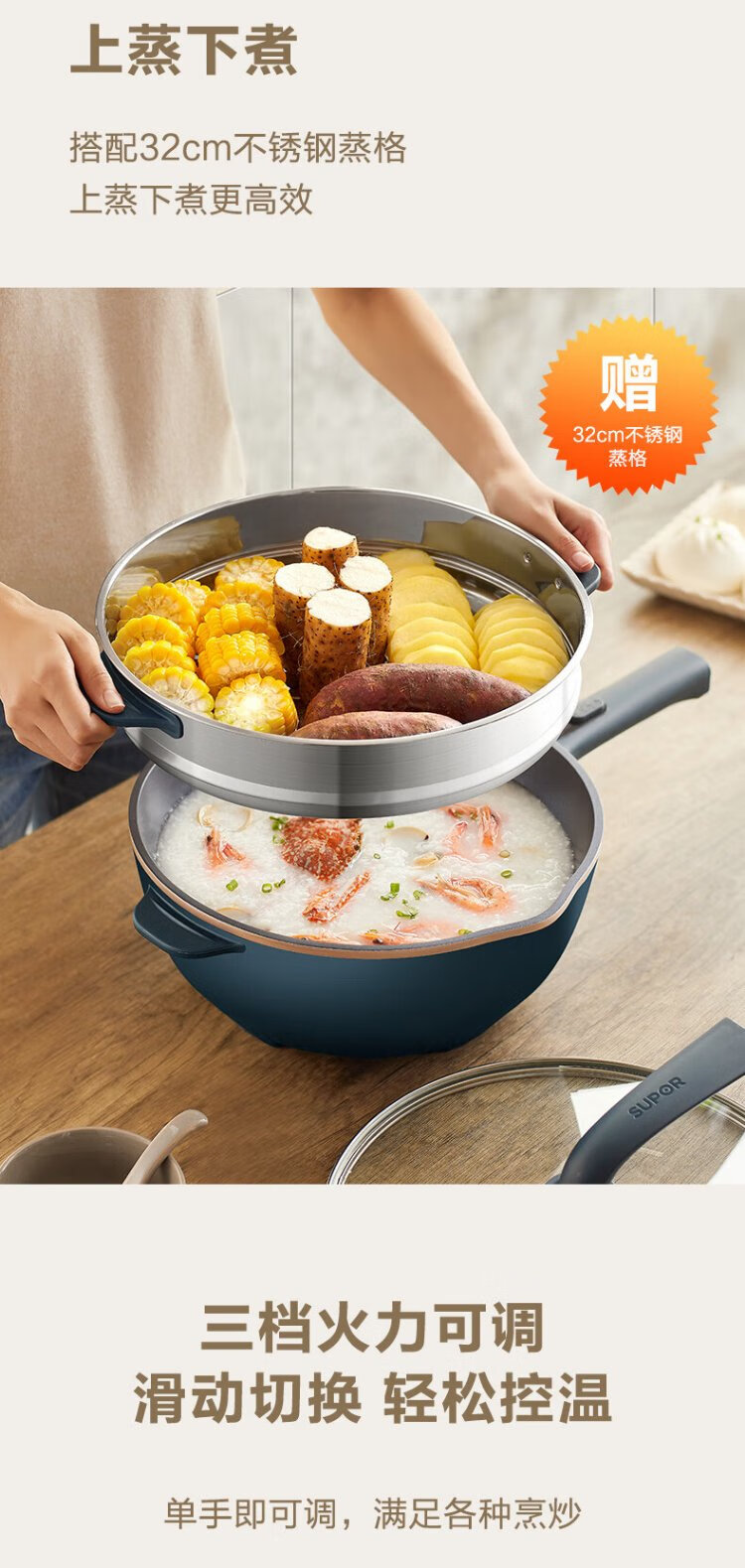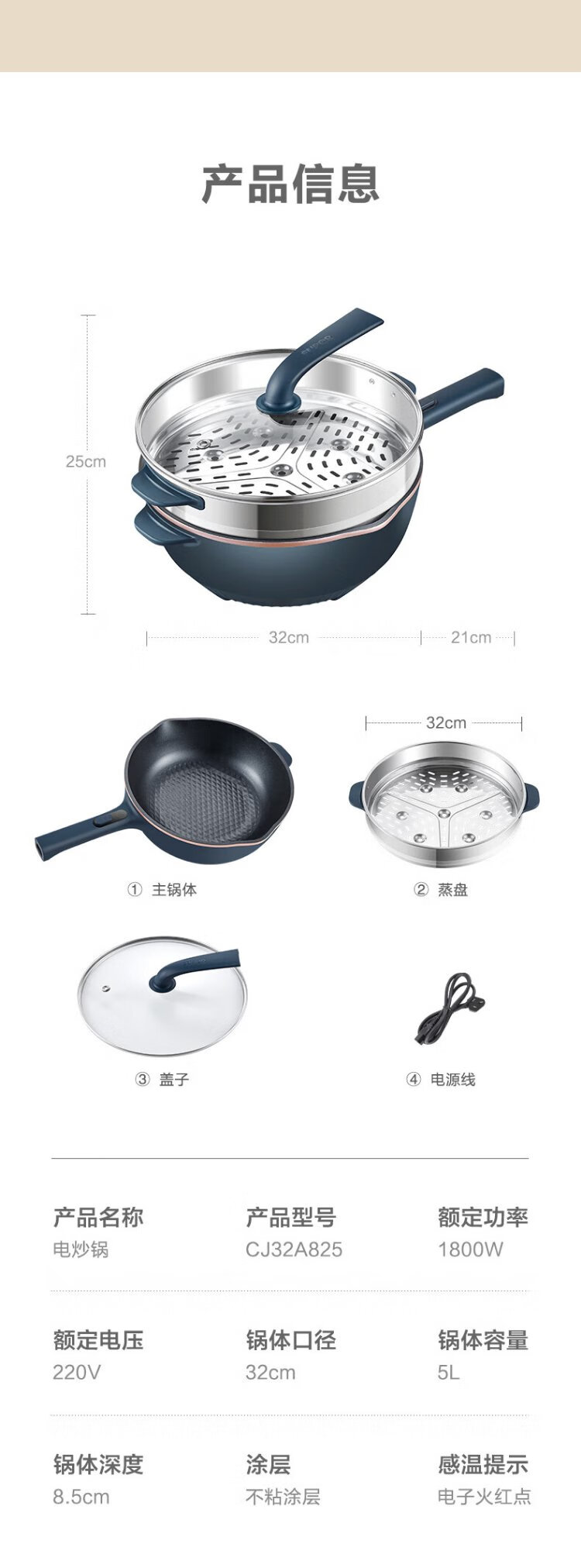 SUPOR electric wok, electric hot pot, electric cooking pot, electric steamer, household multi-function, steaming and cooking, smart red dot, non-stick multi-purpose pot CJ32A825-220 with steamer